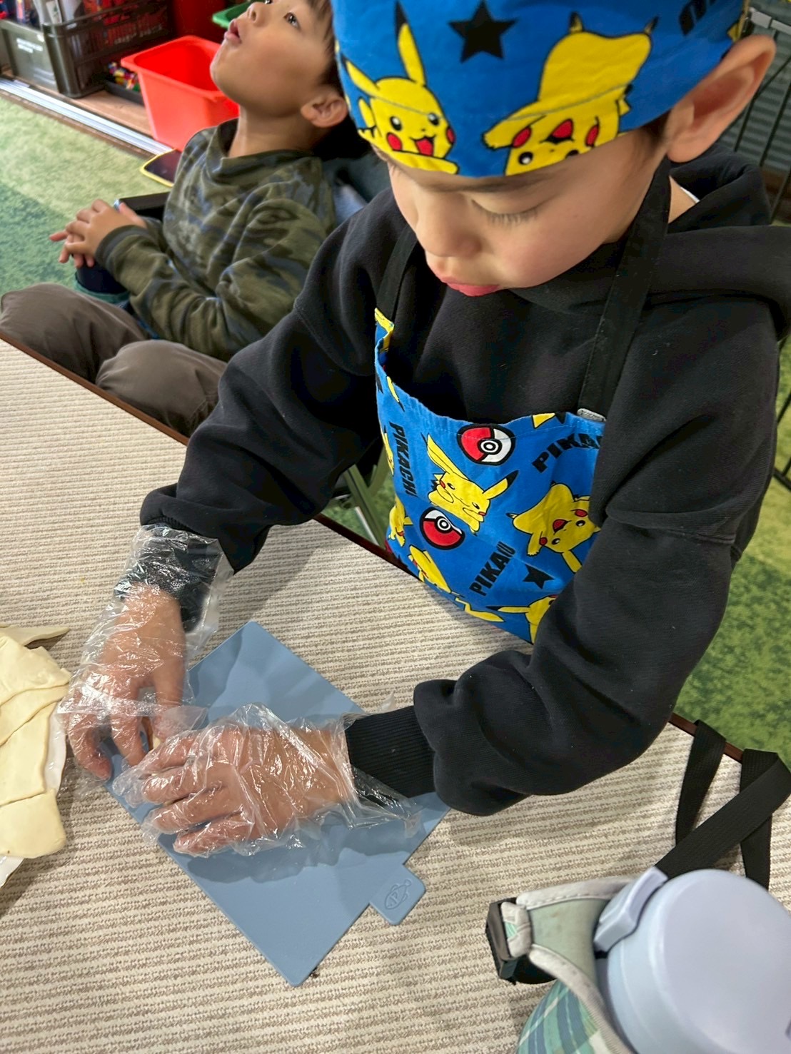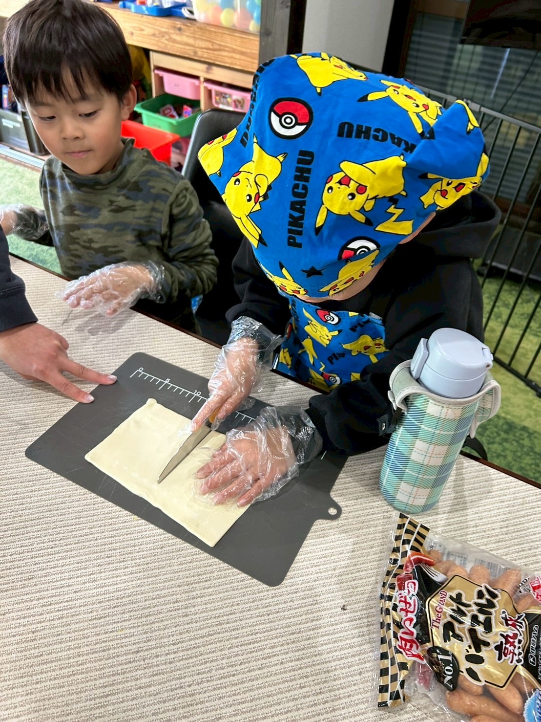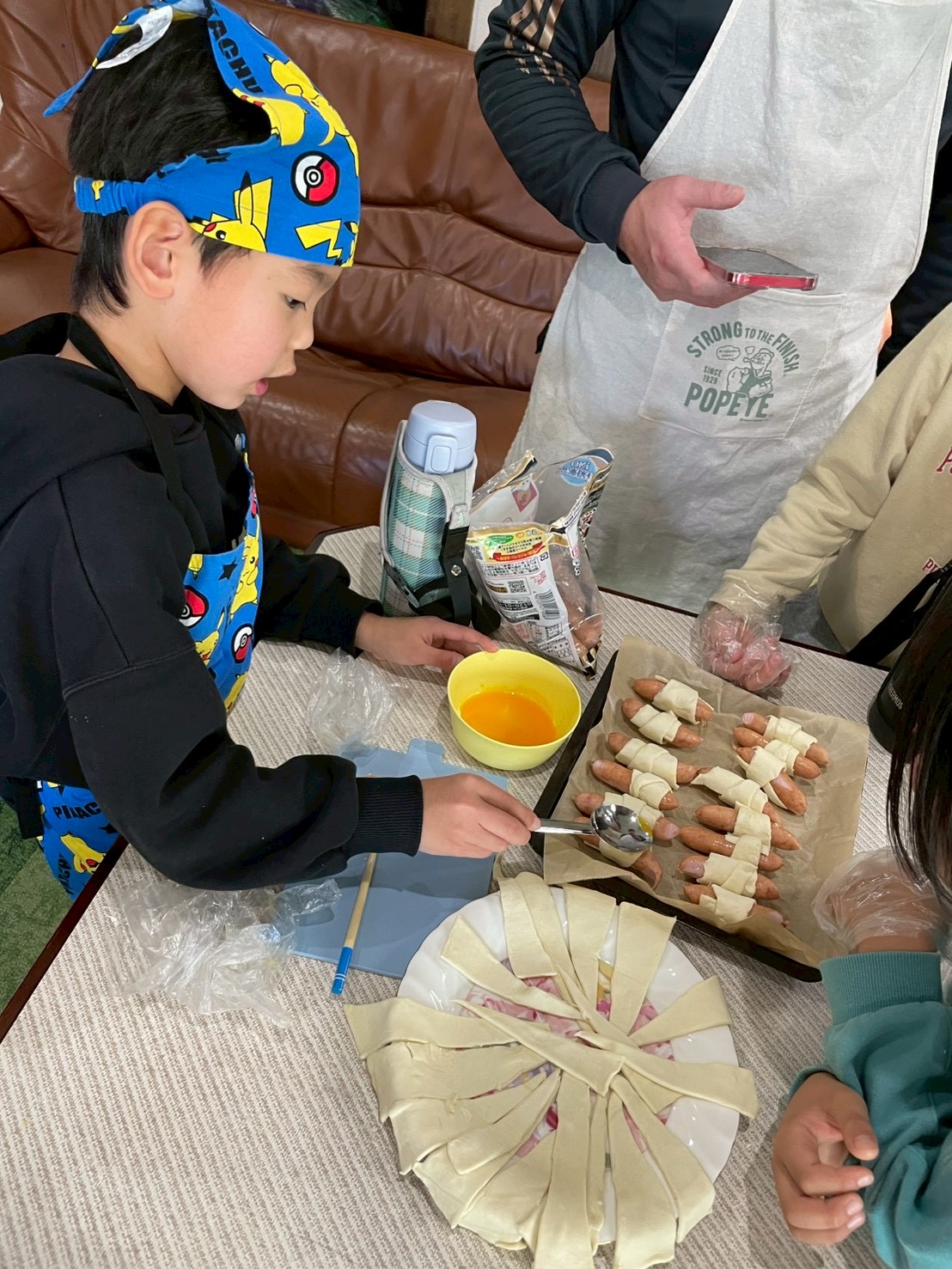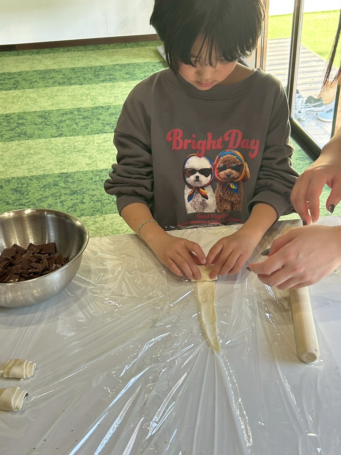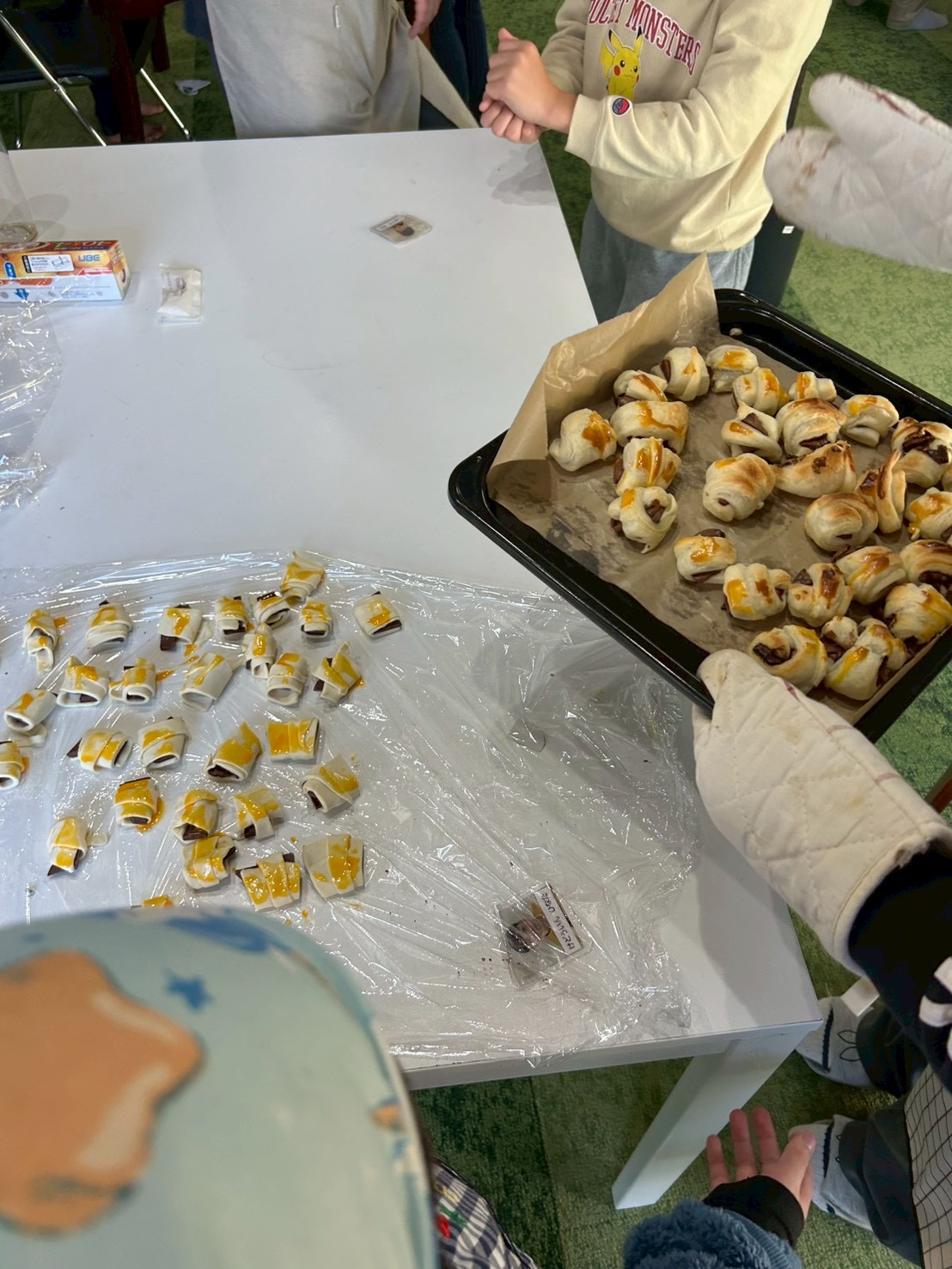 チョコパイ・アップルパイ・ウィンナーロールの3種類を作るため、子どもたちはそれぞれのグループに分かれて取り組みました🍀