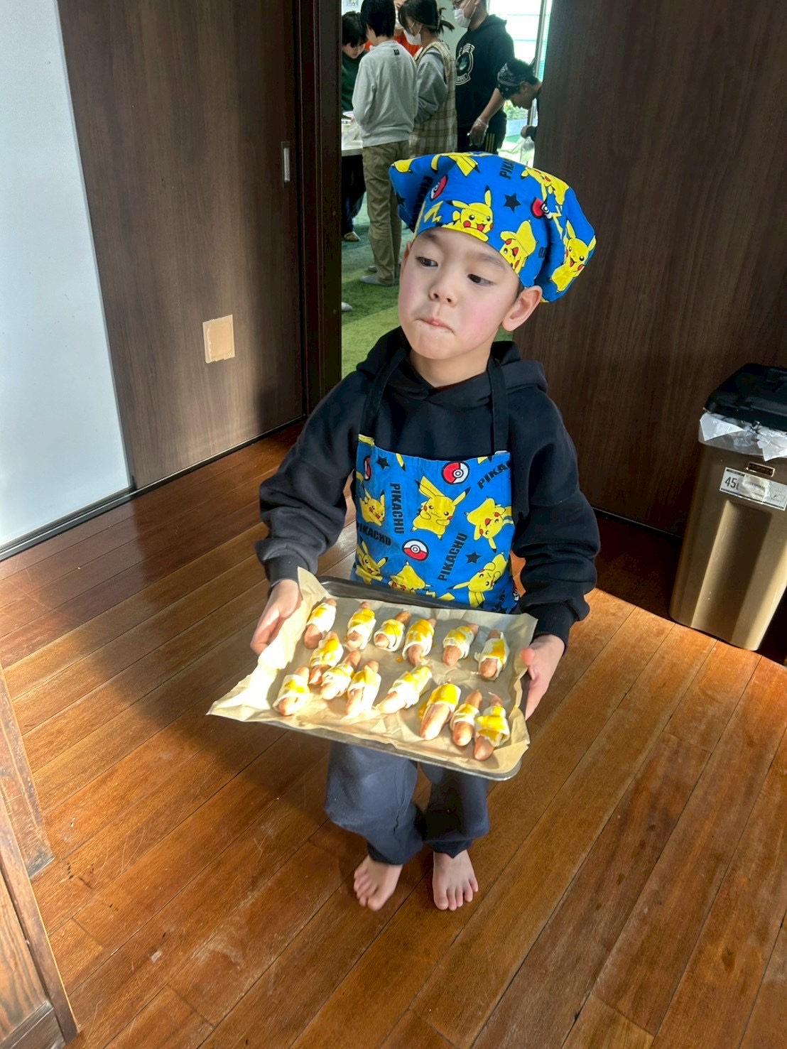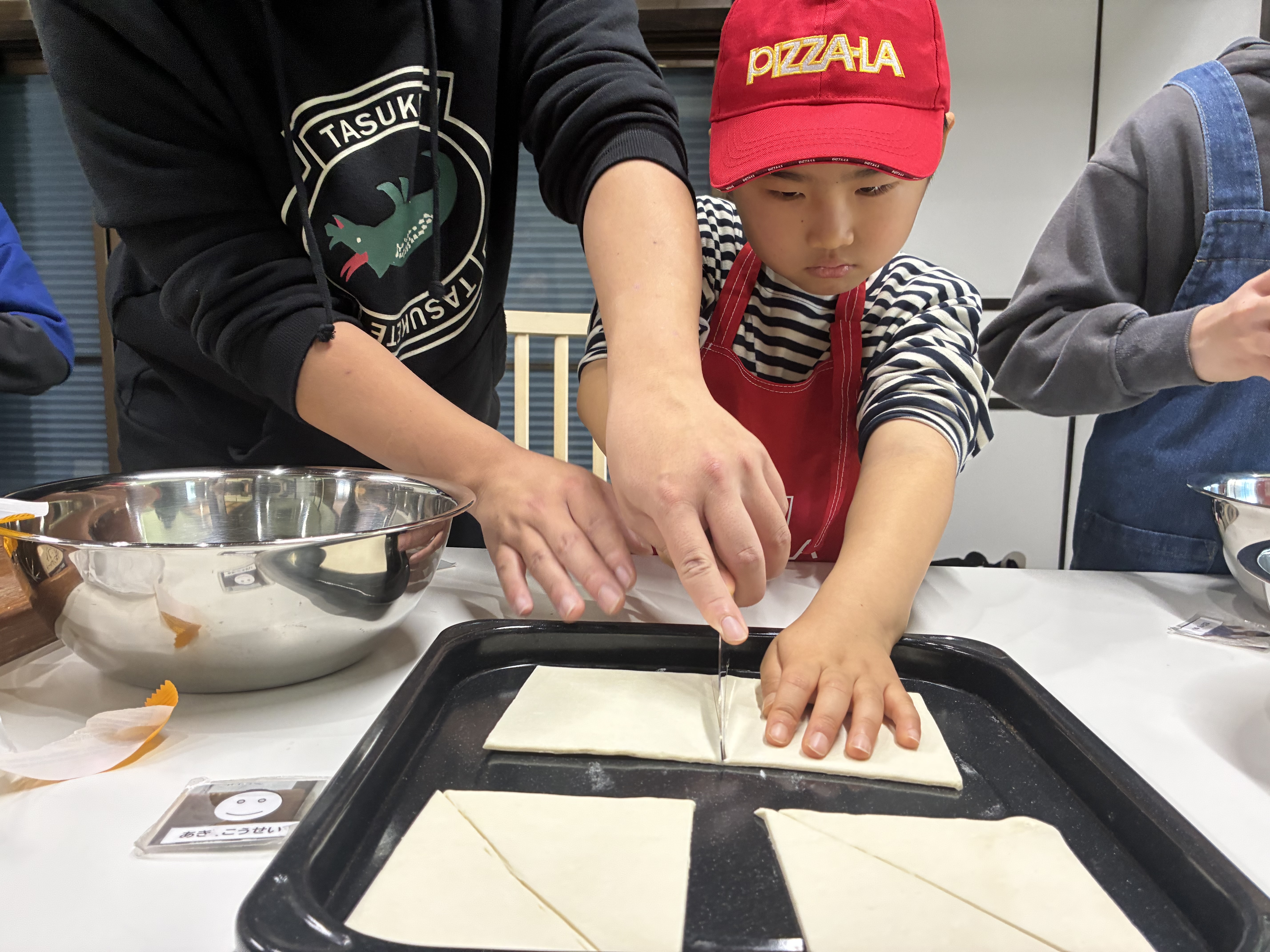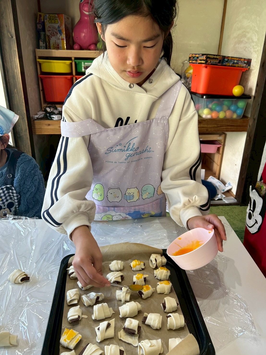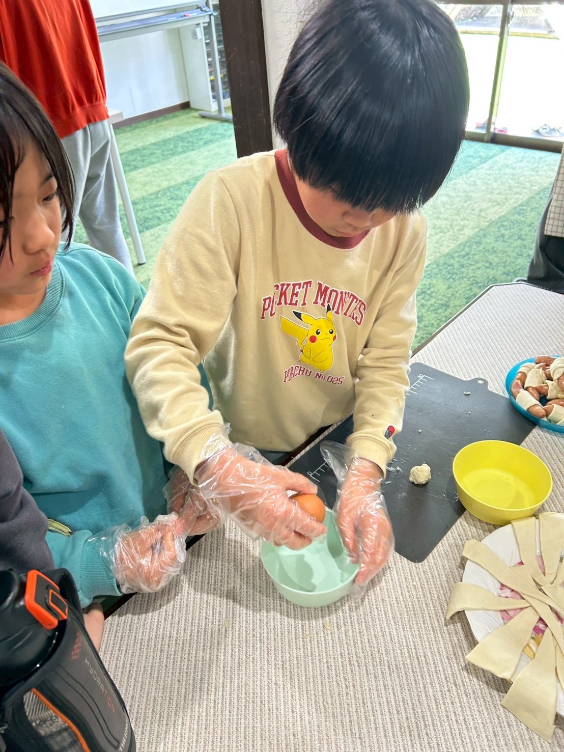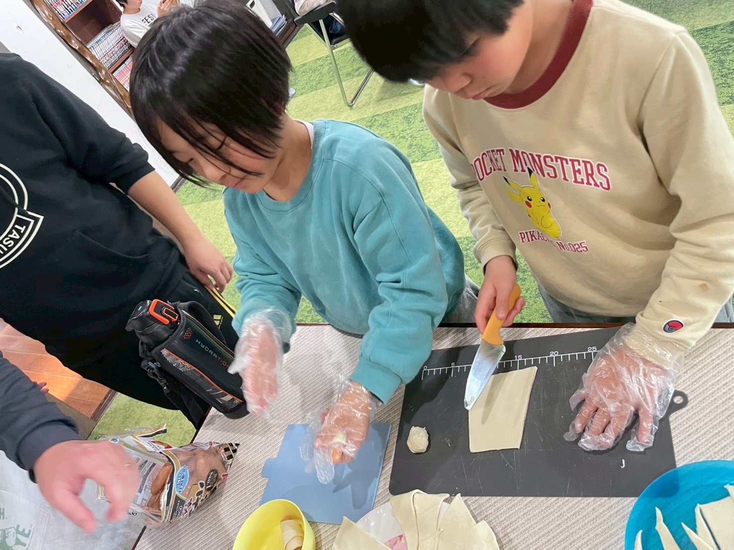 チョコパイ・アップルパイ・ウィンナーロールの3種類を作るため、子どもたちはそれぞれのグループに分かれて取り組みました🍀