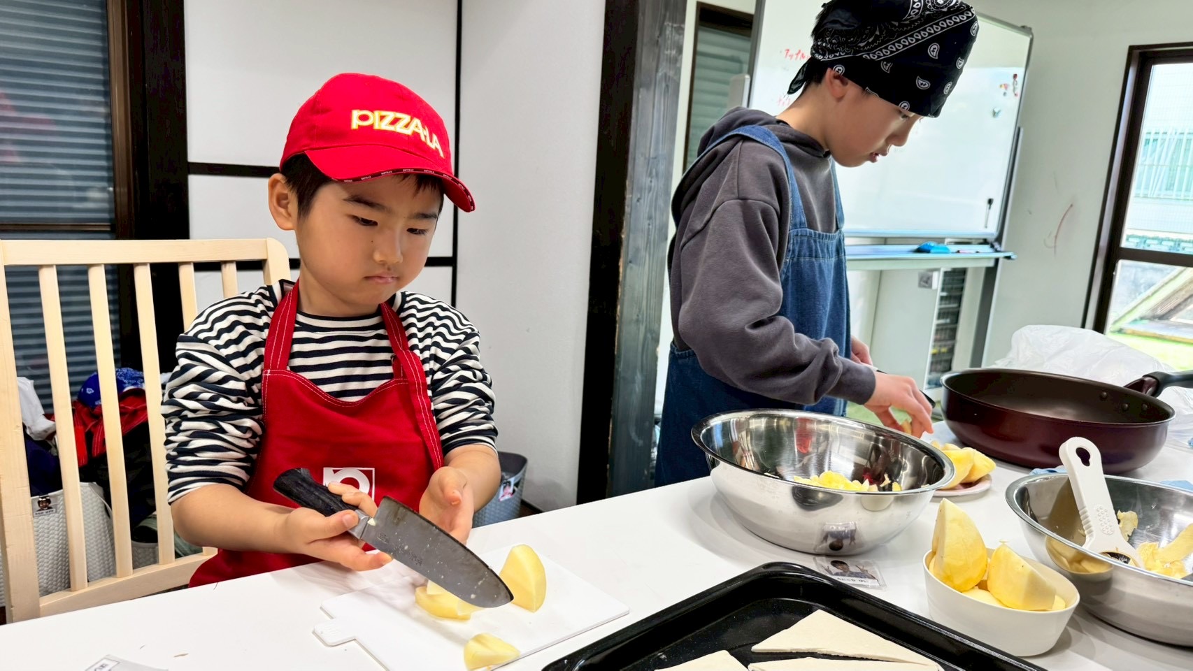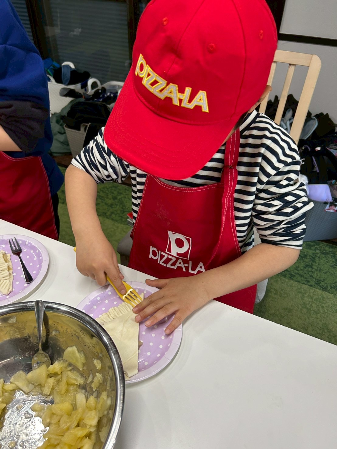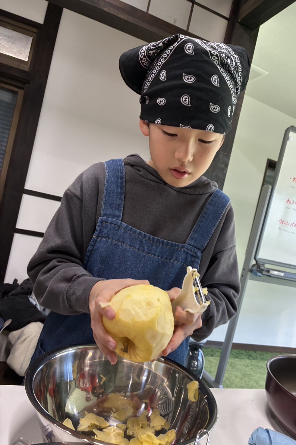 アップルパイグループでは、りんごジャム作りからスタートし、完成したジャムをパイで包んで閉じる作業まで、工程の多い調理にも集中して取り組む姿が見られました🍎😆