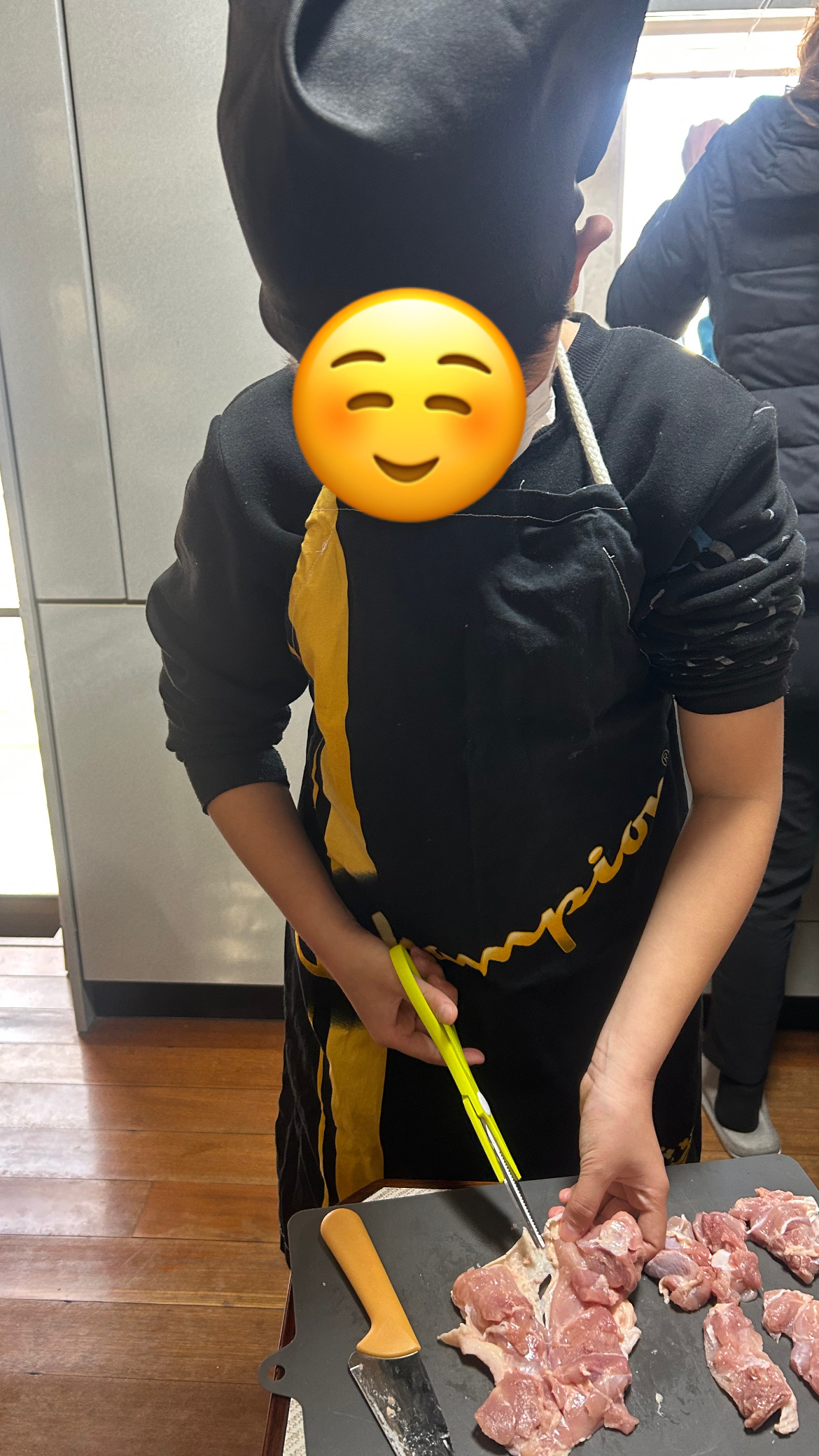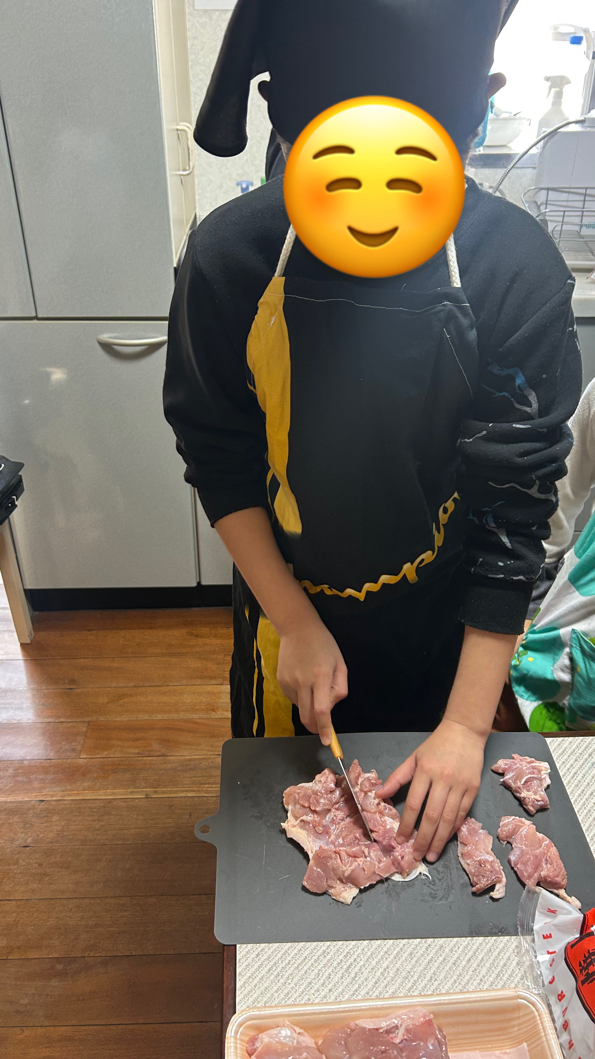 鶏肉を一口サイズにカット!調理✂️と包丁🔪どっちが切りやすいかな〜??と、試してみて、「調理バサミ✂️の方がスルスル切れるよ」!との事でした🤲