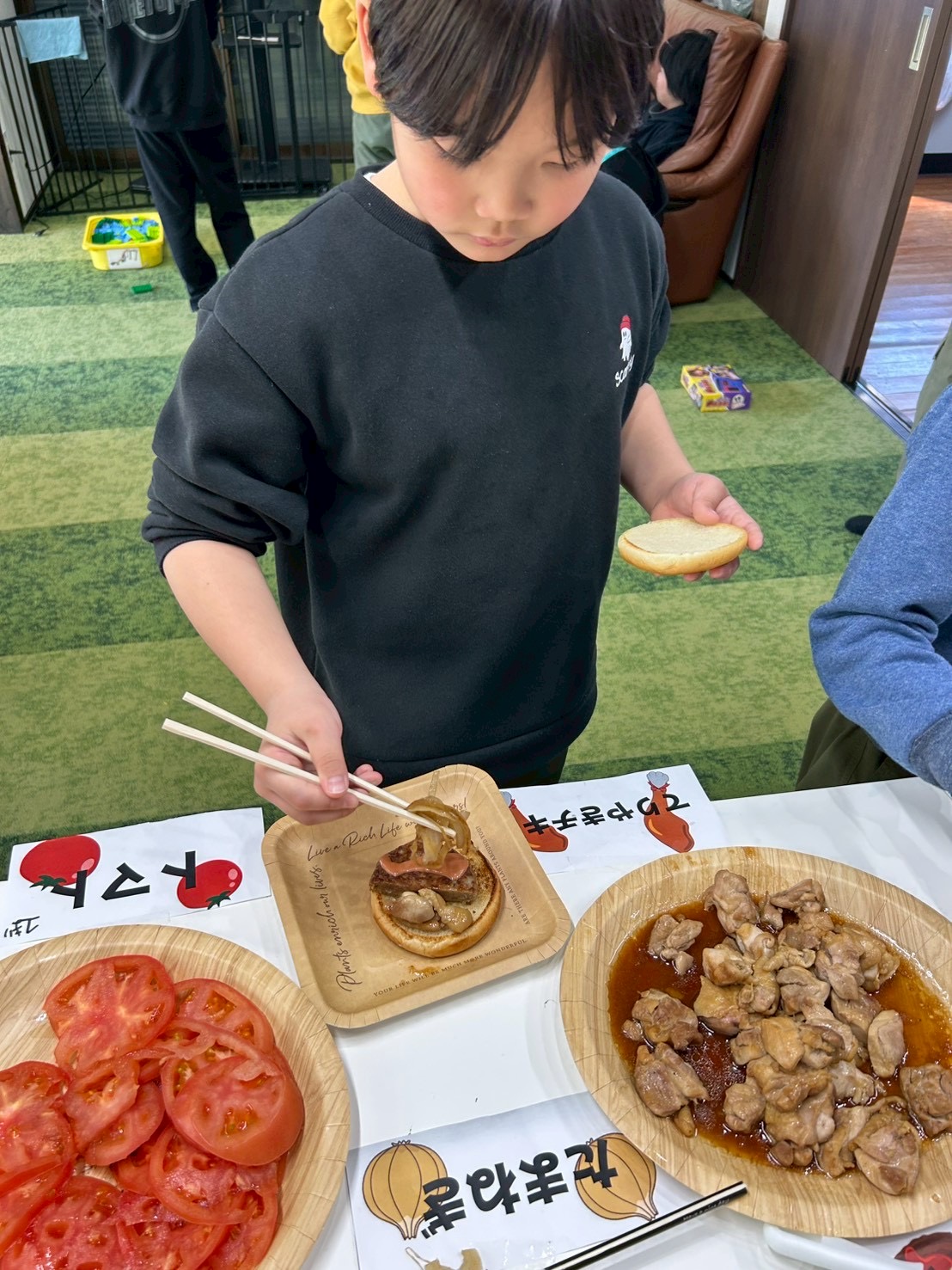本日のハンバーガー作りでは、ただ作るのではなく、バイキング形式で自分だけのオリジナルハンバーガーを作ってもらいました!!