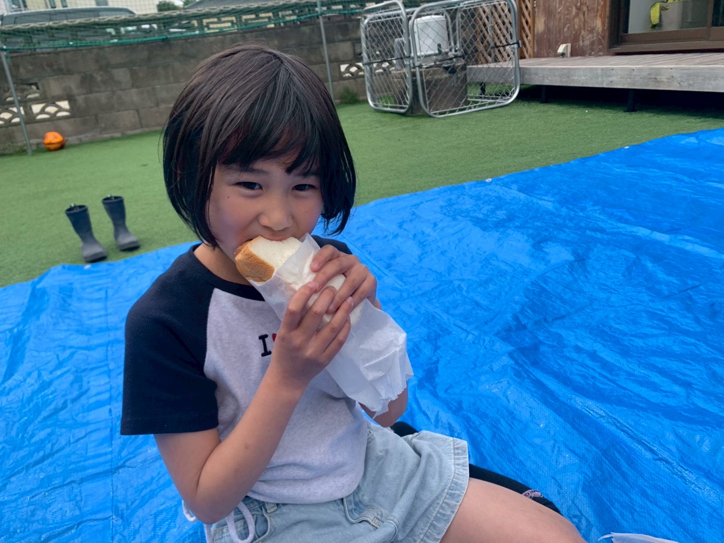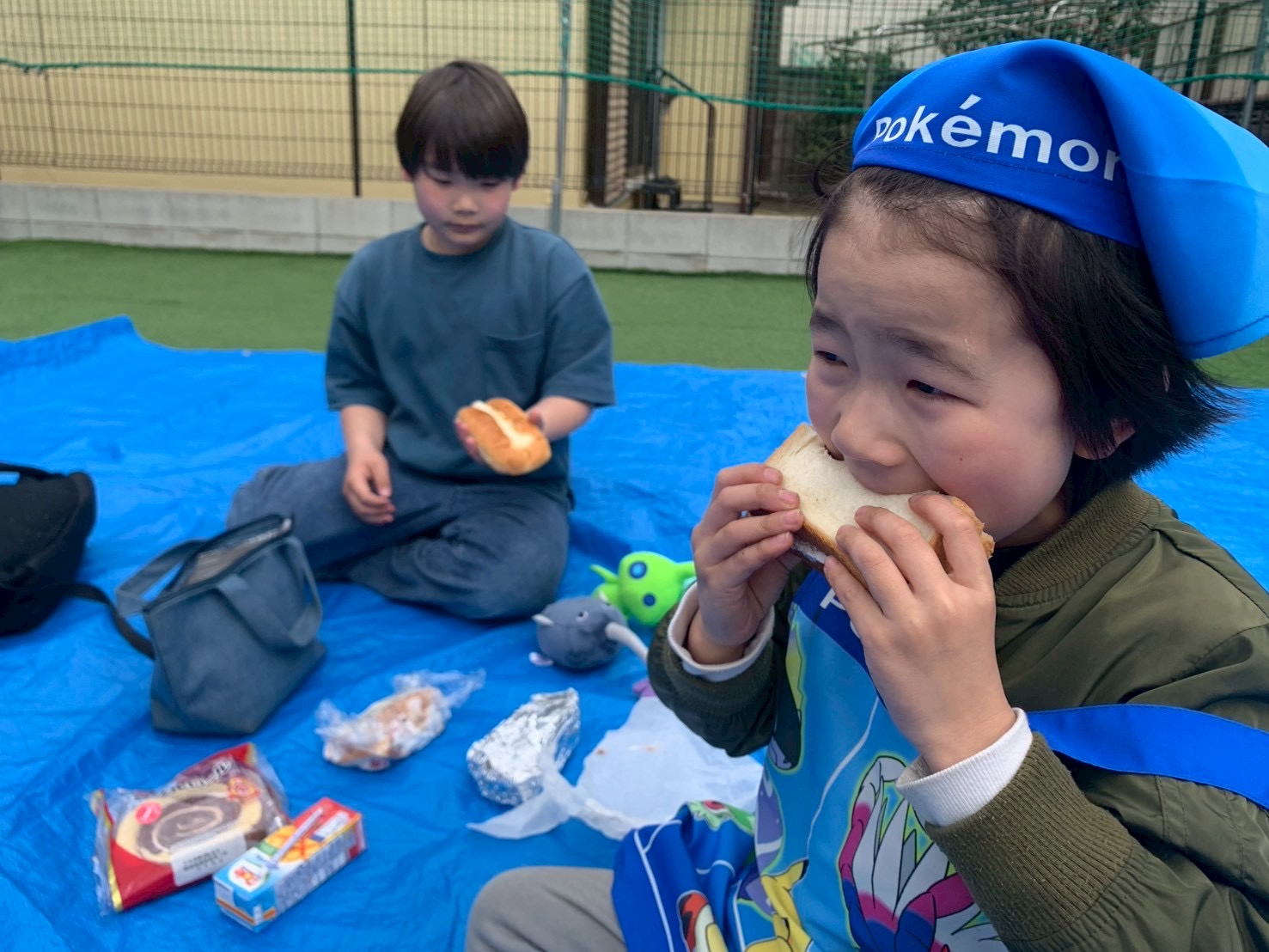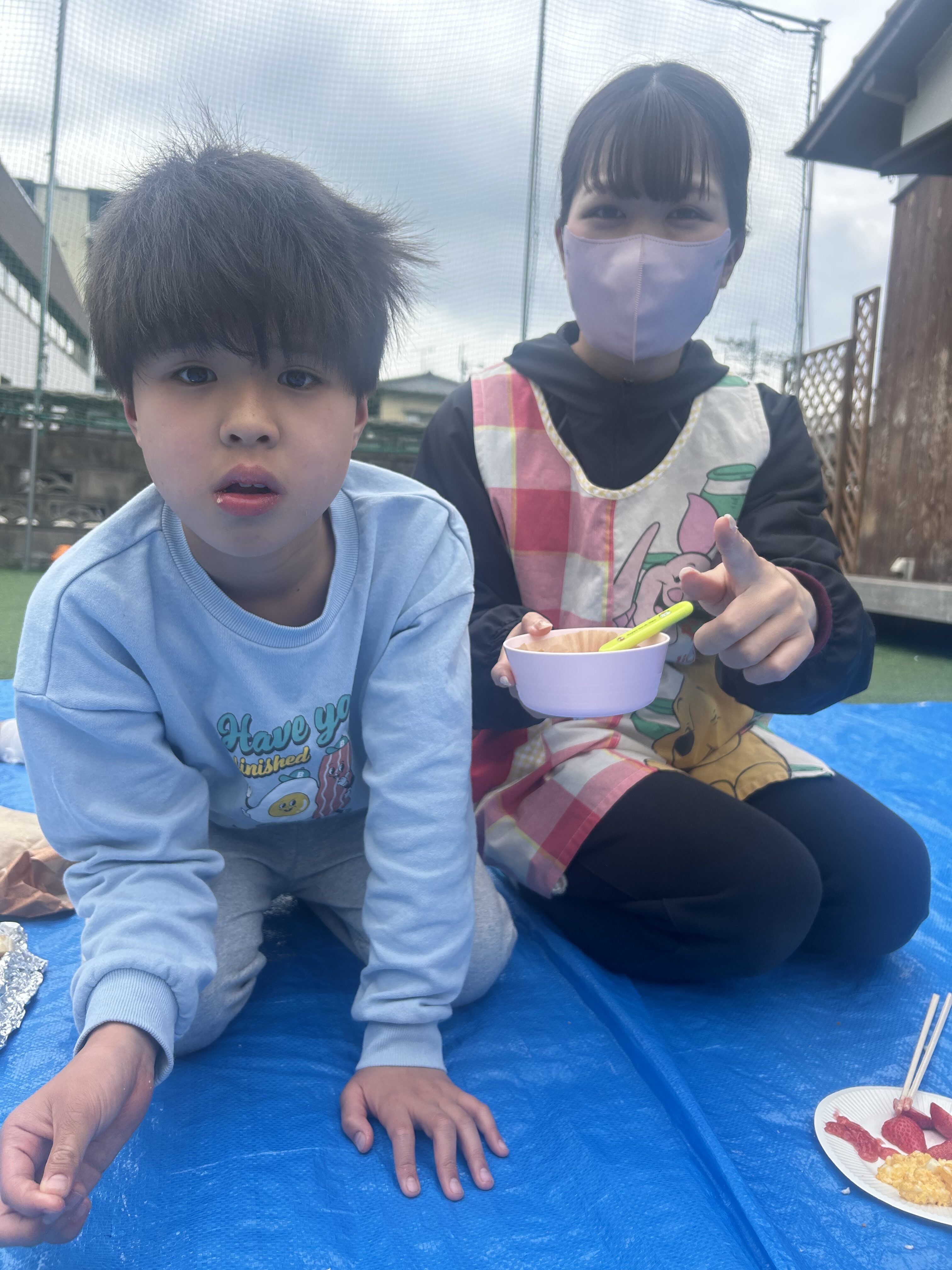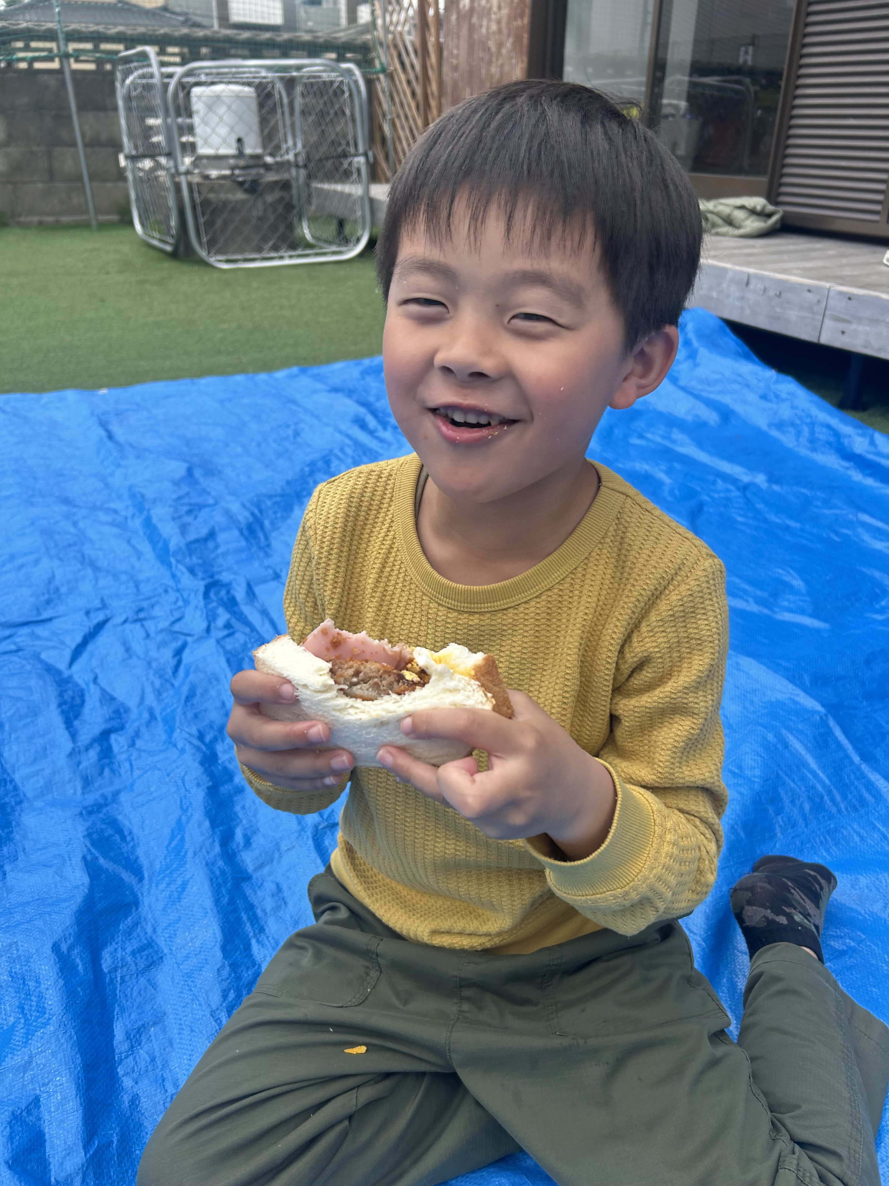 公園へ行きピクニック🧺の予定でしたが、雲行き☁️が怪しくなってきましたので、急遽中庭ピクニックに変更!公園へ行きたかったみんなごめんね🙇♀️