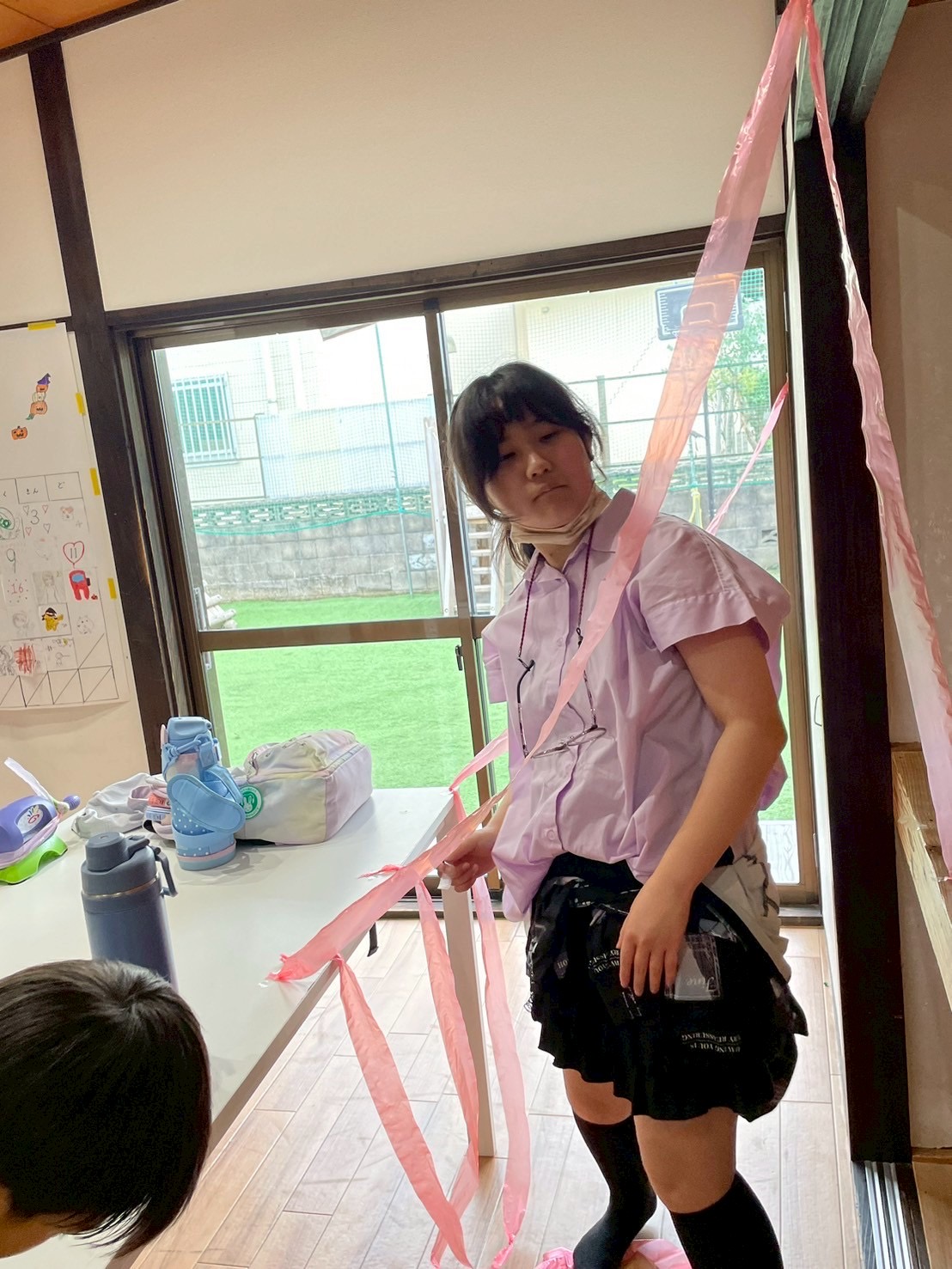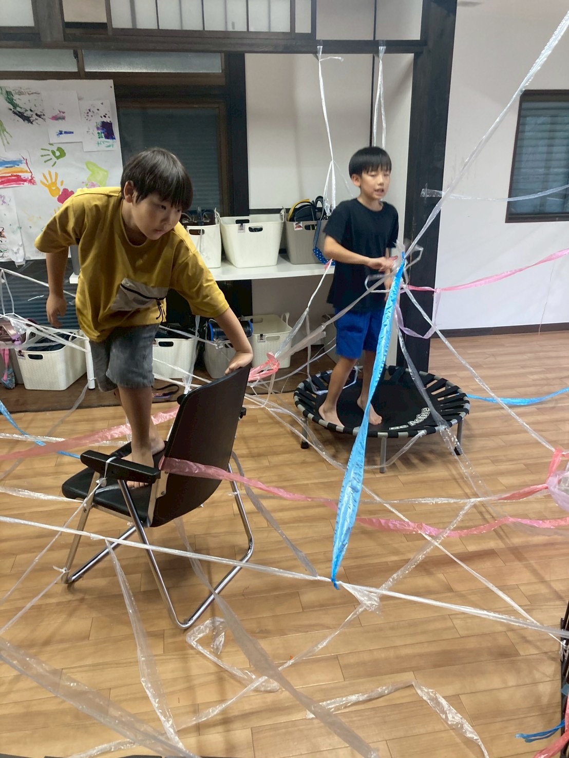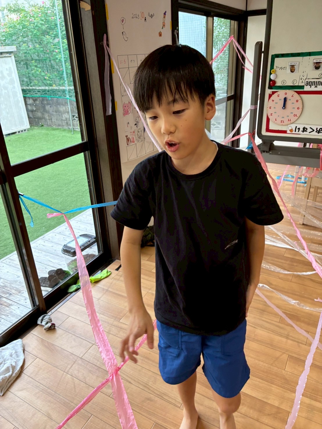 好きな色のテープを子どもたちに渡して部屋中を飾りつけて貰いました❤️🤍🩵