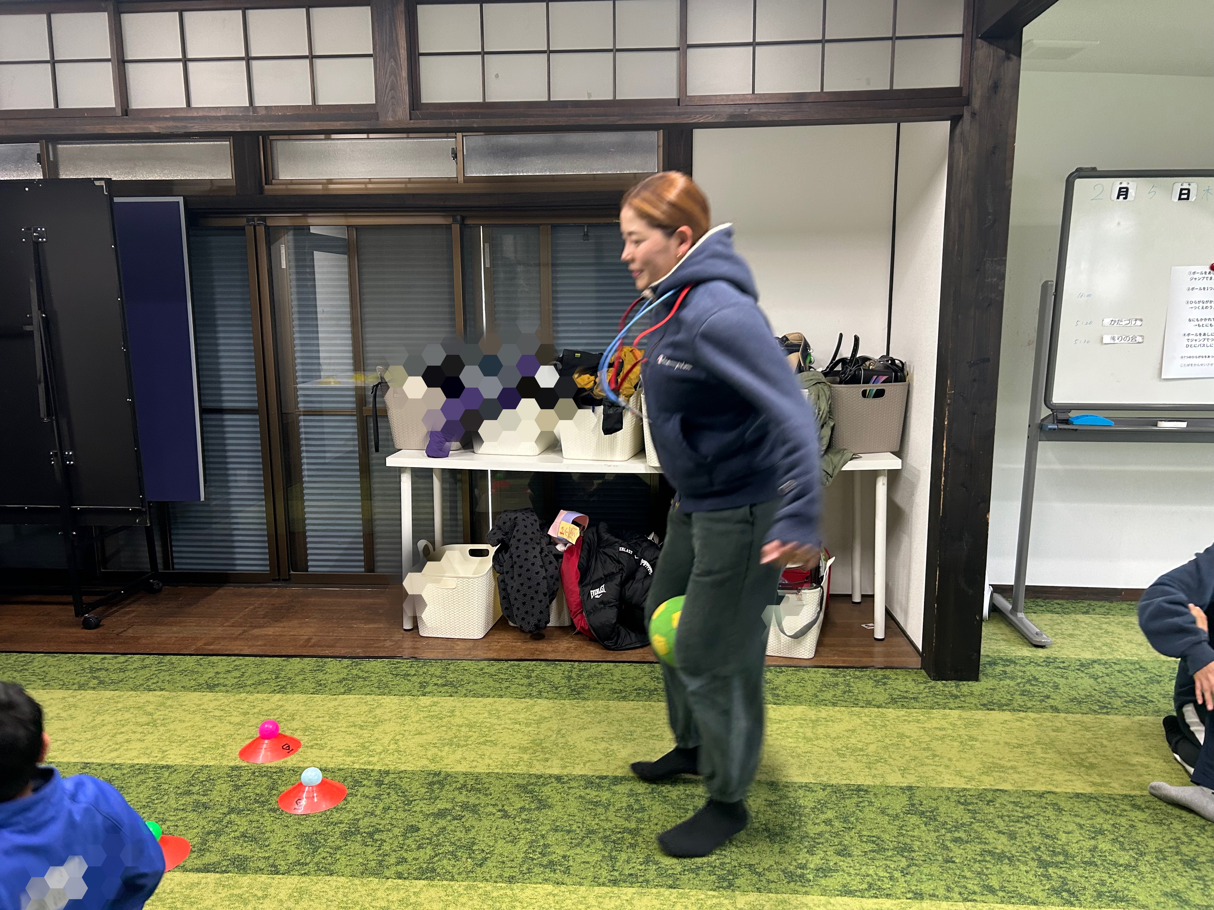 足でボールを挟んだ状態で前にジャンプをする事で、バランス感覚や体の使い方を意識しながら足の筋力を鍛えることができます✨