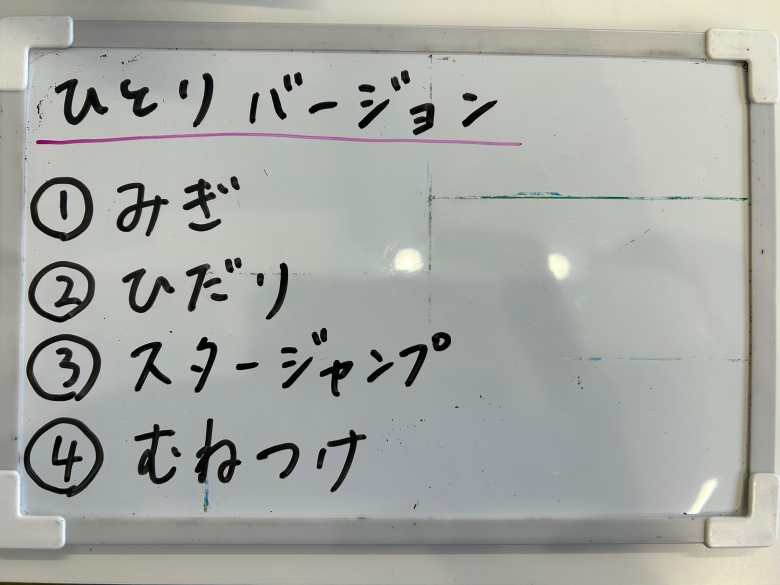 ①〜④の合図が無い間は、ひたすらその場で小刻みにダッシュします!無酸素運動なのでかなりきついです!その後合図合図があれば、①と②は腰の廻旋を素早く行い、③は両手両足を大きく開き星の形のようにジャンプします⭐️④はその名のとおりむねを地面につけ、素早く元の立った状態に戻ります!