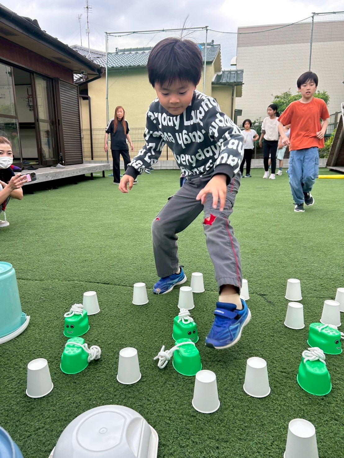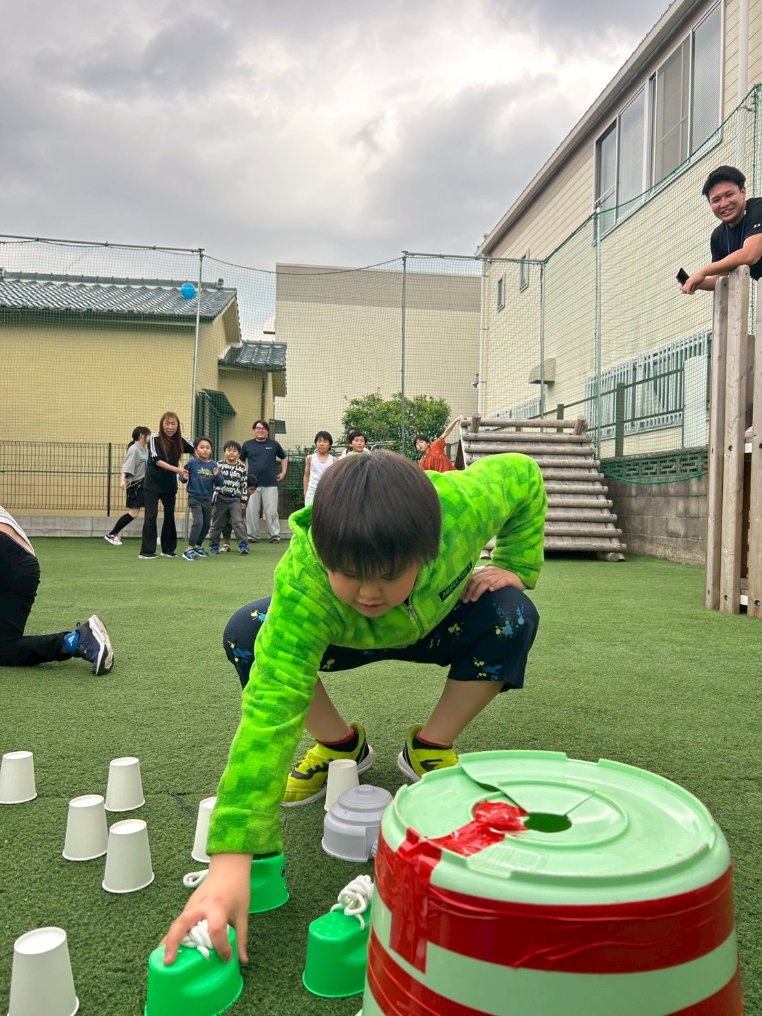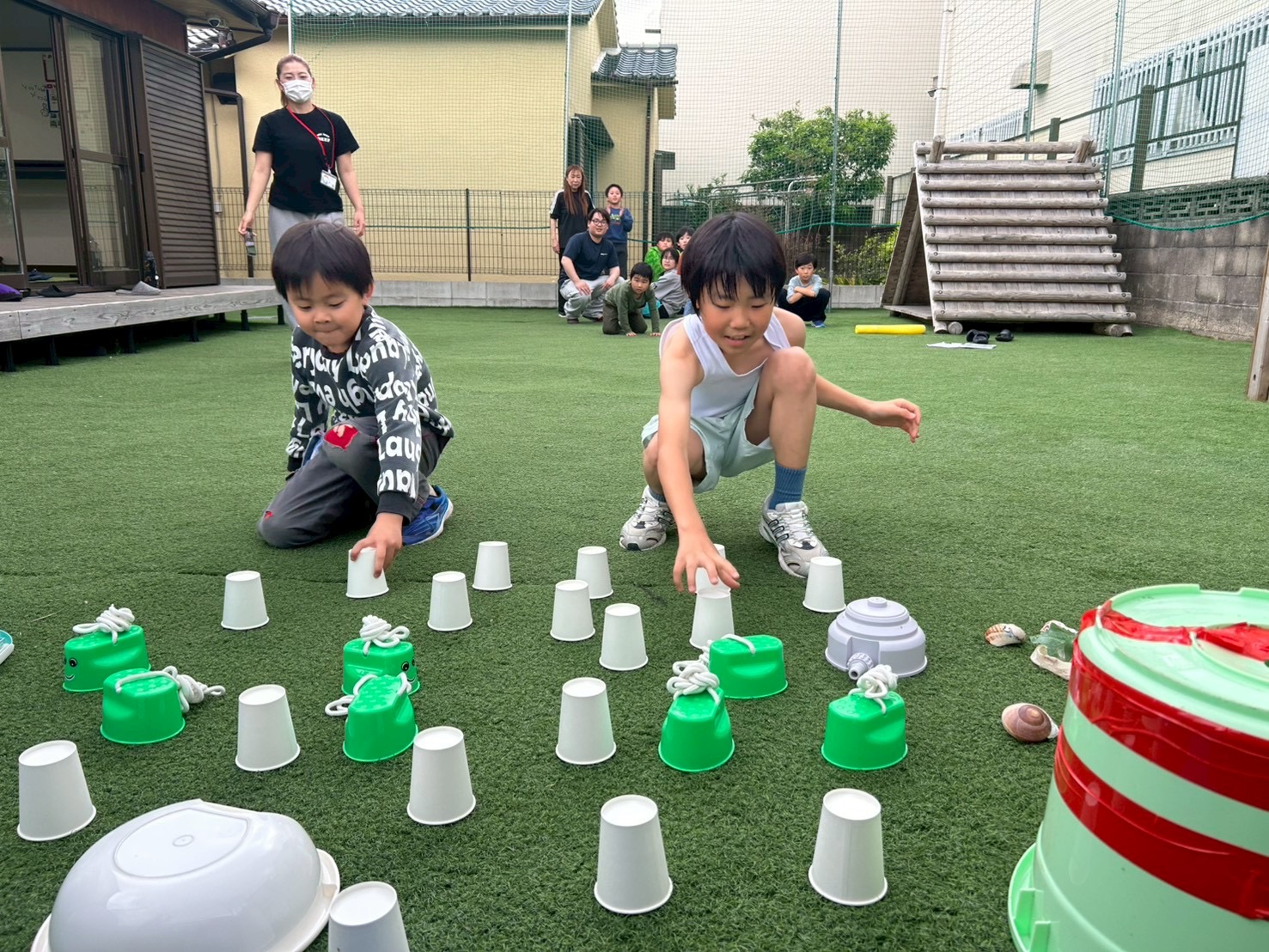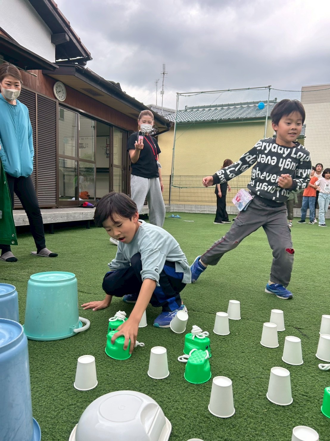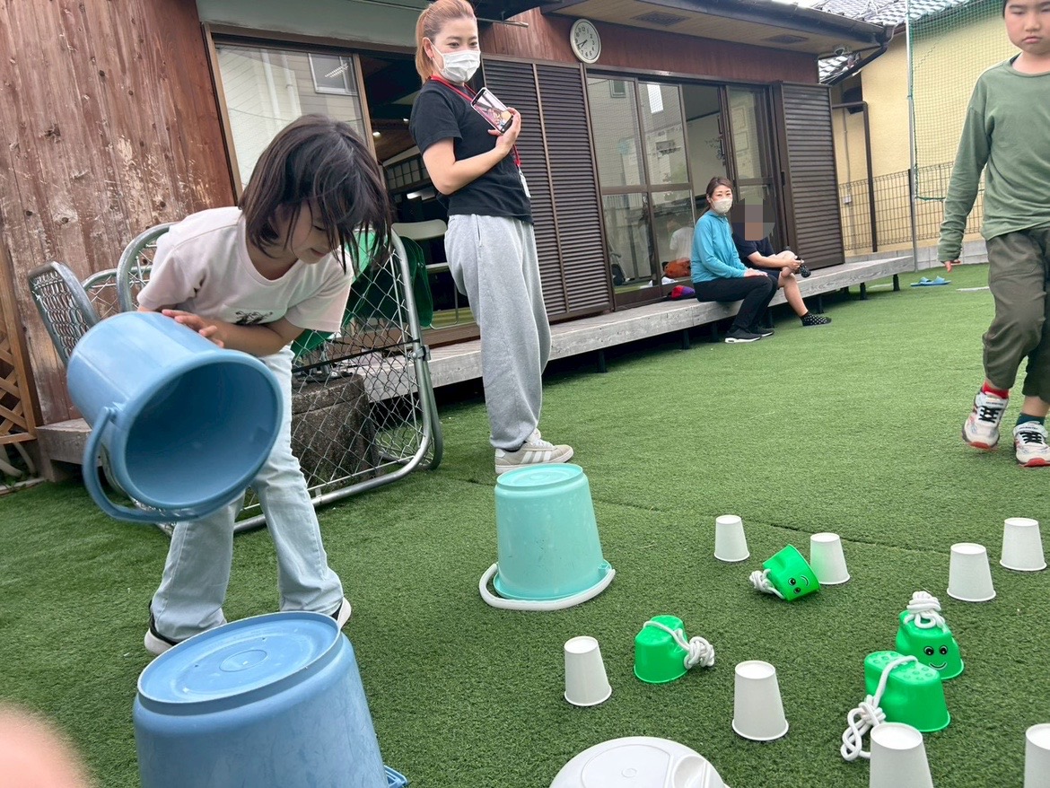 ①チーム戦です!よーいどん!の合図でスタートラインから無造作に並べられた複数の紙コップやバケツなどにダッシュで向かい、1人1回めくる!