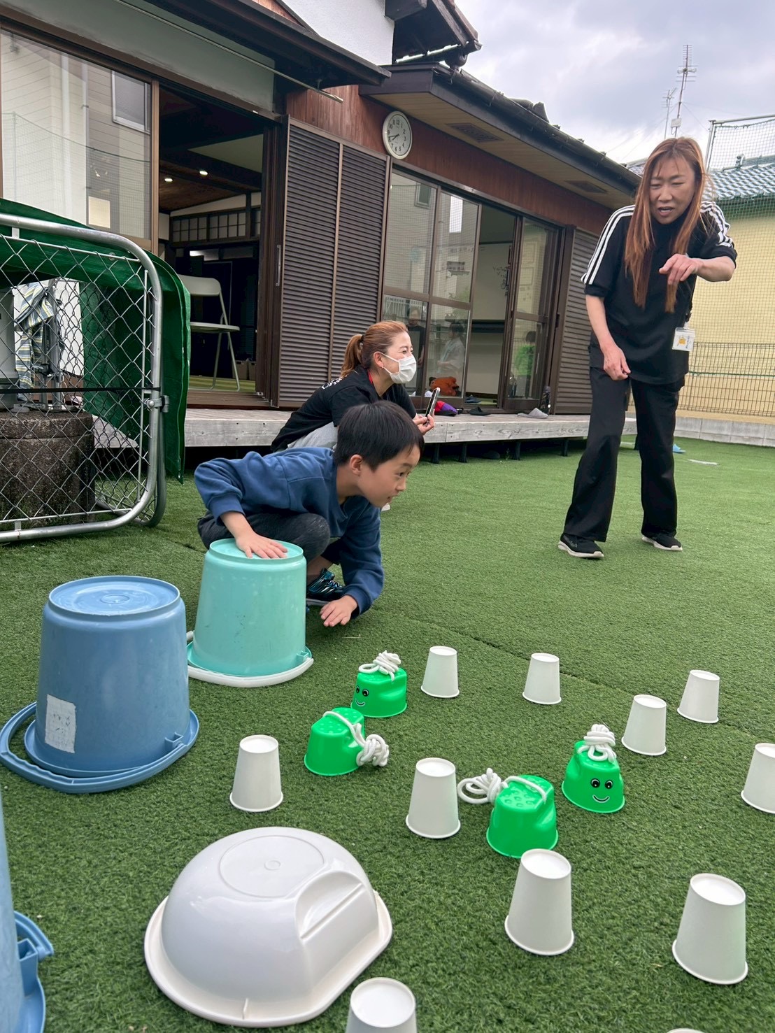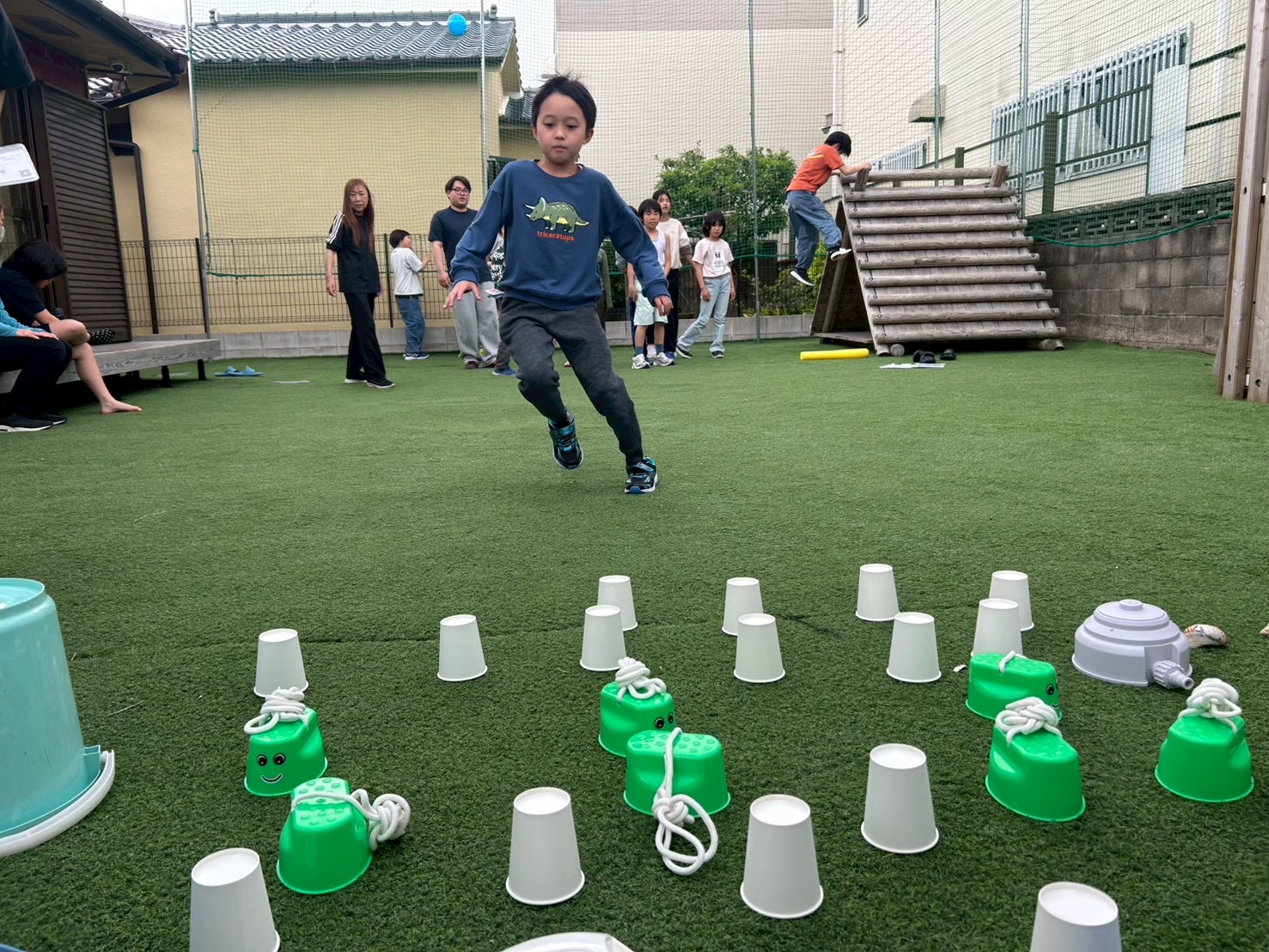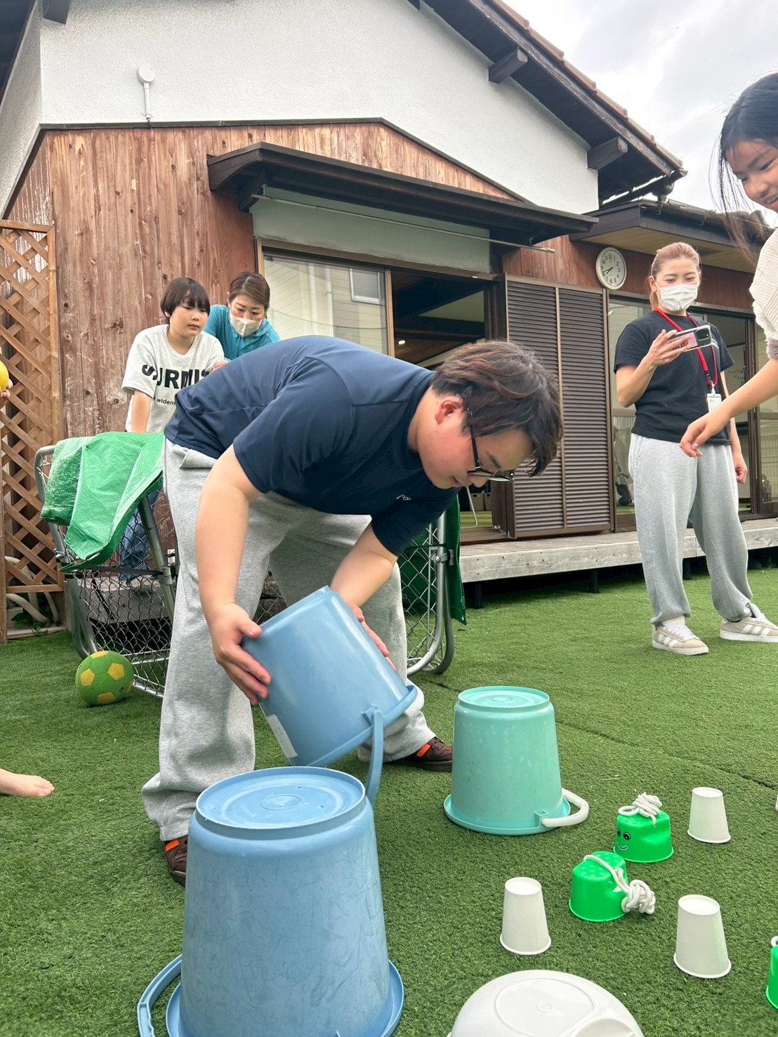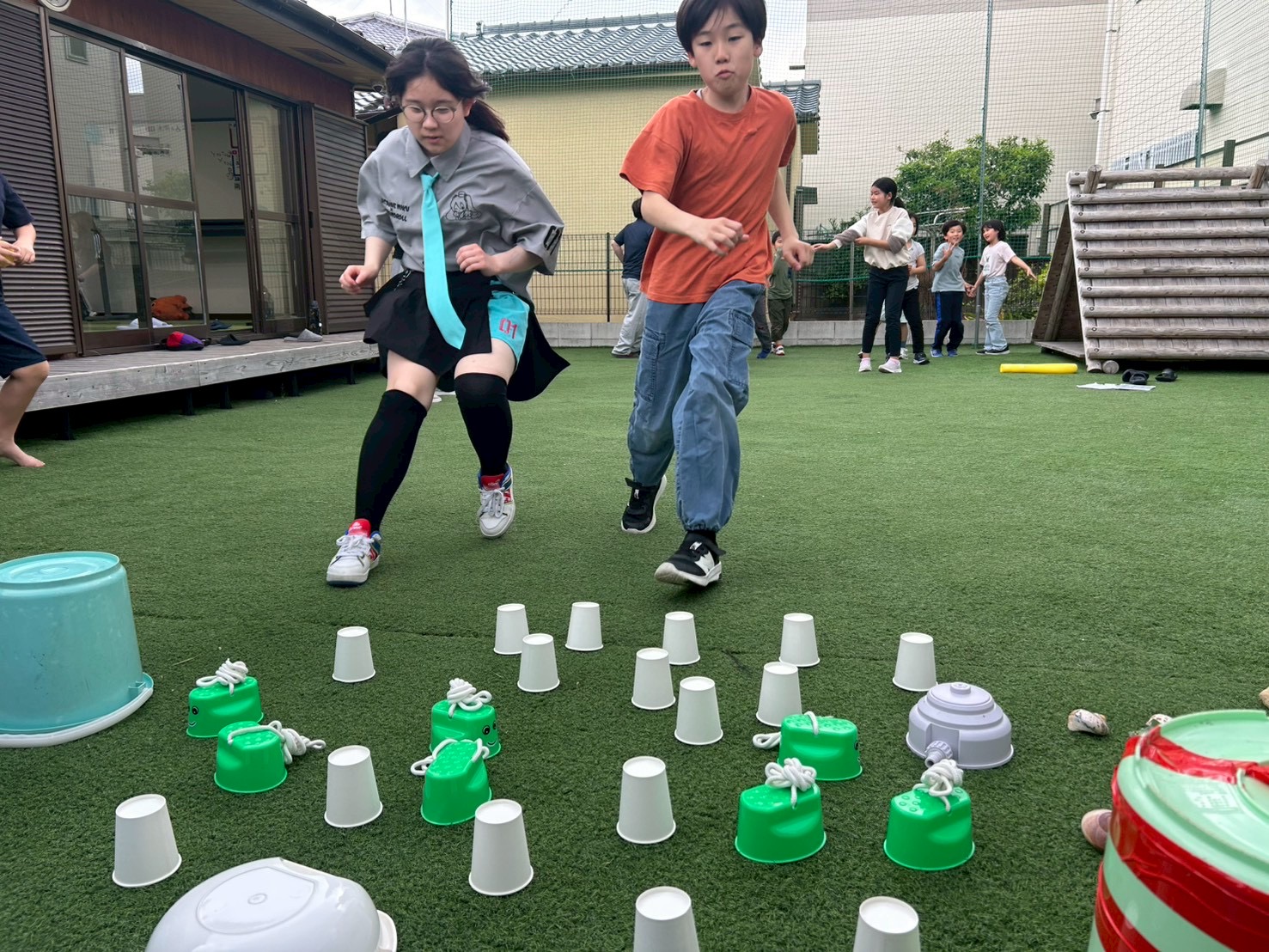 ①チーム戦です!よーいどん!の合図でスタートラインから無造作に並べられた複数の紙コップやバケツなどにダッシュで向かい、1人1回めくる!