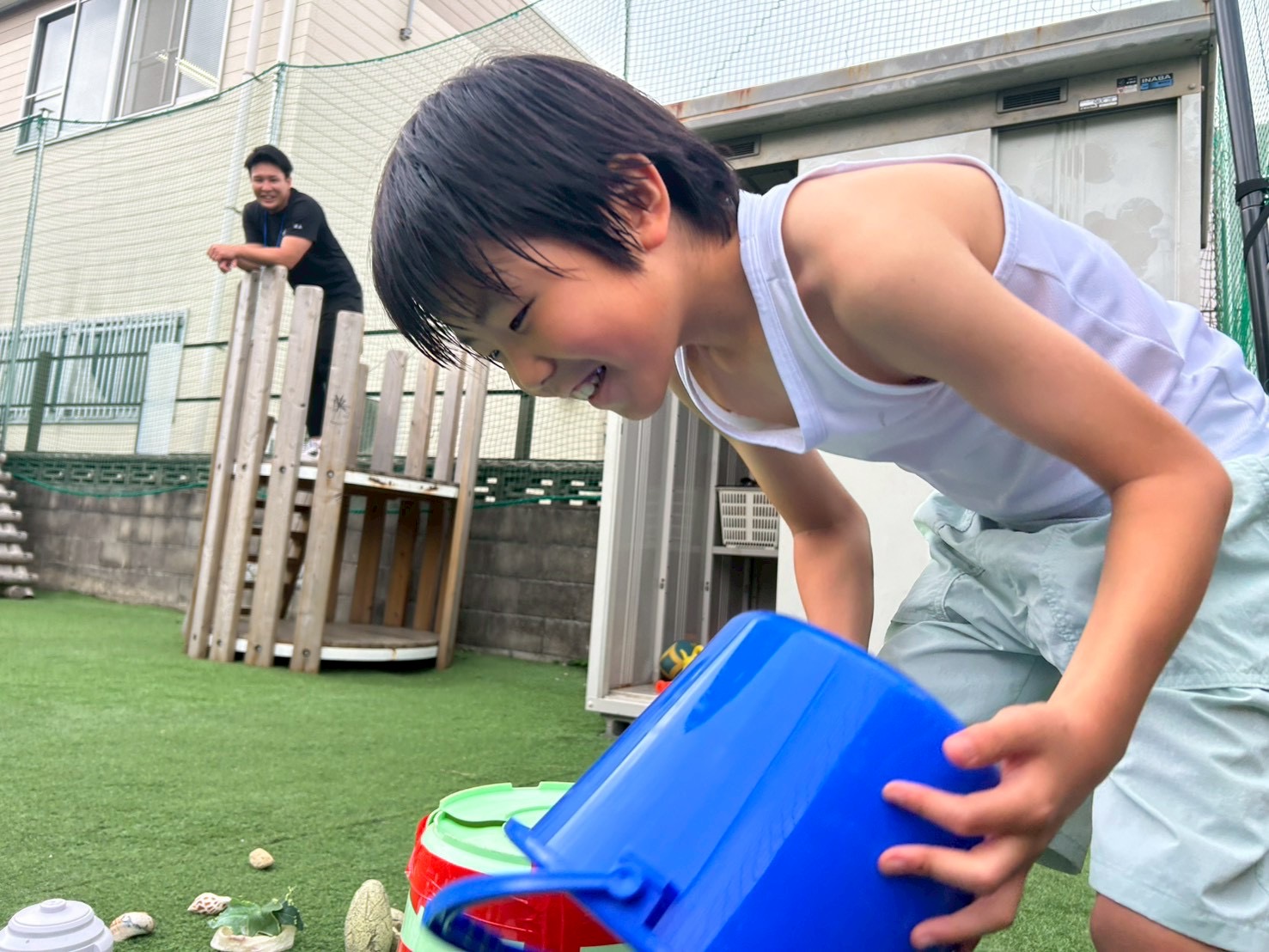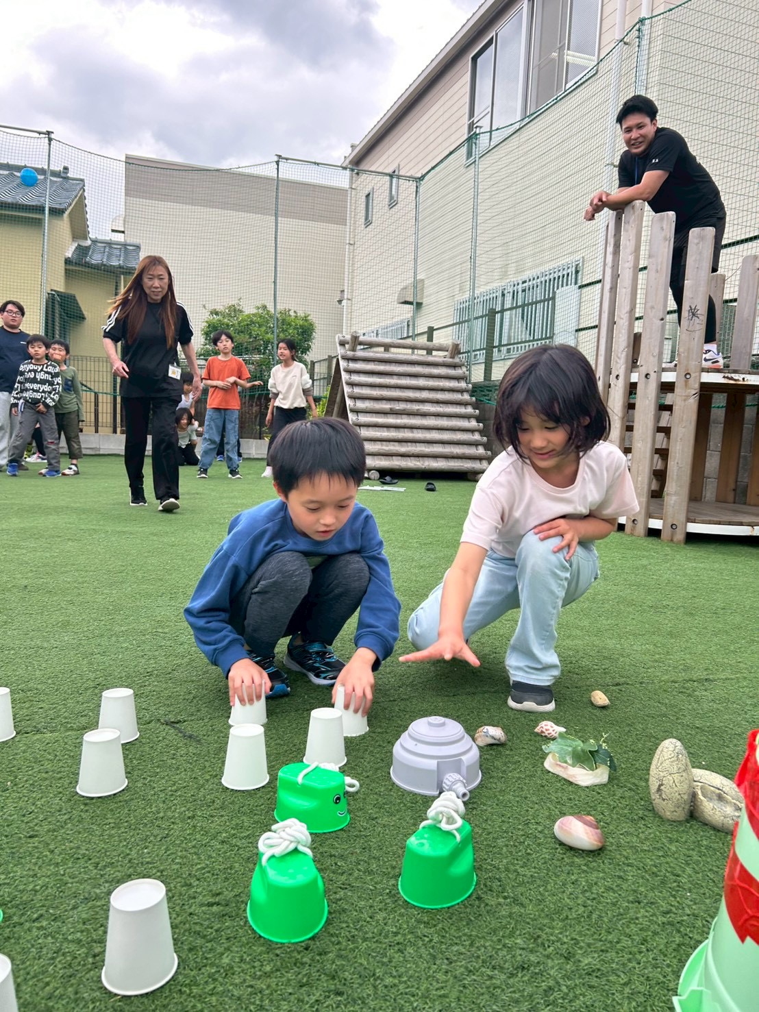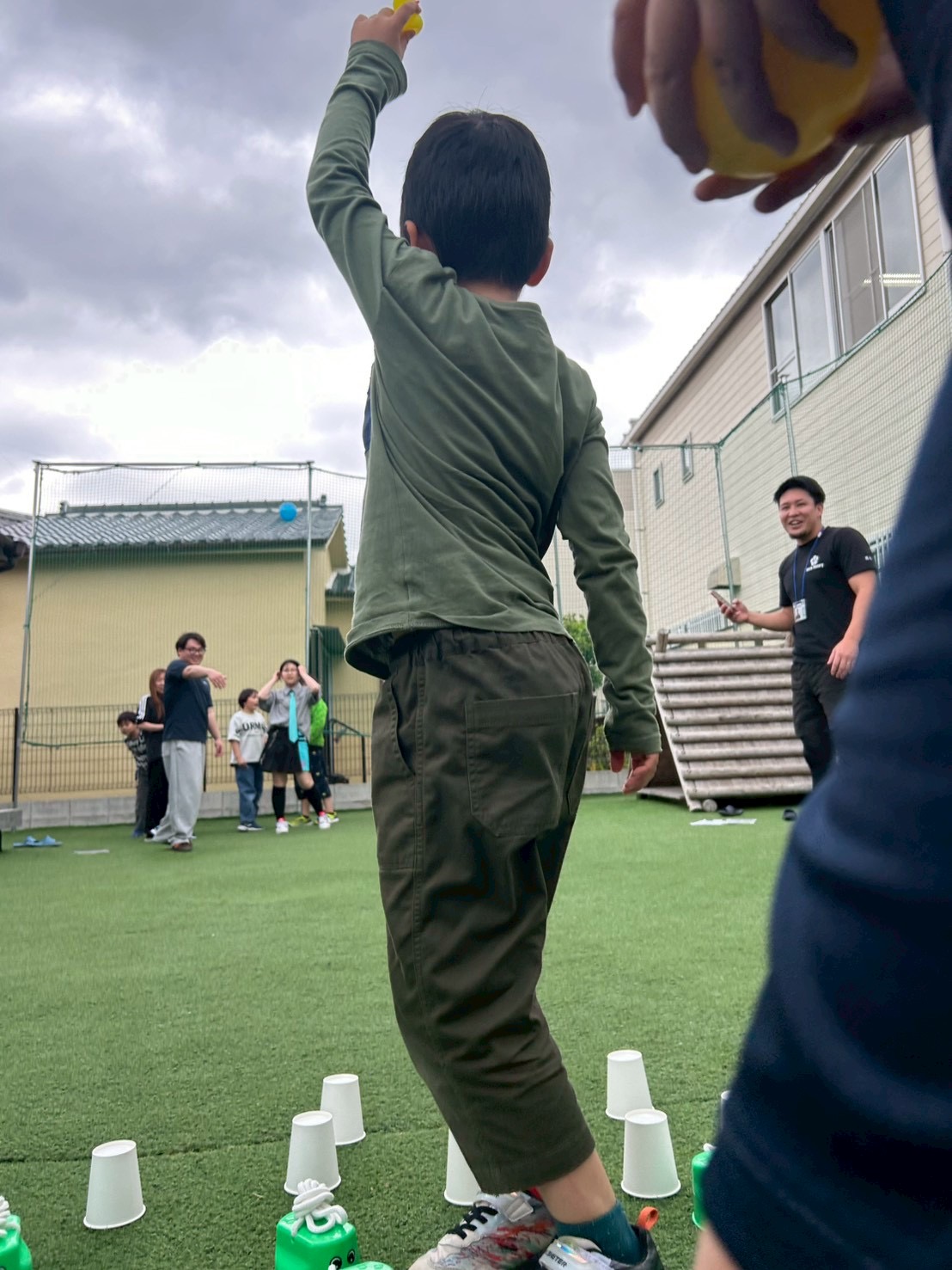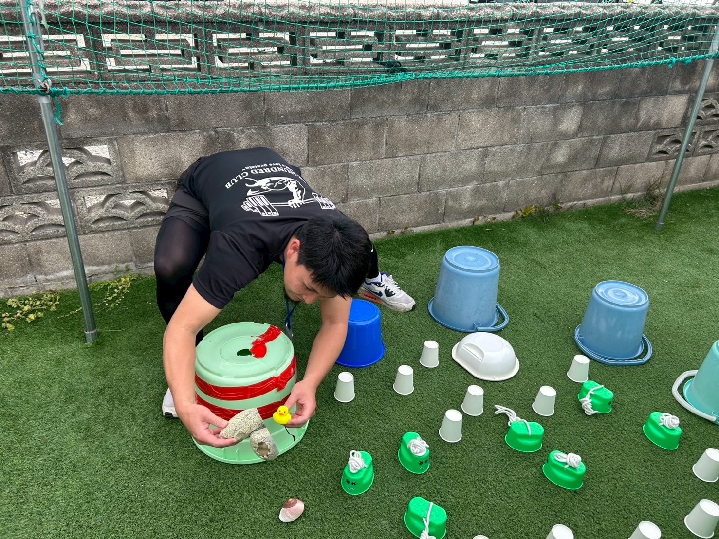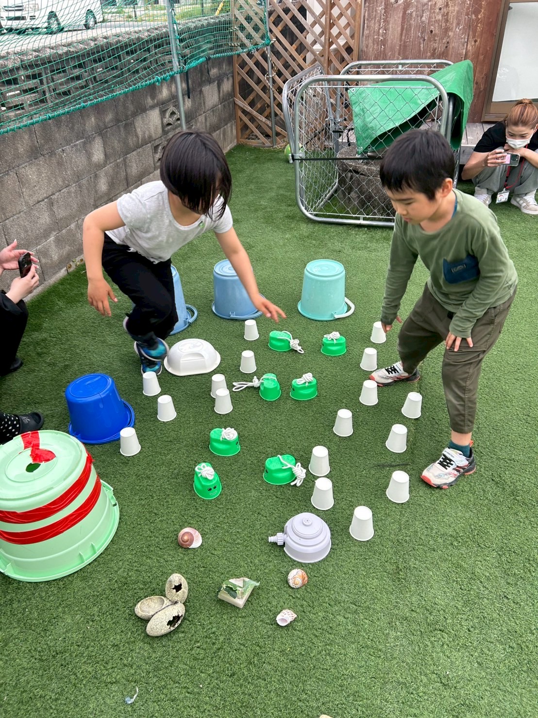 ①チーム戦です!よーいどん!の合図でスタートラインから無造作に並べられた複数の紙コップやバケツなどにダッシュで向かい、1人1回めくる!