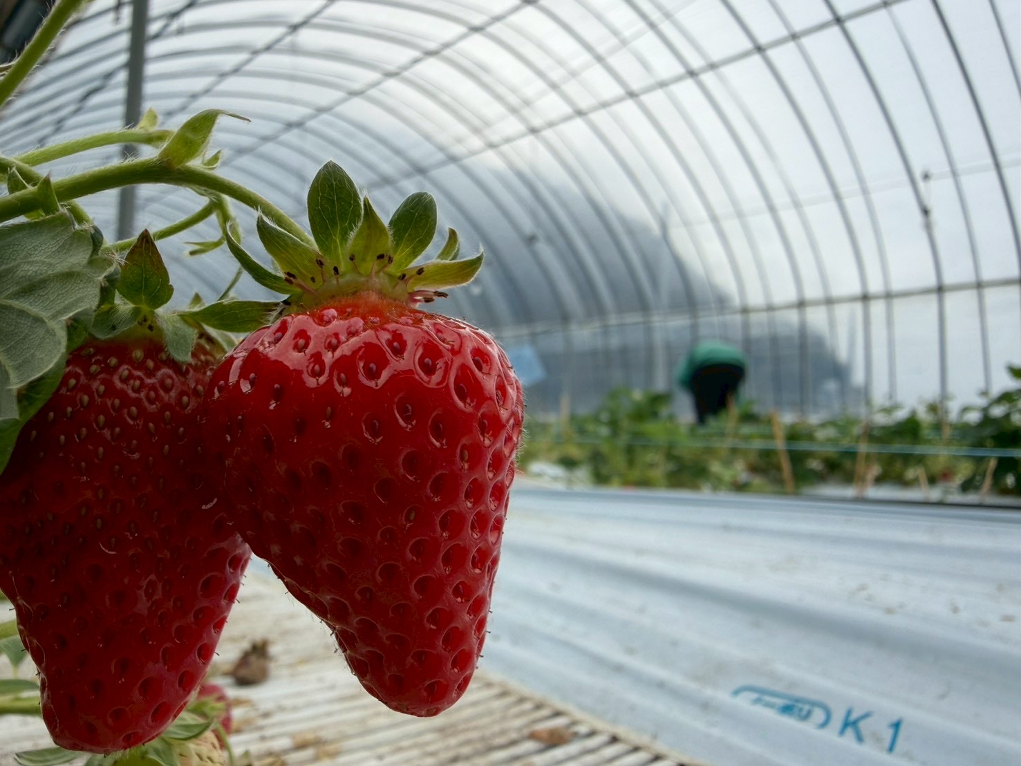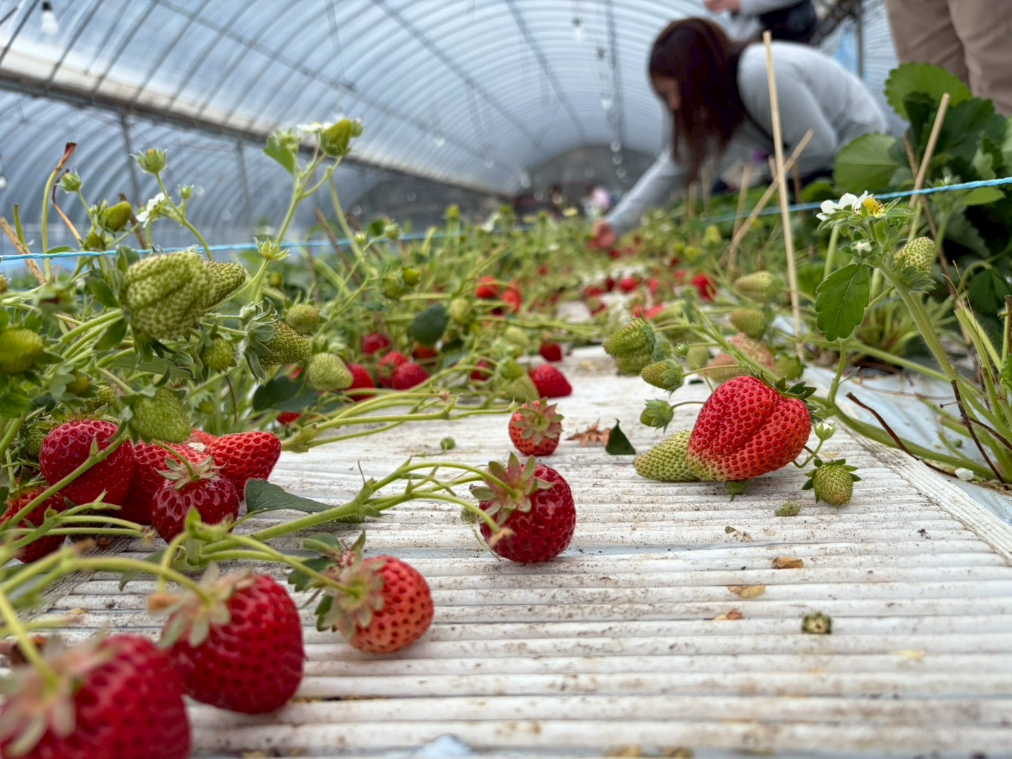 ビニルハウスの中に入ると、真っ赤に実ったいちごがずらりと並び、その光景に「わぁ〜!すごい!」と歓声が上がりました😁