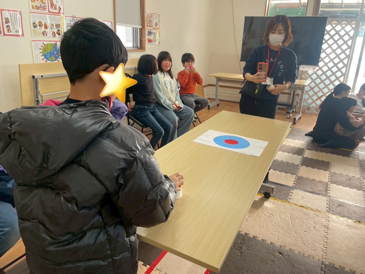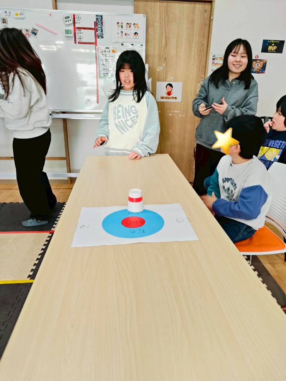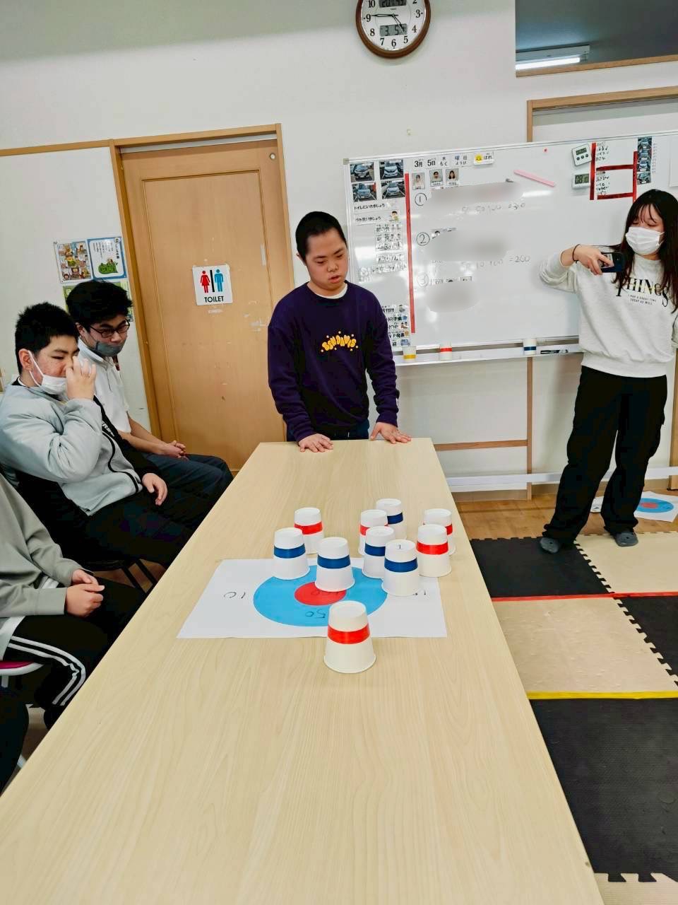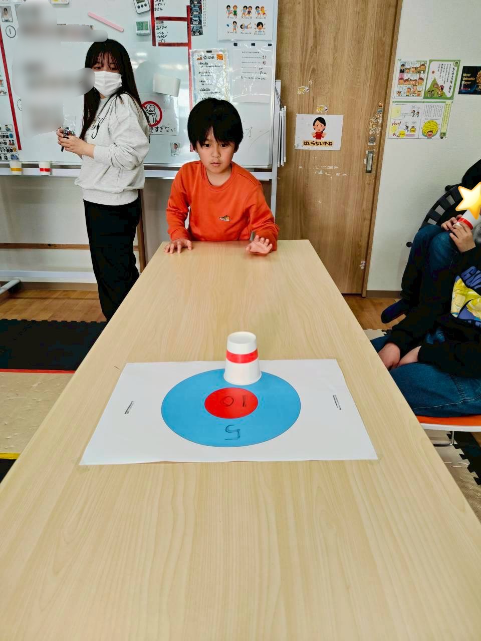 3回戦目はひとつの的に向かってみんなが投げます🥌前の人が置いた紙コップもそのままになるので、どこを狙うか戦略が試されます💡