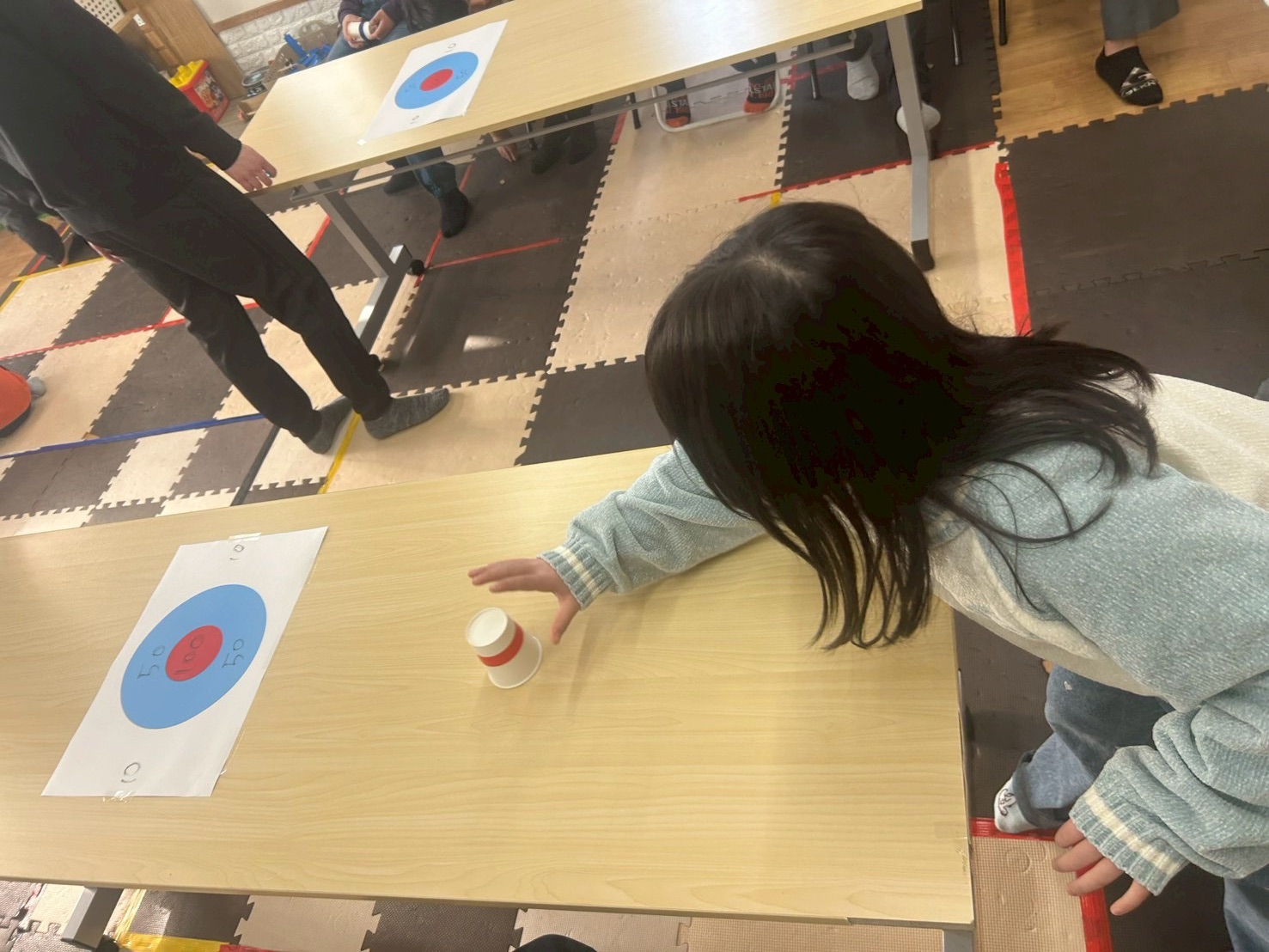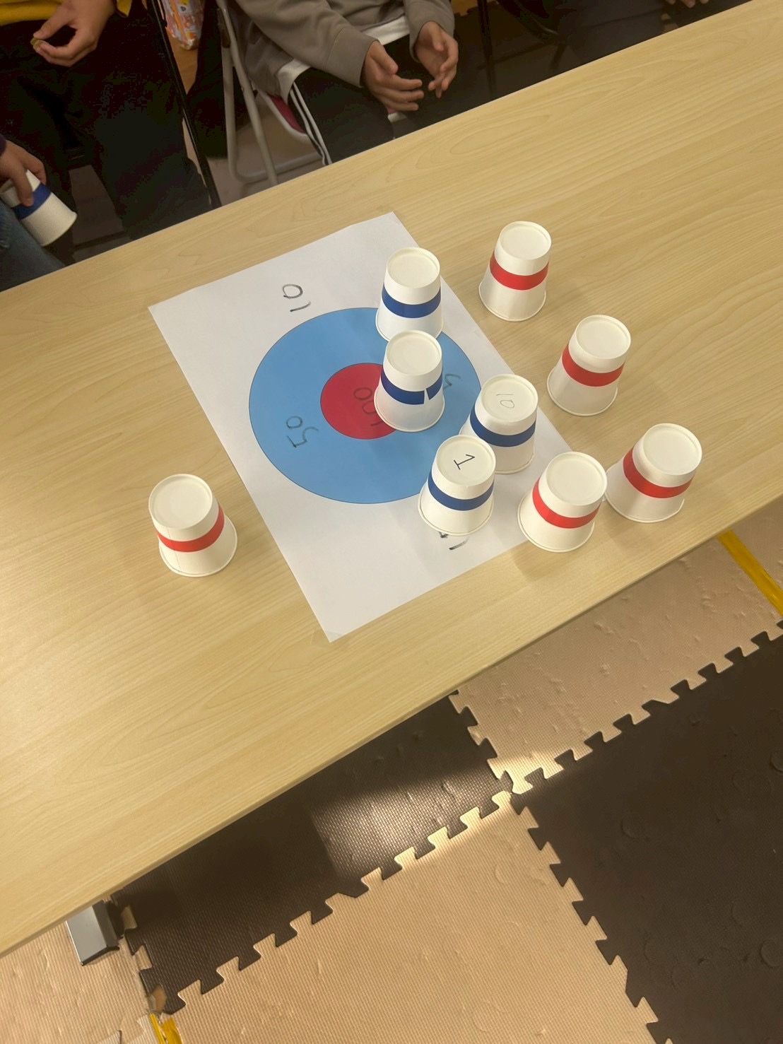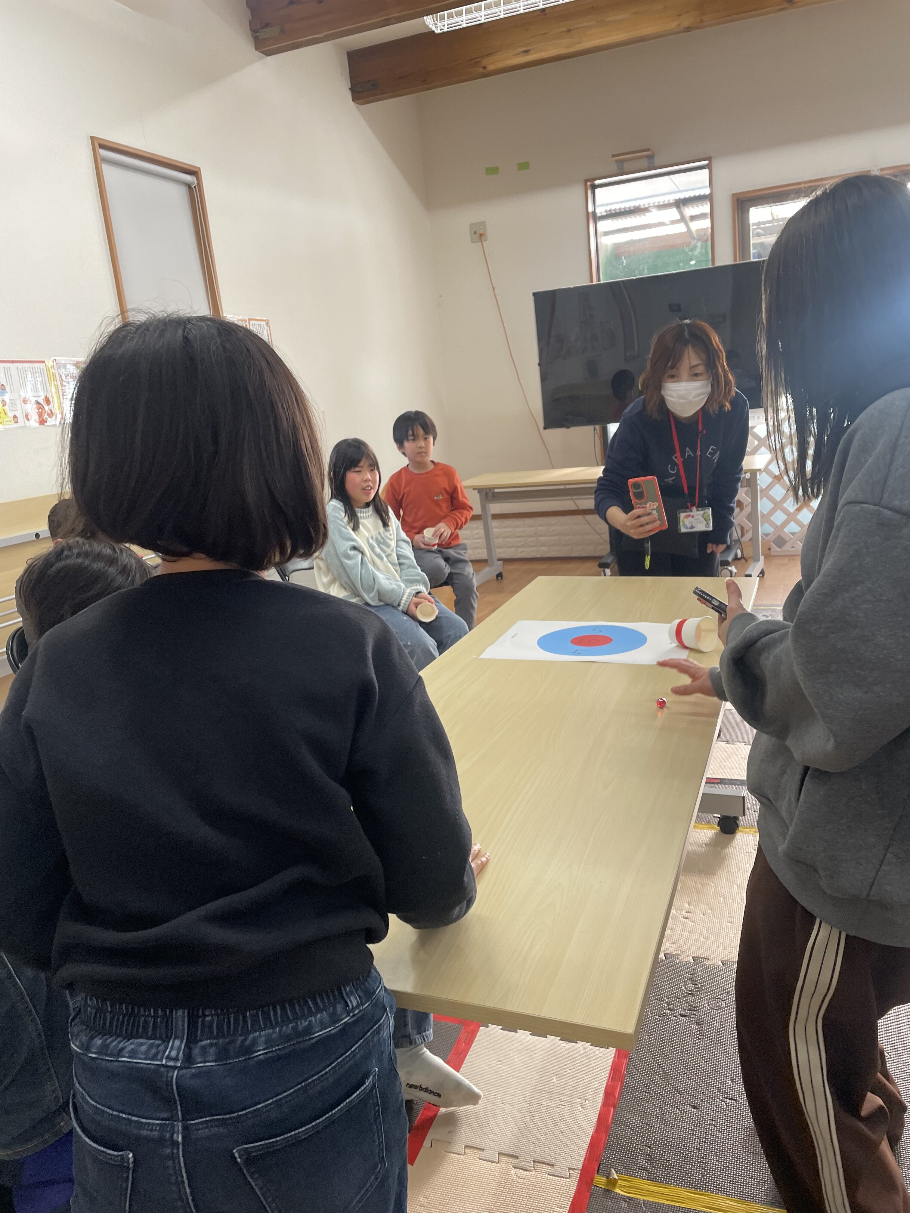 3回戦目はひとつの的に向かってみんなが投げます🥌前の人が置いた紙コップもそのままになるので、どこを狙うか戦略が試されます💡