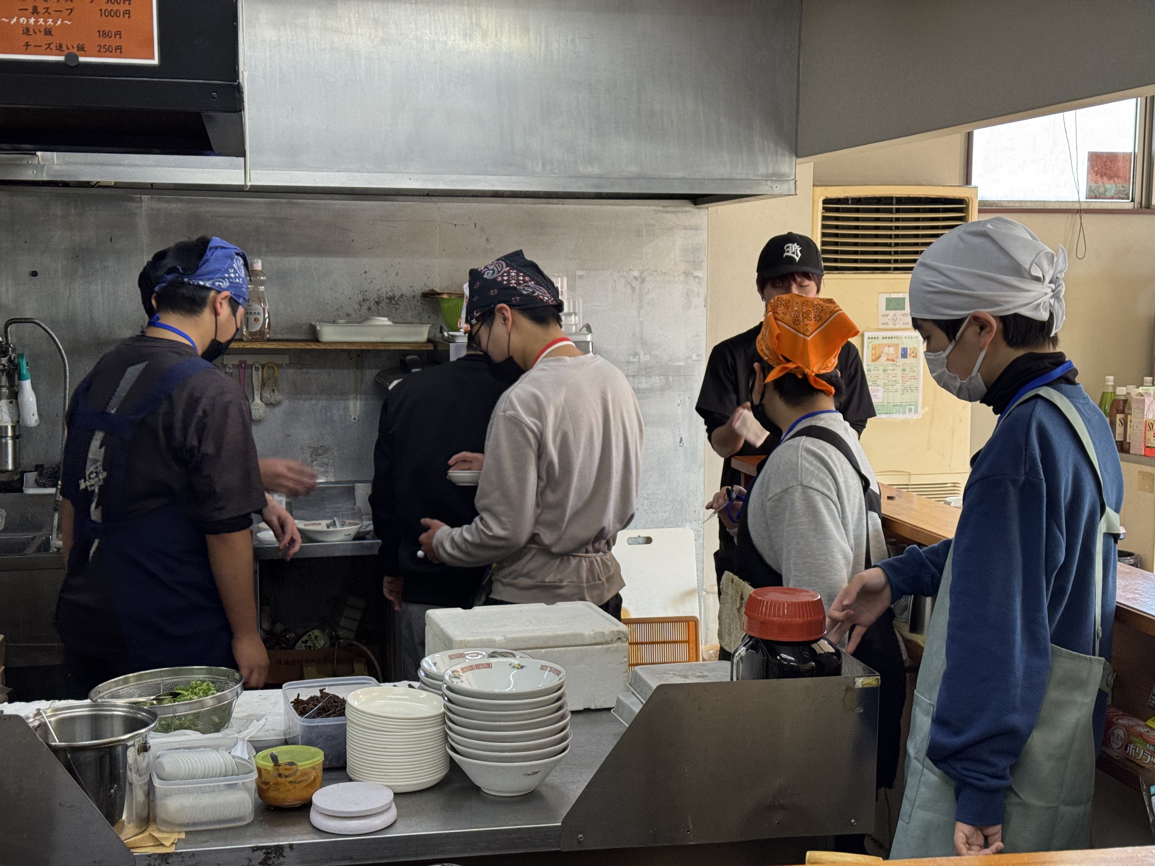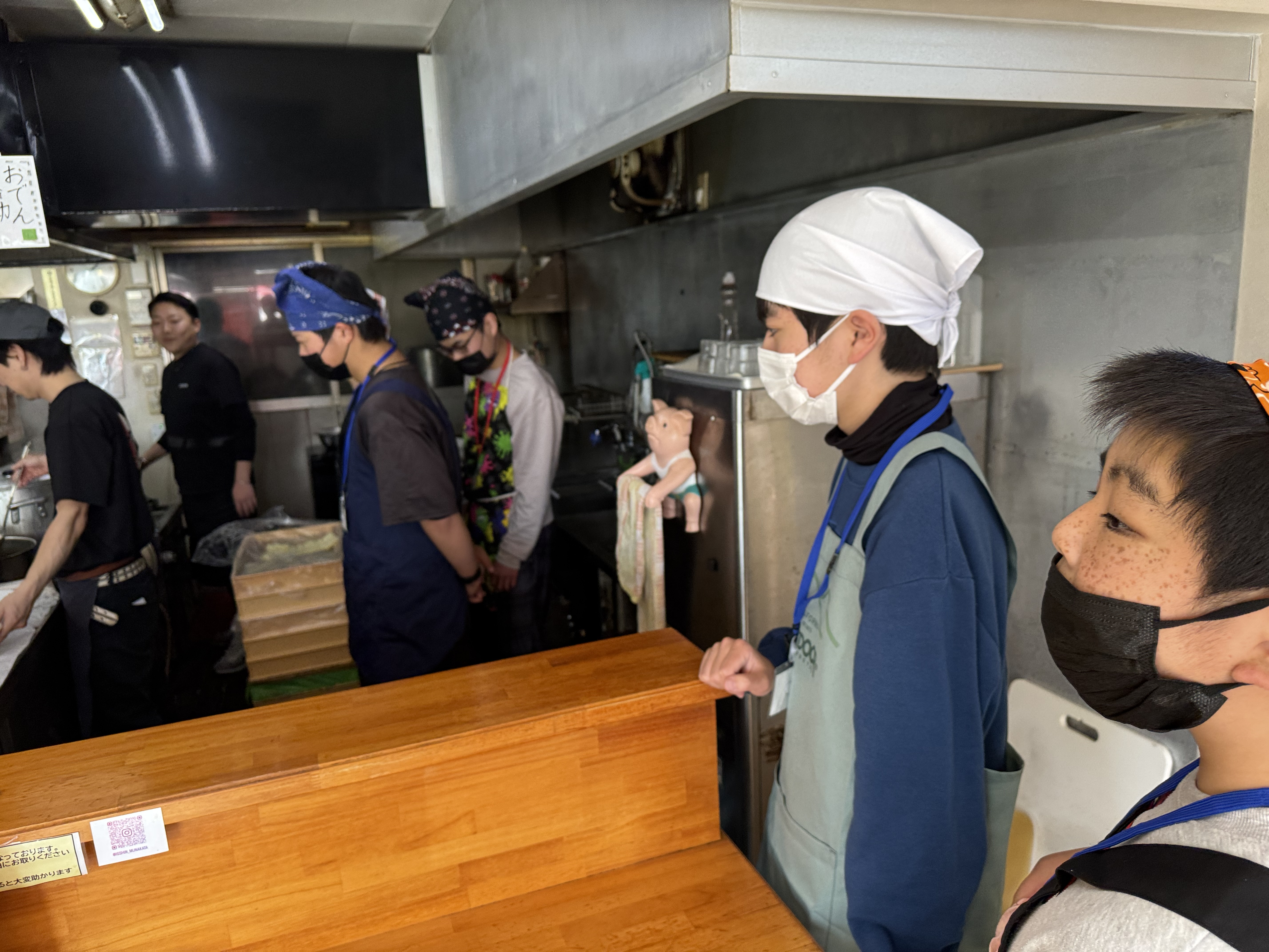 ラーメンが出来上がるまでの工程を見学し、厨房の動きやスタッフの方々の連携にも興味津々の様子でした🤭
