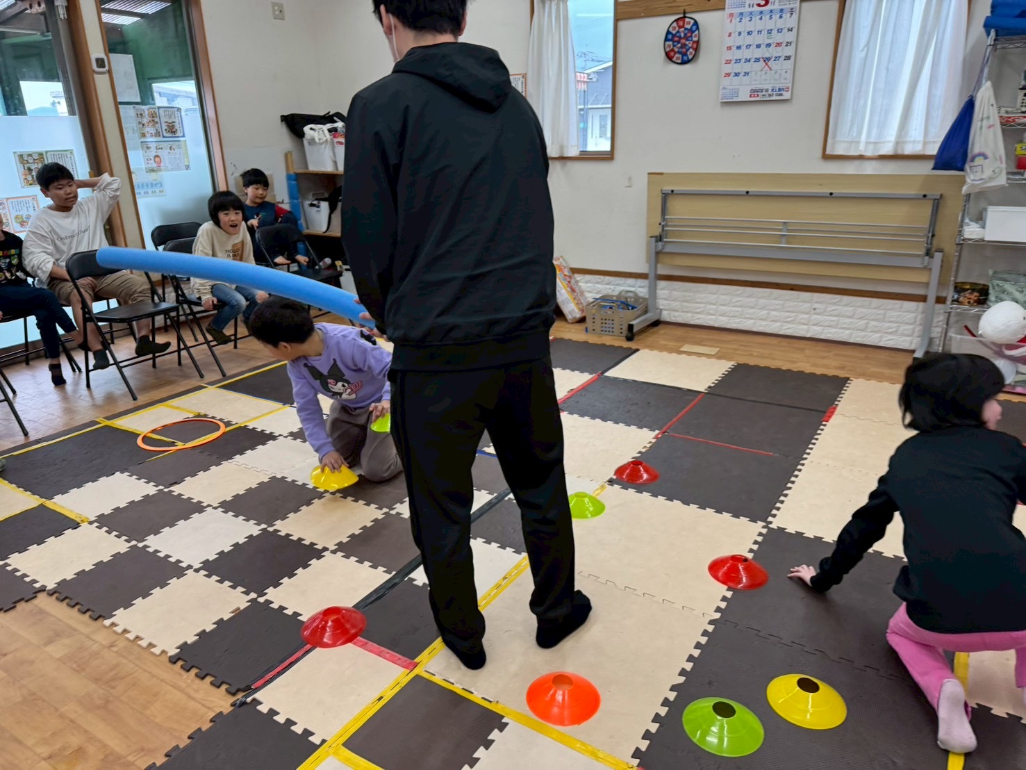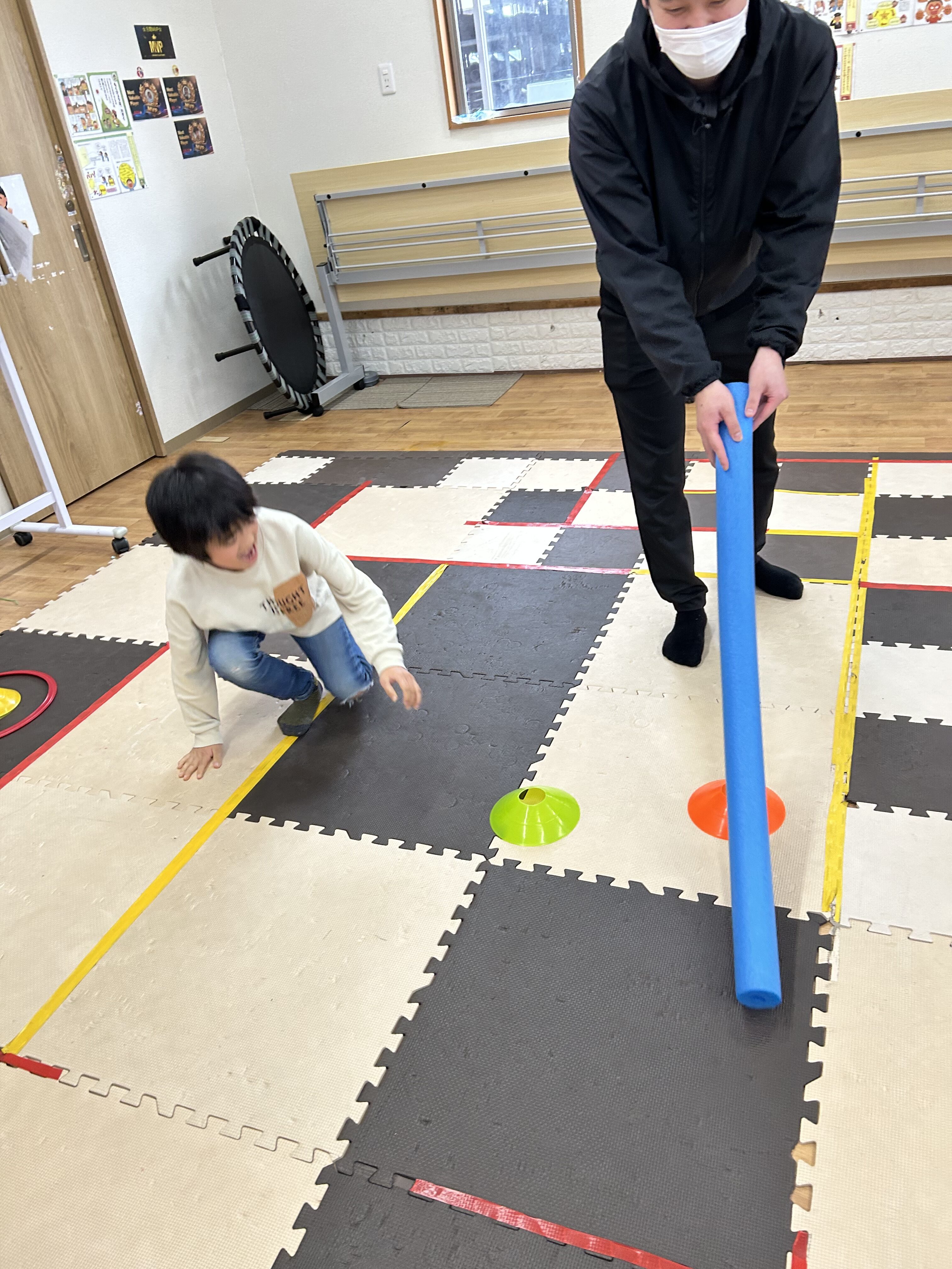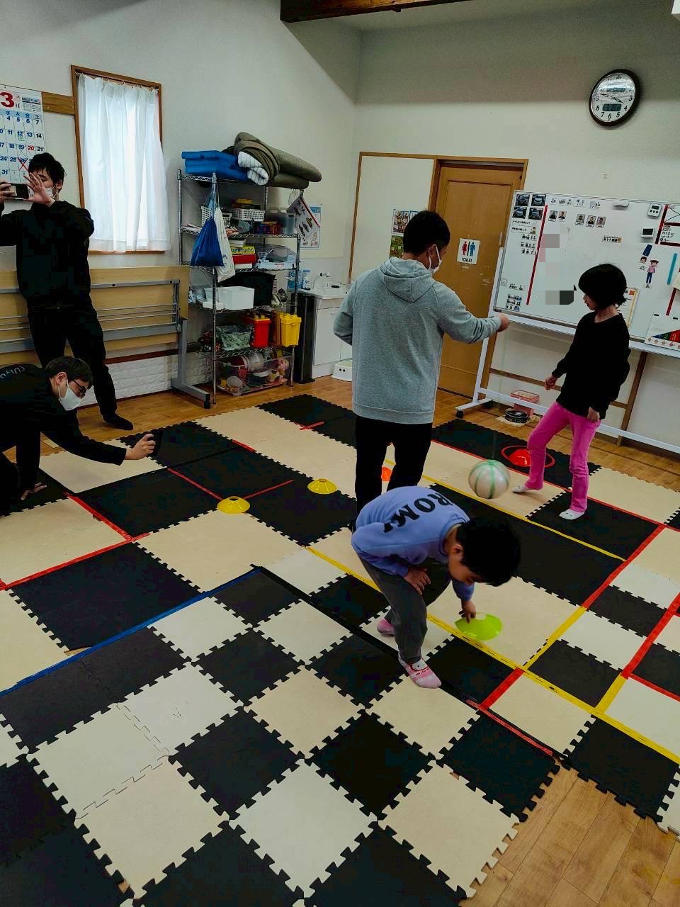 今日の運動療育はボールや棒を避けながらマーカーを回収する運動活動です‼️