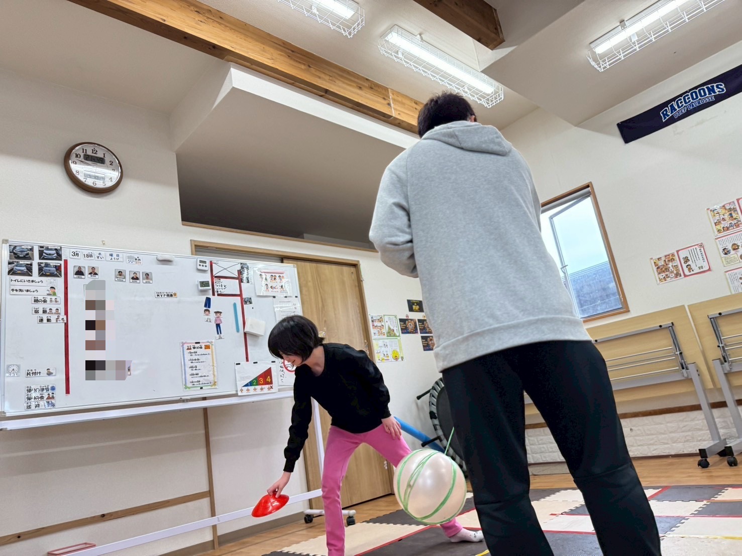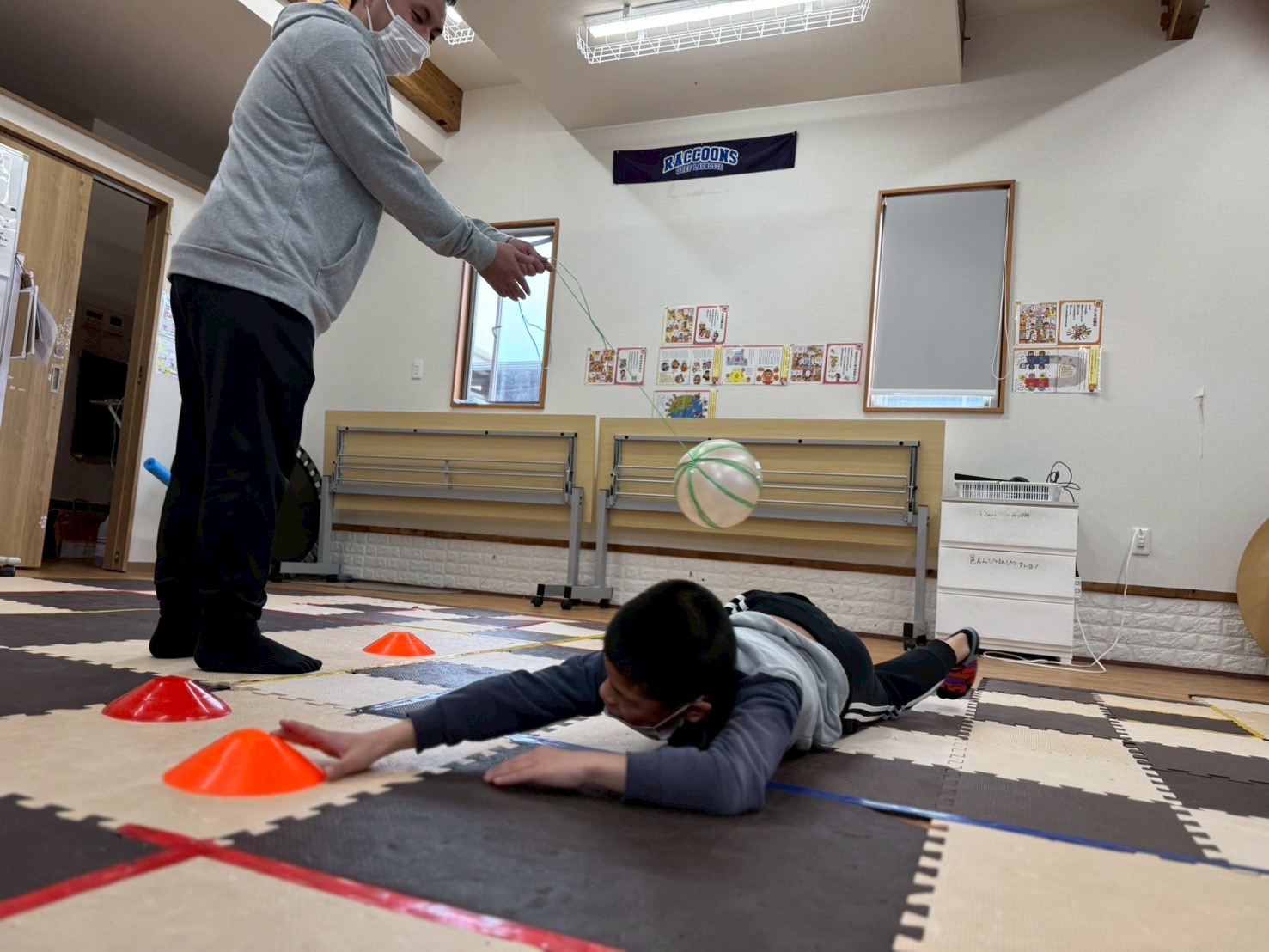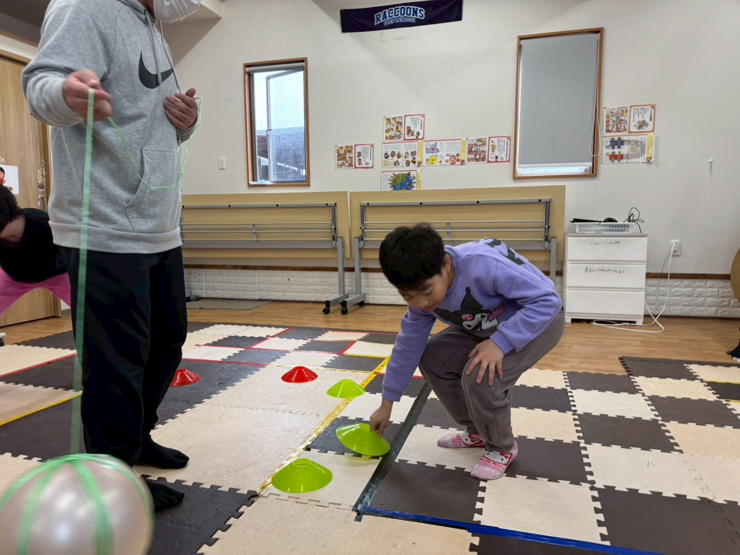 今日の運動療育はボールや棒を避けながらマーカーを回収する運動活動です‼️