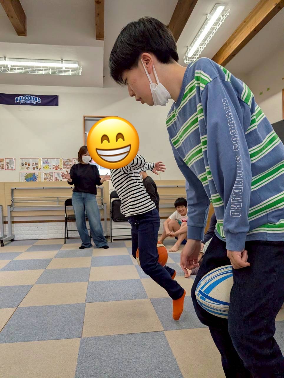 本日は足に挟むボールは公平にくじを引いて決めました🏈🏀🏐