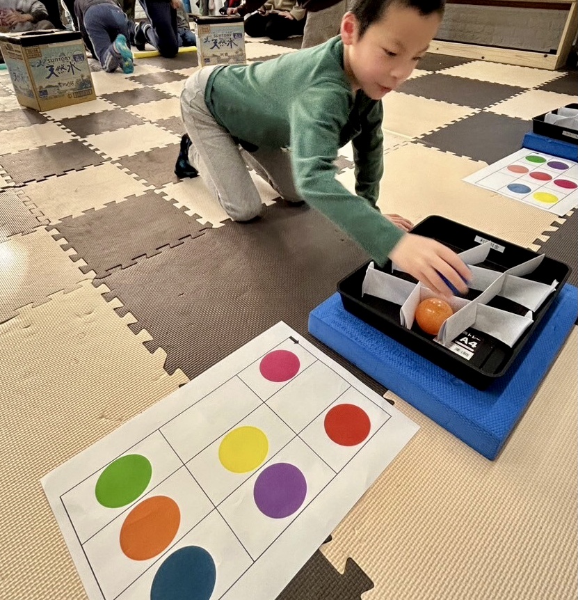 今日は運動療育で、カラーボールを使った