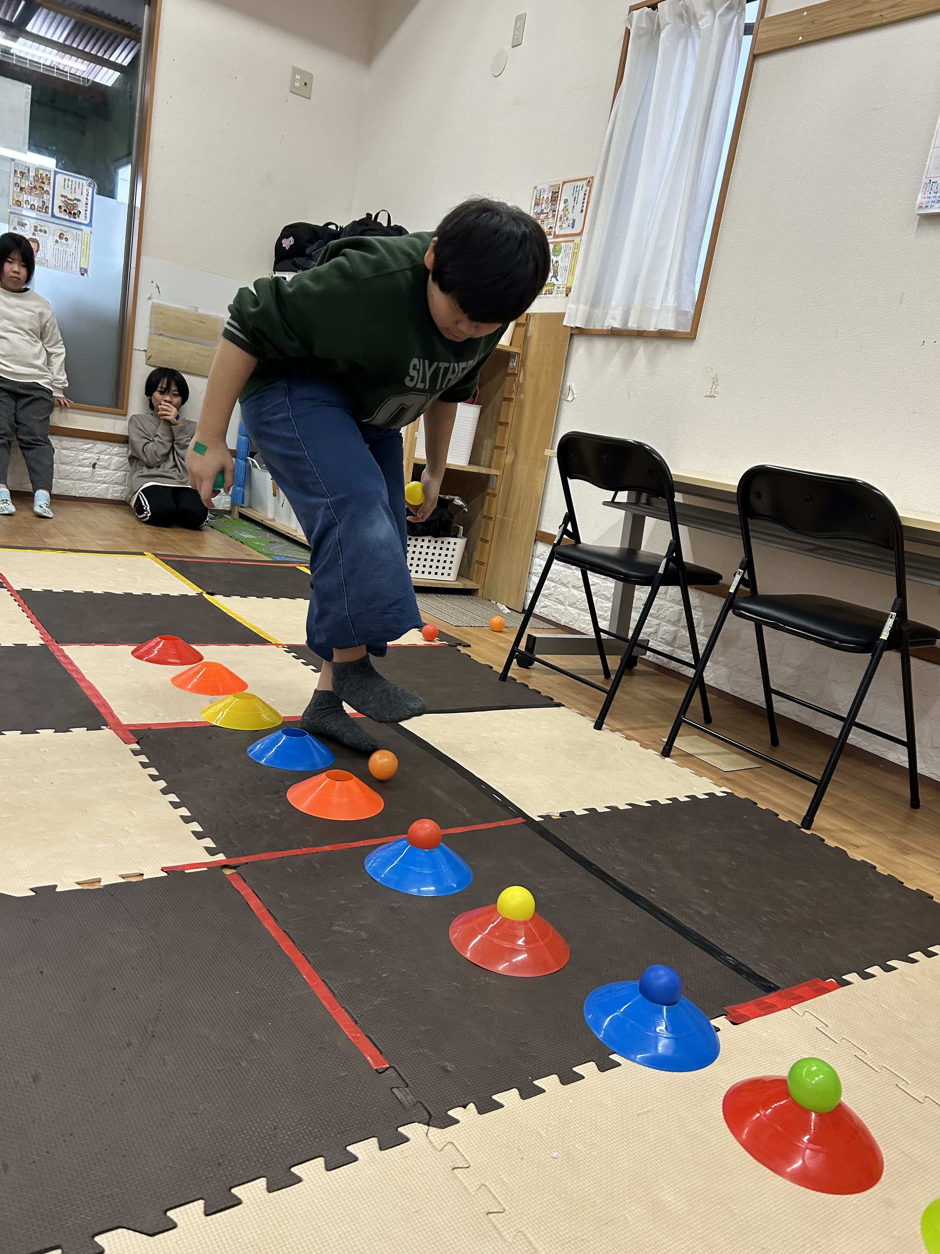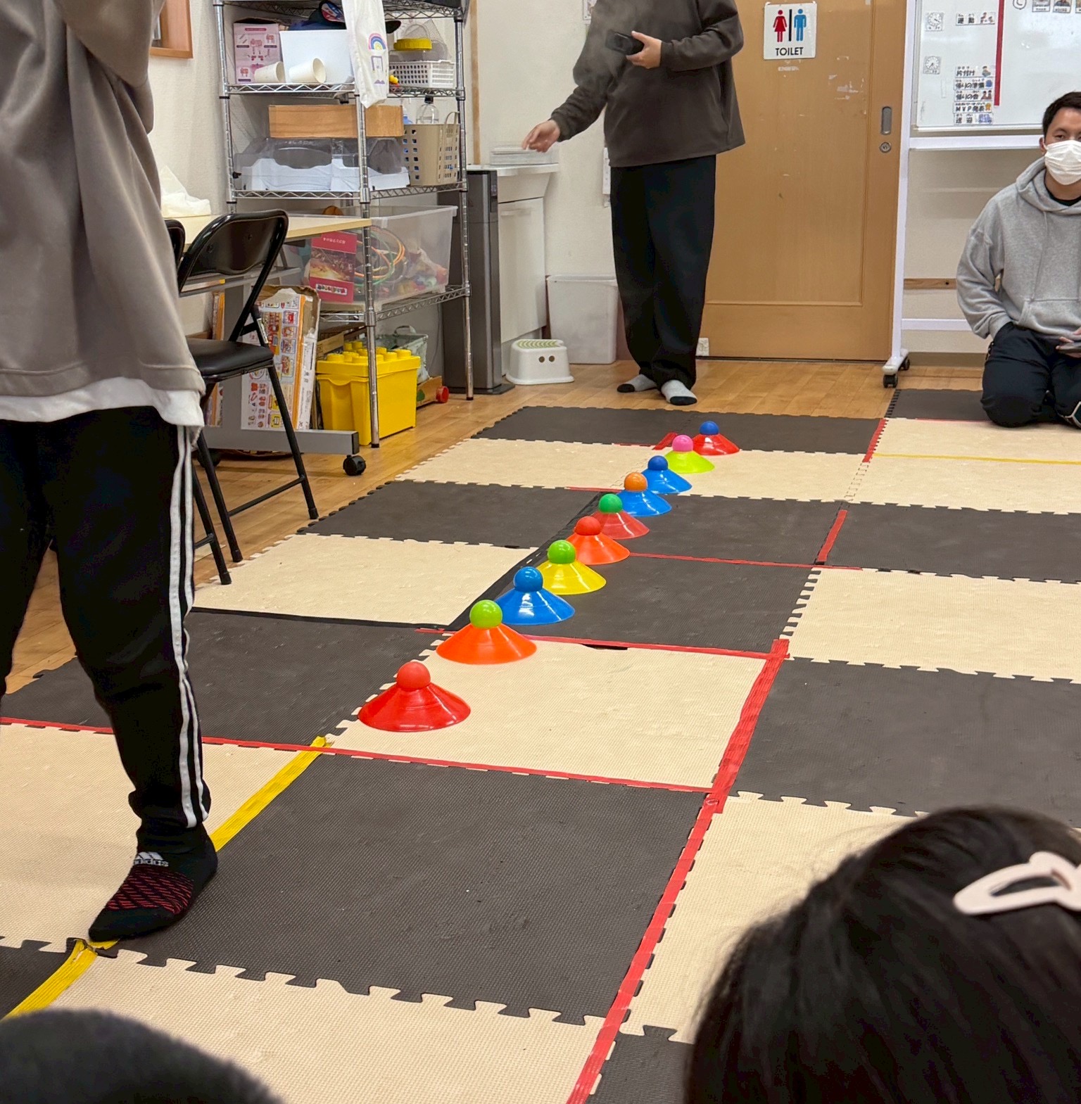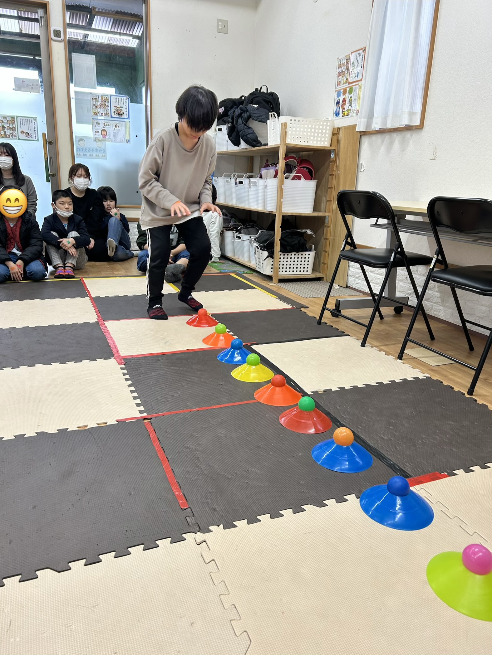 こちらはまずカラーボールを縦に並べます🔴🔵対象者は両手の手の甲に違う色のシールを貼り待ちます‼️ボールを並べられたら先生の合図で並べられたボールを手の甲に貼ったシールと同じカラーは取る‼️手の甲にない色は足で蹴るといった内容です✨頭で考えながら動きと連動させる運動です💪