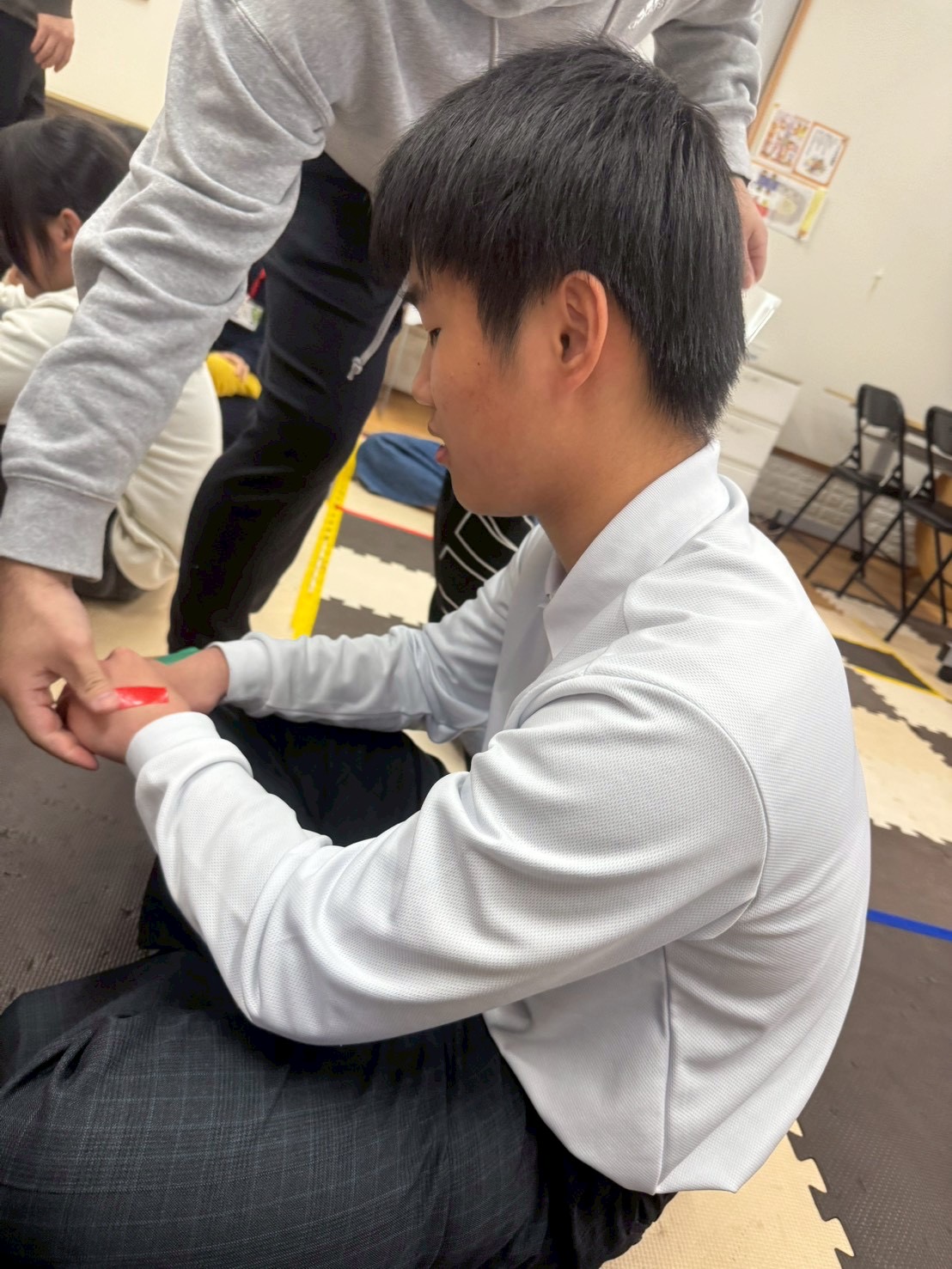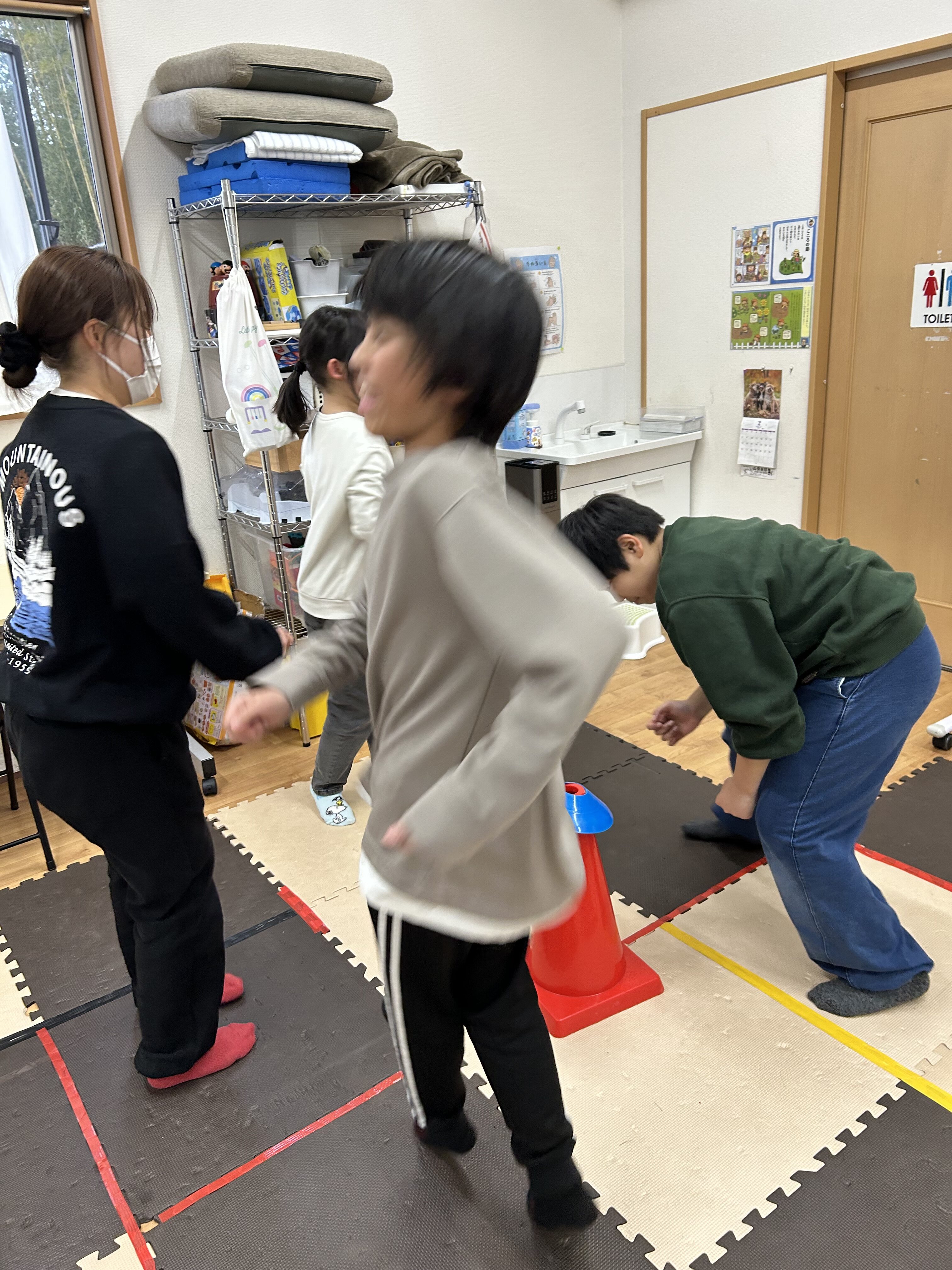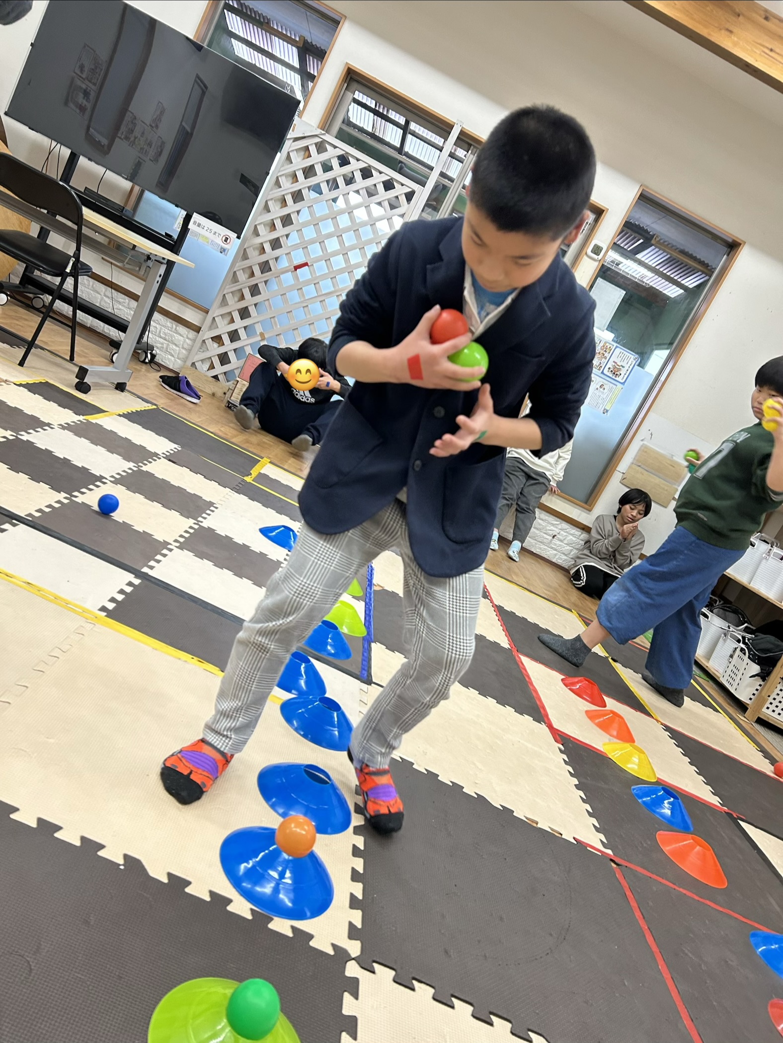 こちらはまずカラーボールを縦に並べます🔴🔵対象者は両手の手の甲に違う色のシールを貼り待ちます‼️ボールを並べられたら先生の合図で並べられたボールを手の甲に貼ったシールと同じカラーは取る‼️手の甲にない色は足で蹴るといった内容です✨頭で考えながら動きと連動させる運動です💪
