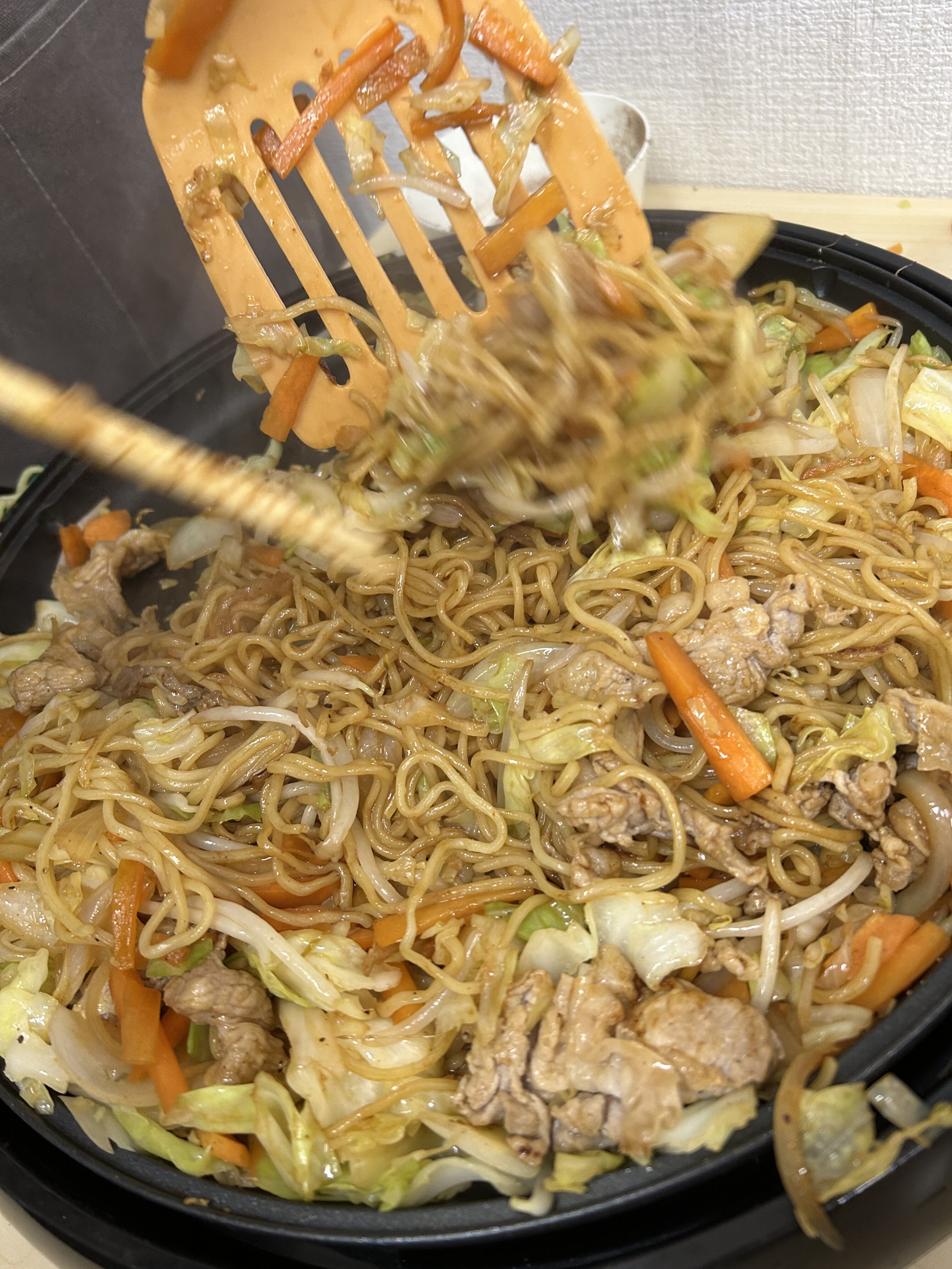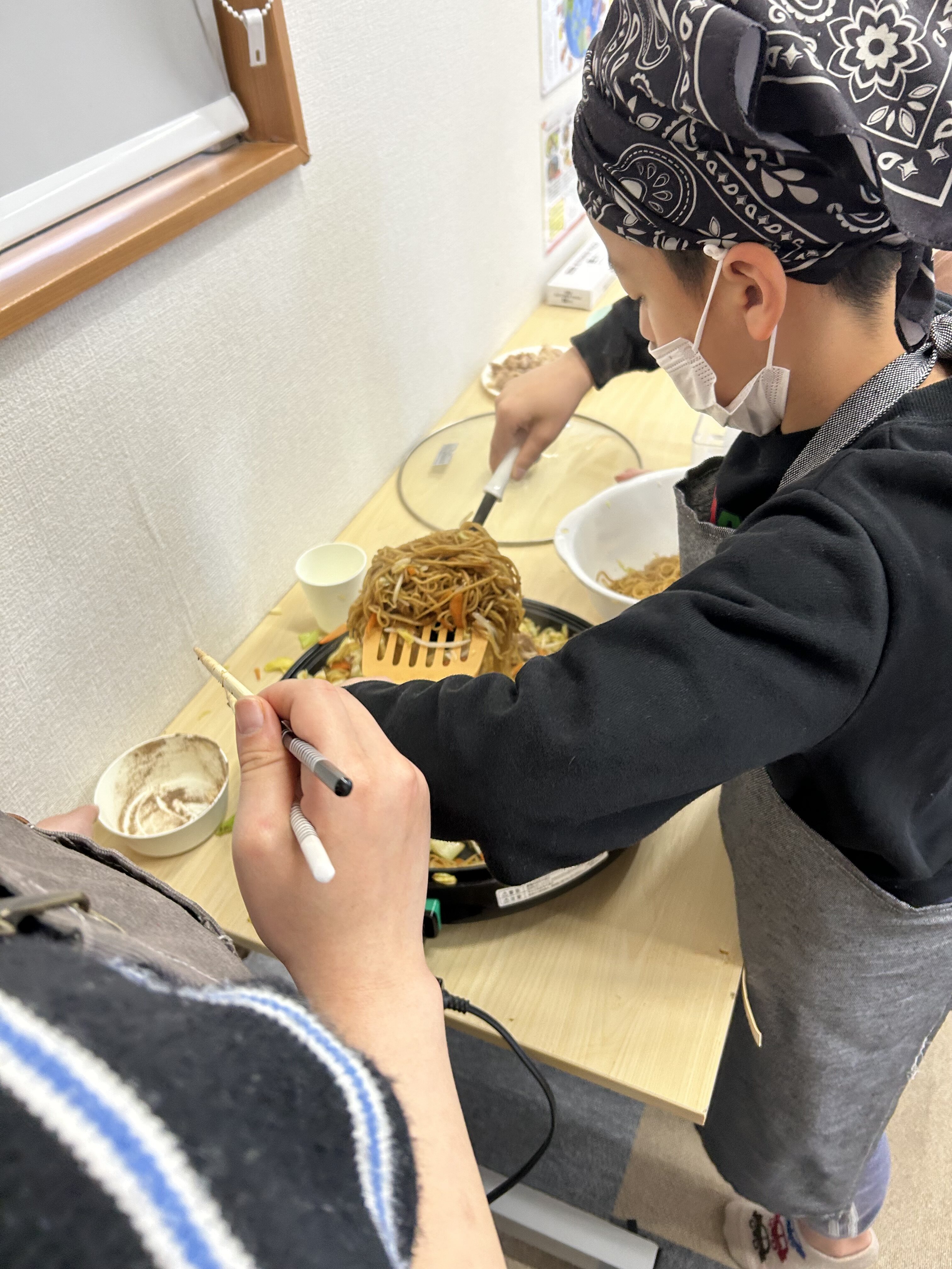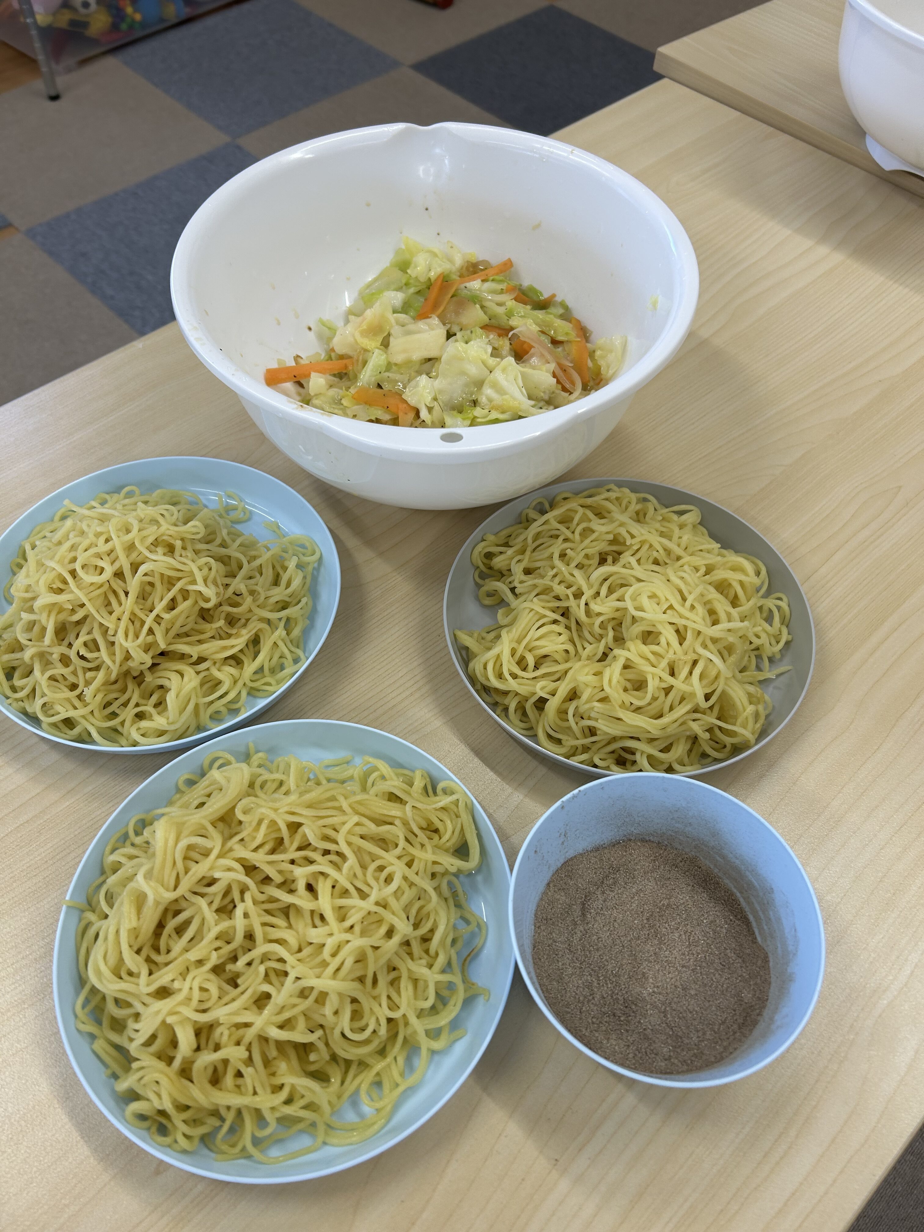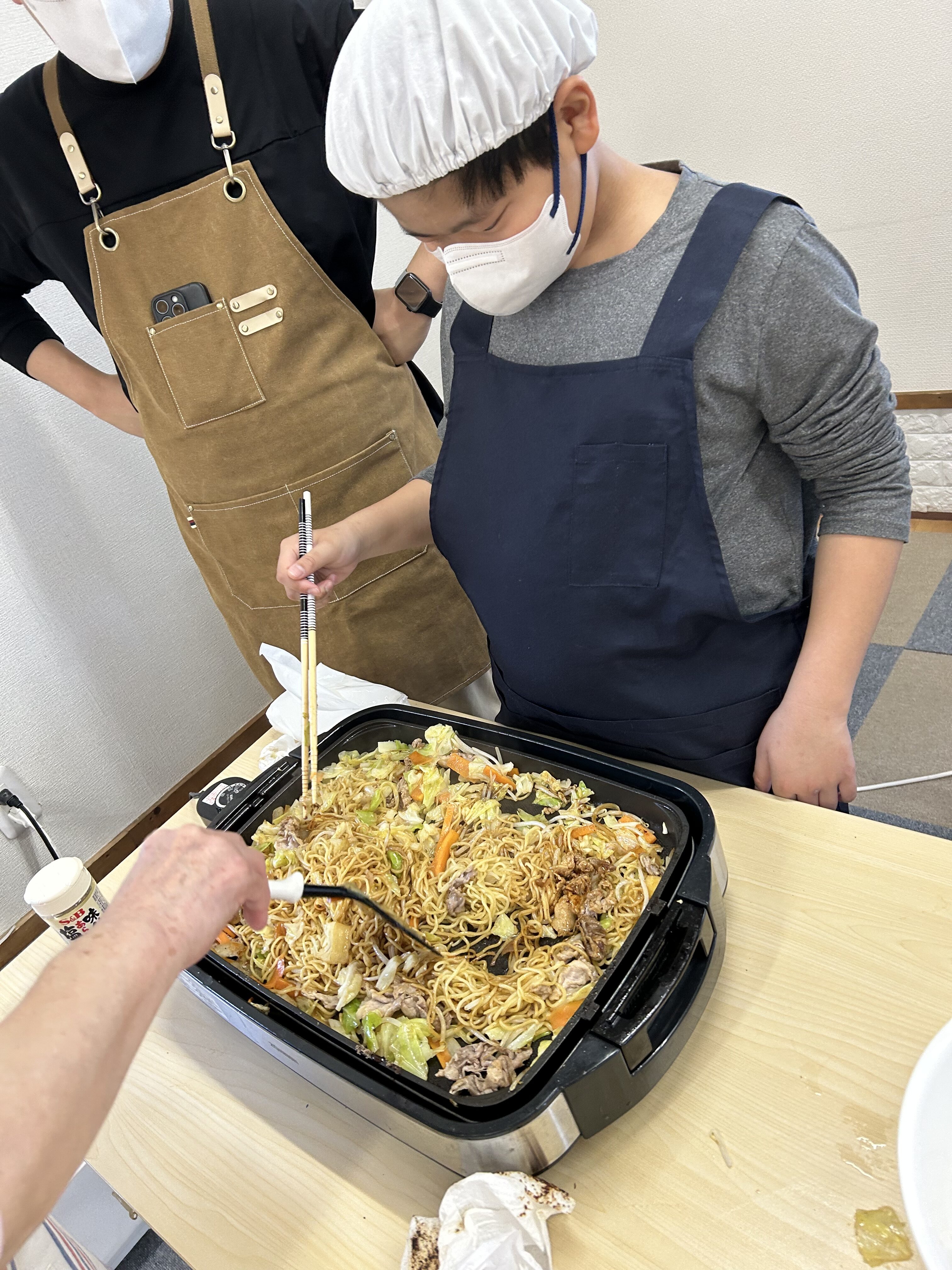 完璧に混ぜ合わせる事ができたら完成✨みんなで協力して作った焼きそばが出来ました‼️
