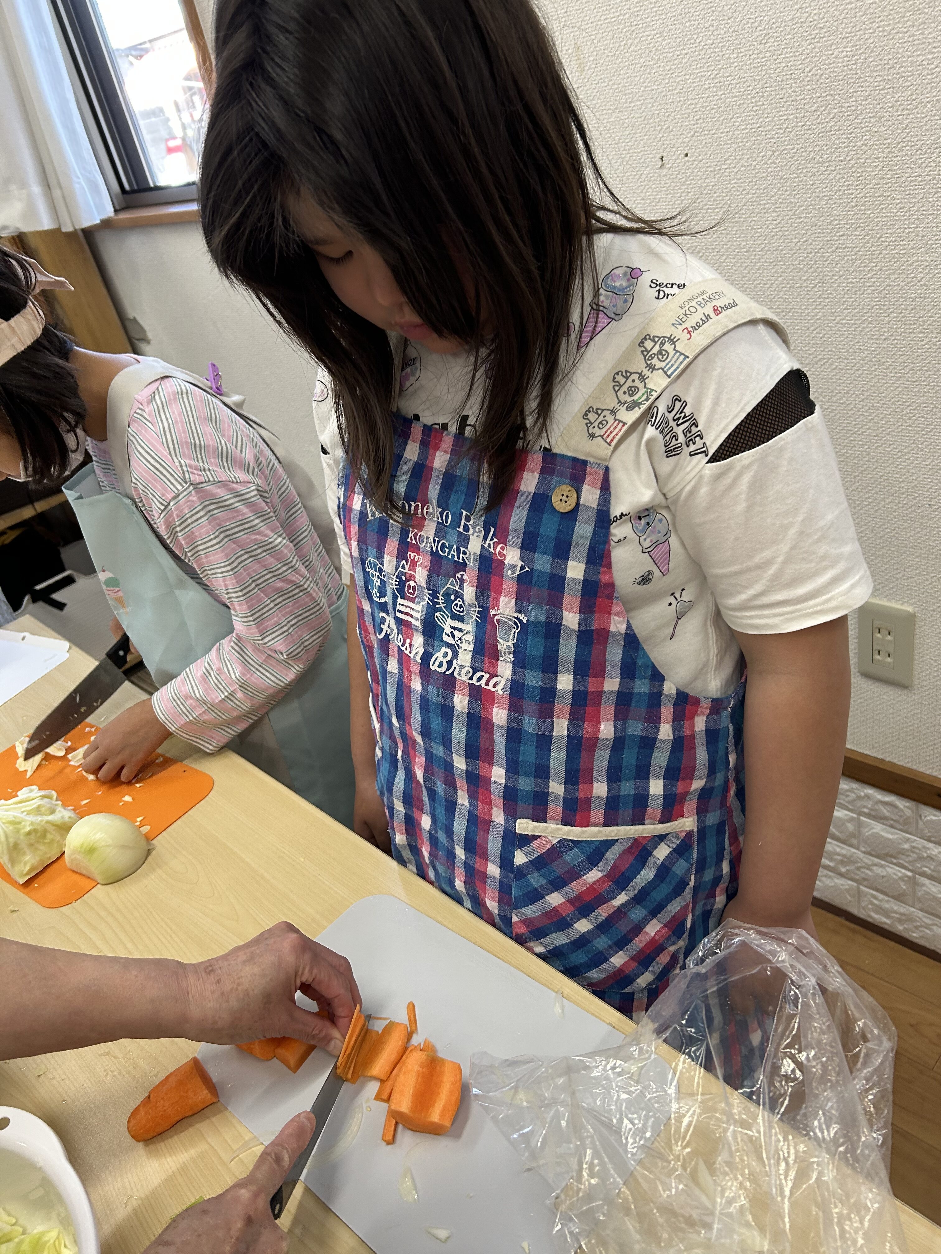 先生から切り方を教わって、食べやすいサイズに野菜を細かく切ります👍