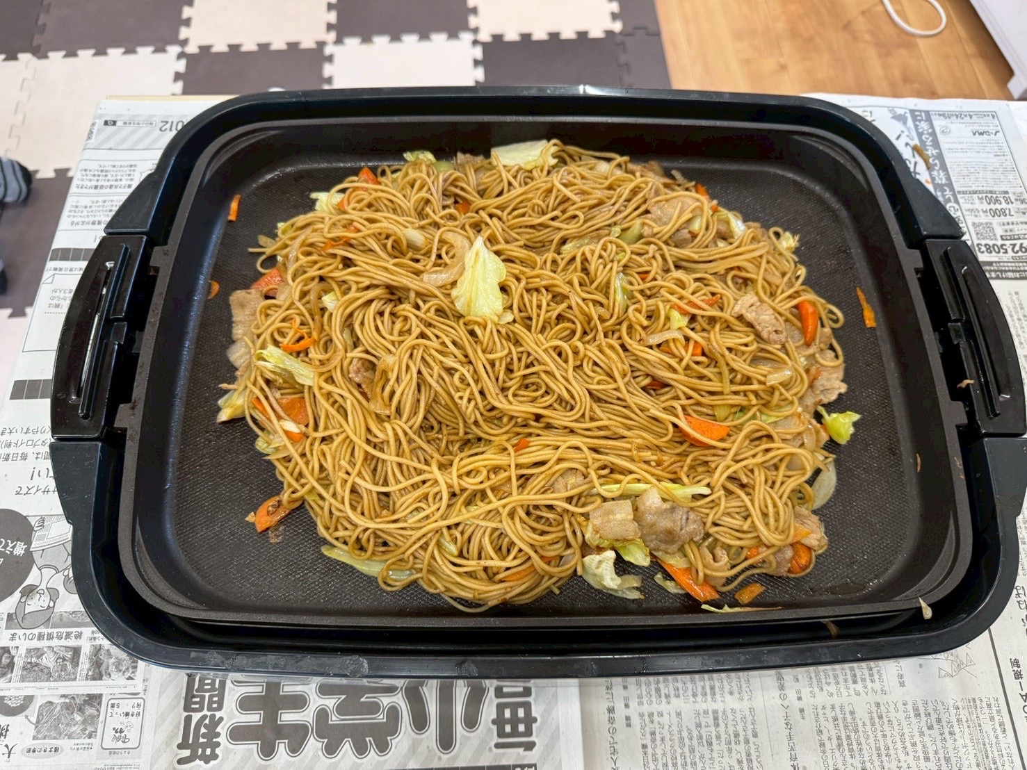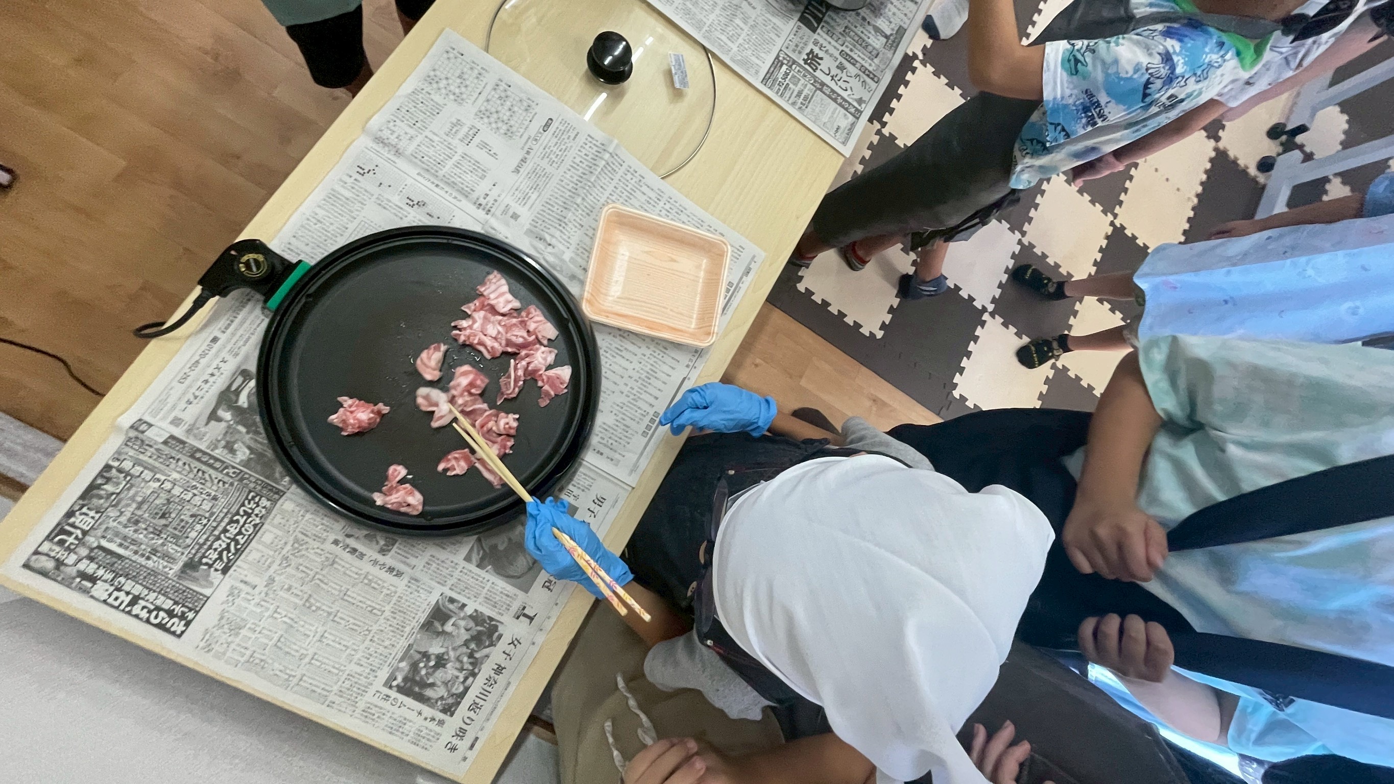 準備ができたら、いよいよホットプレートの出番😸お肉を炒め、火が通ったら野菜を入れていきます🥕