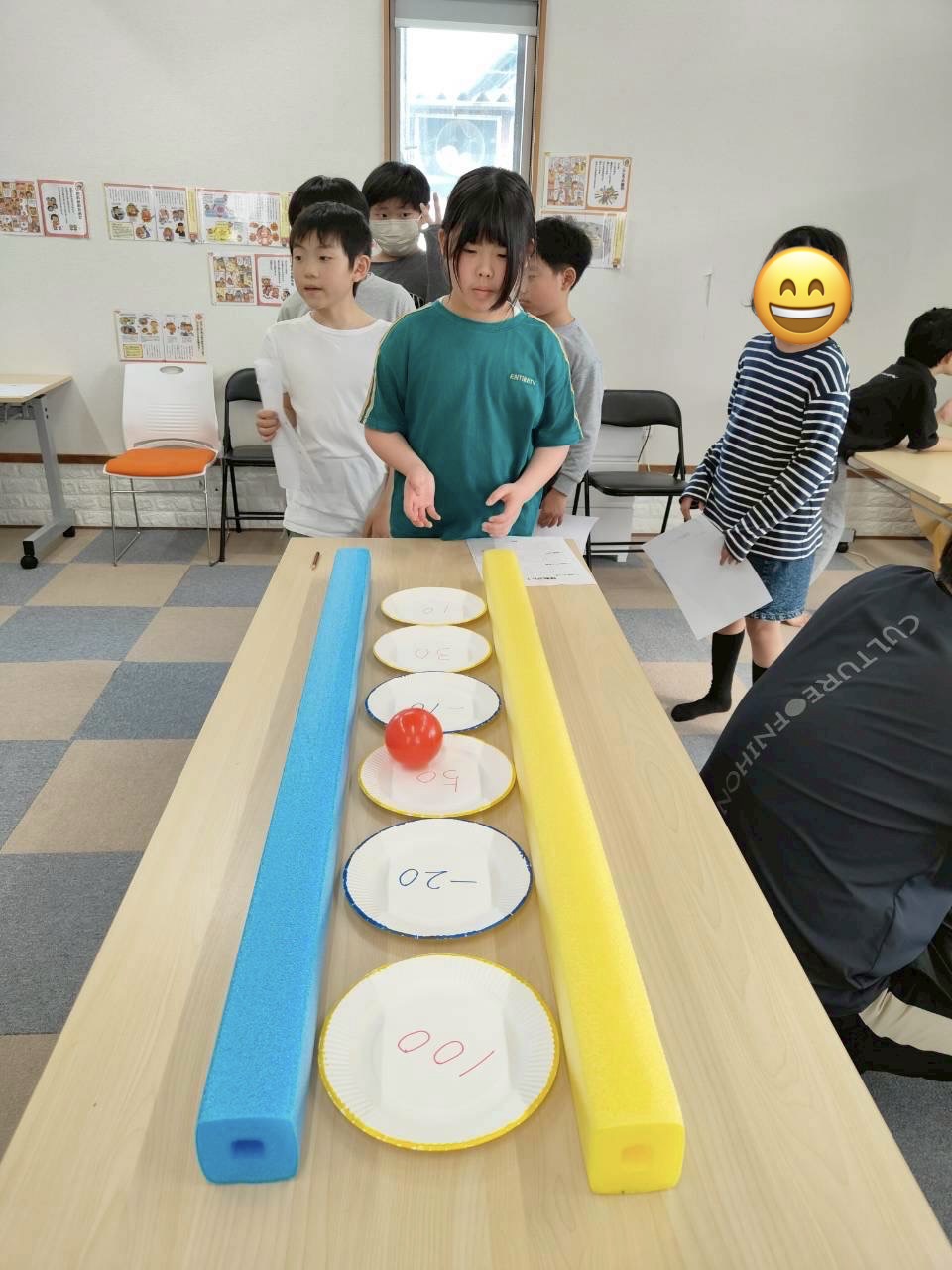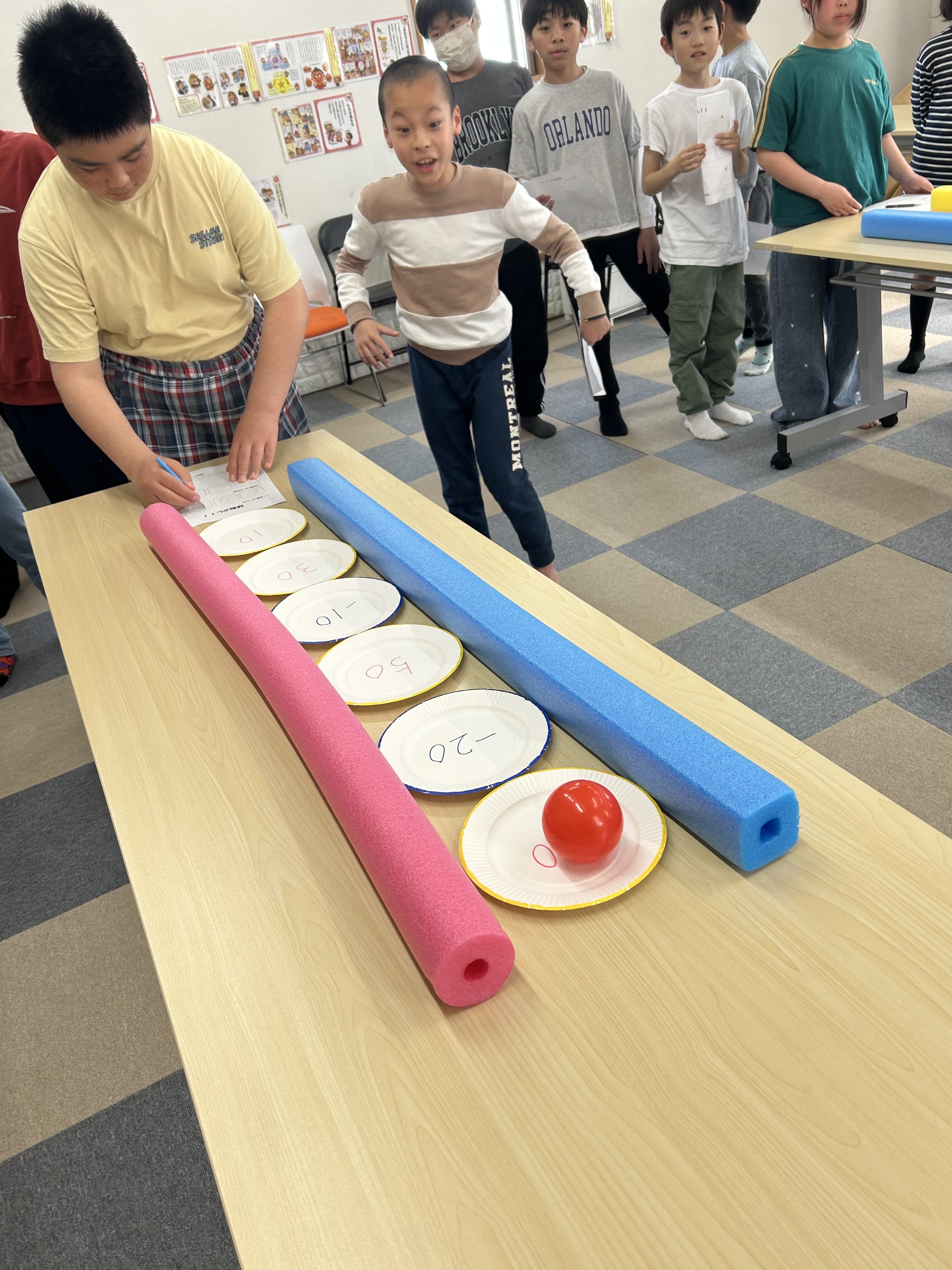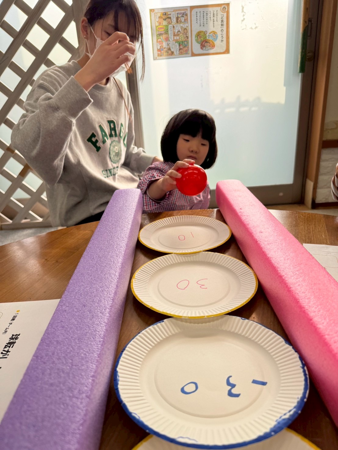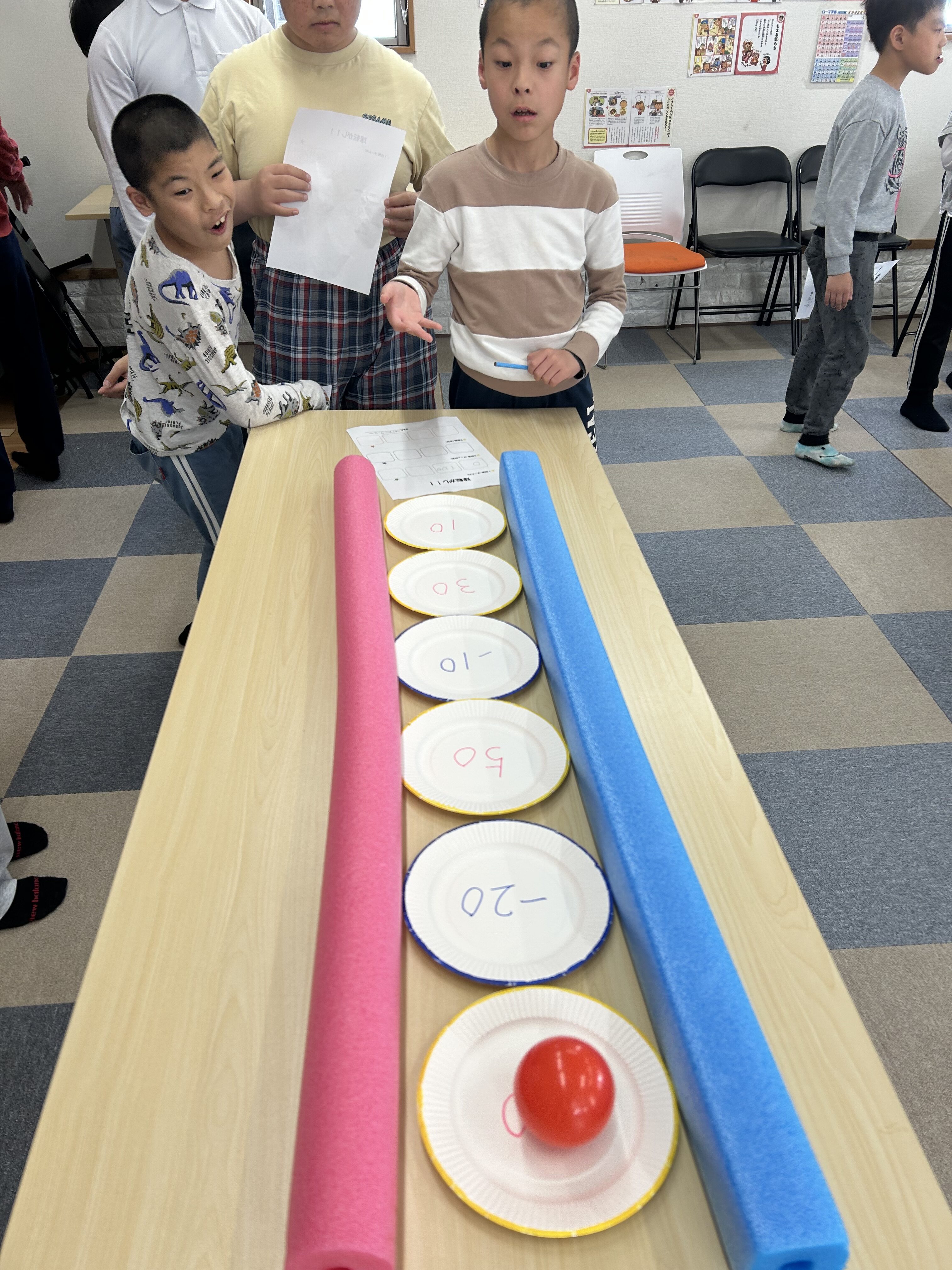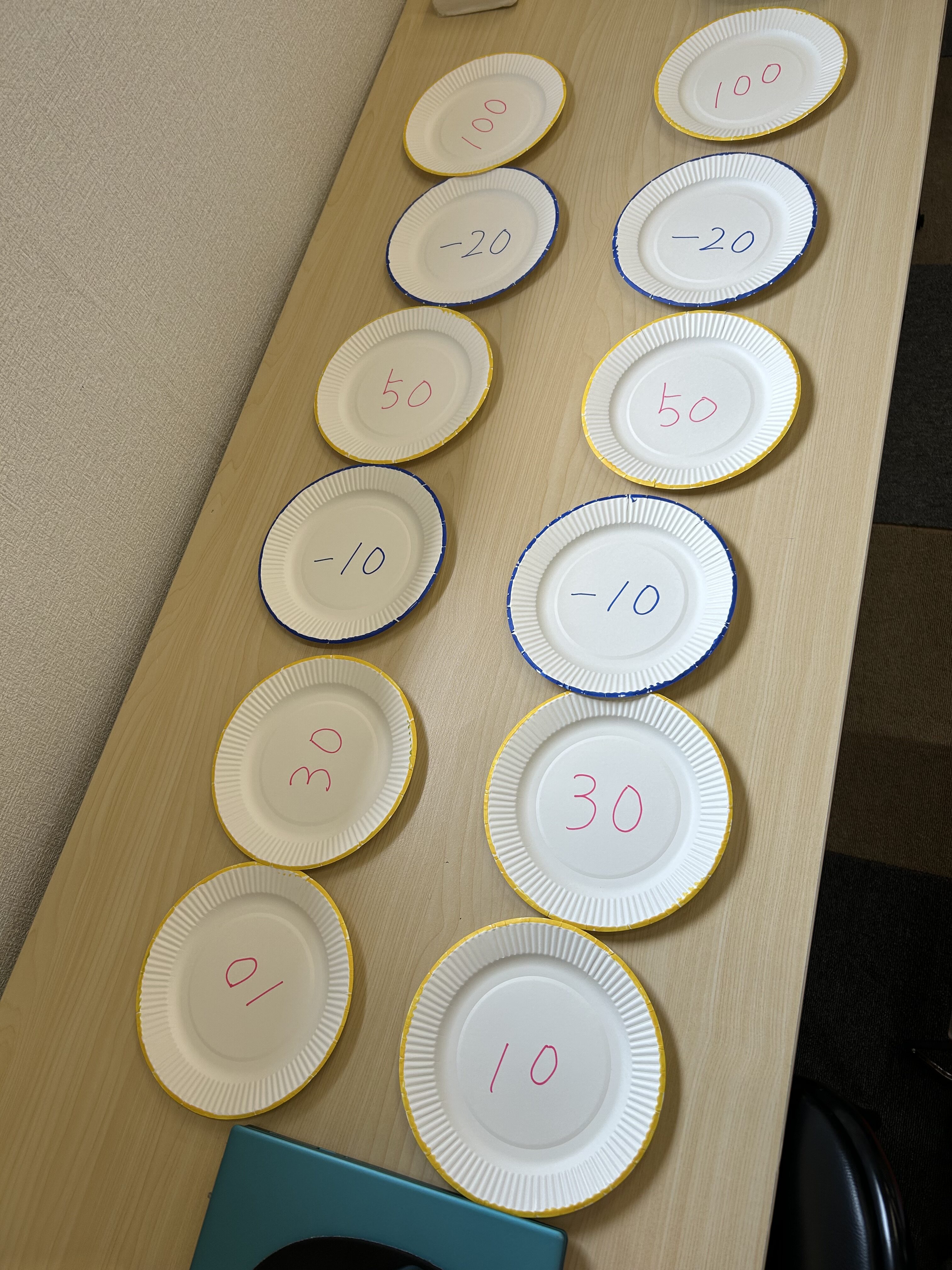 このように紙皿を並べて、この上にボールを転がして高得点を狙います🤔
