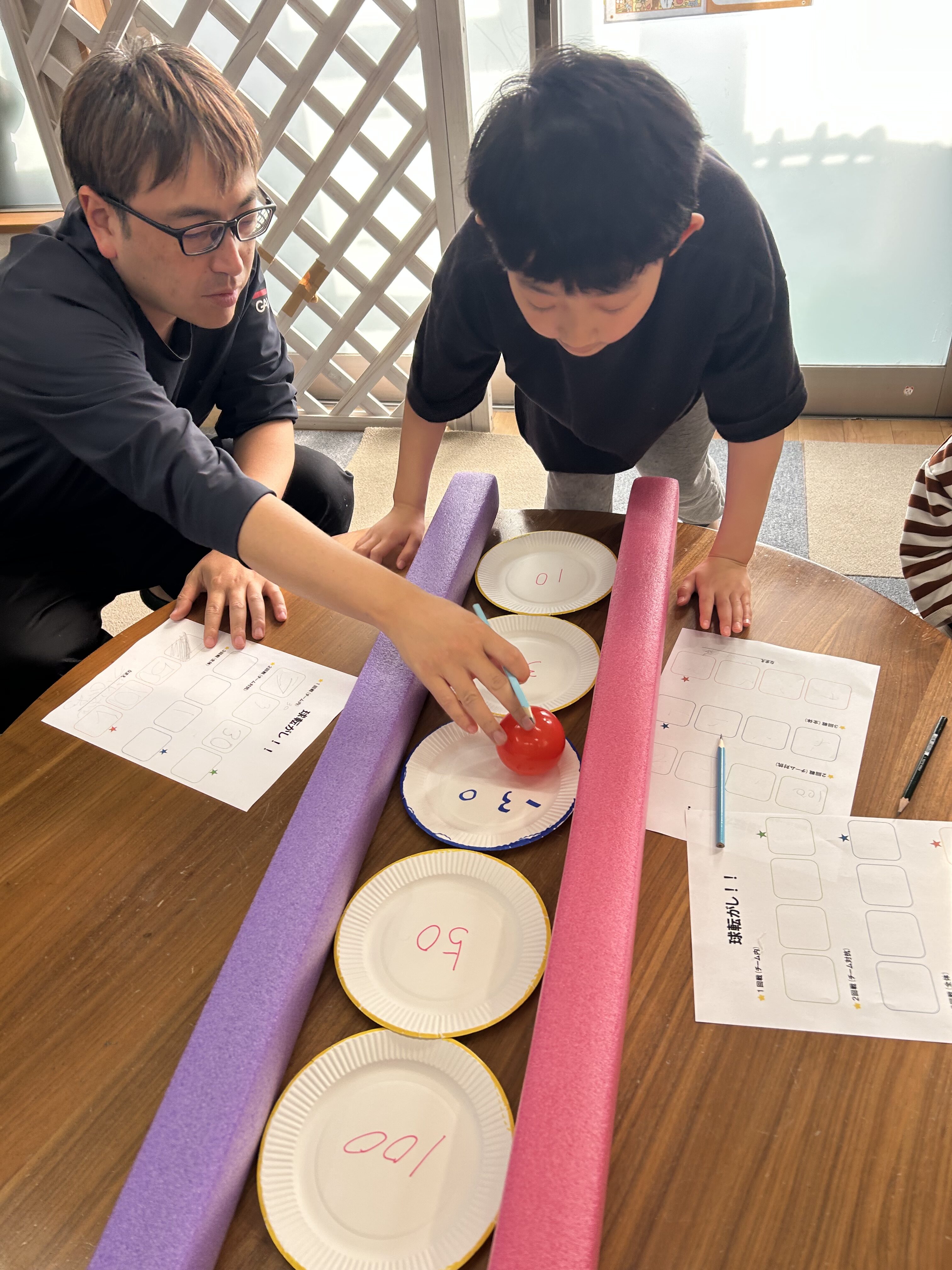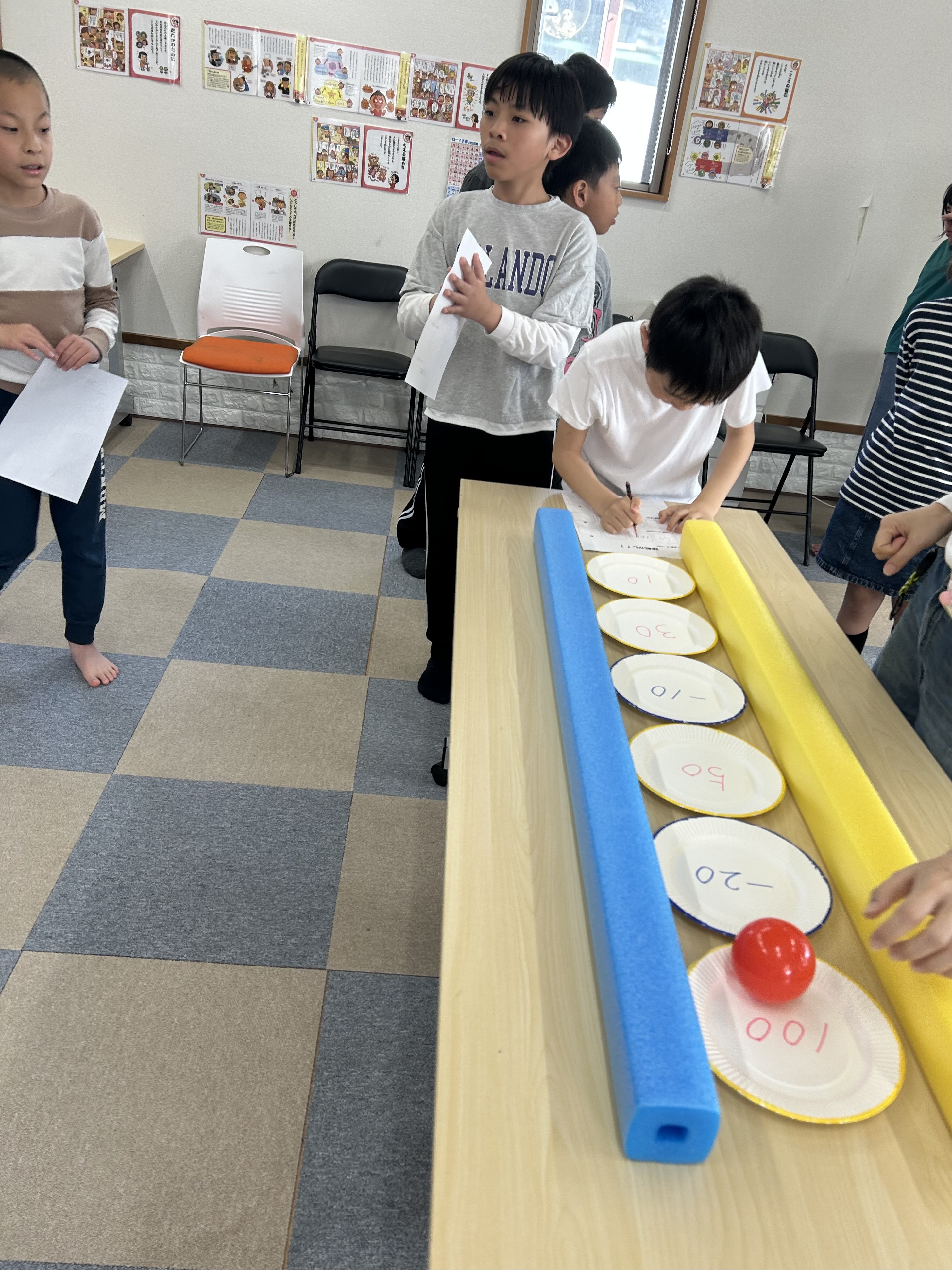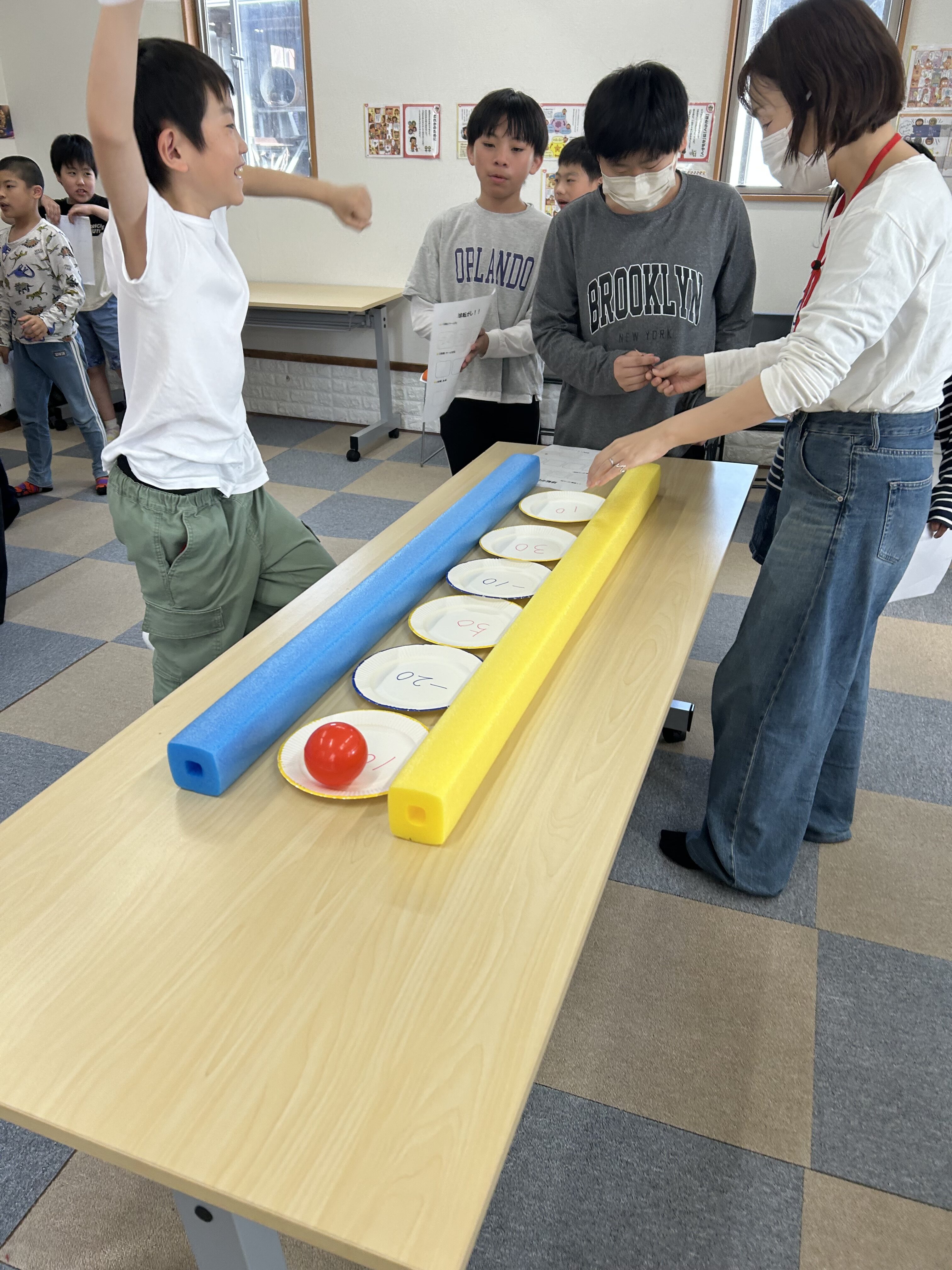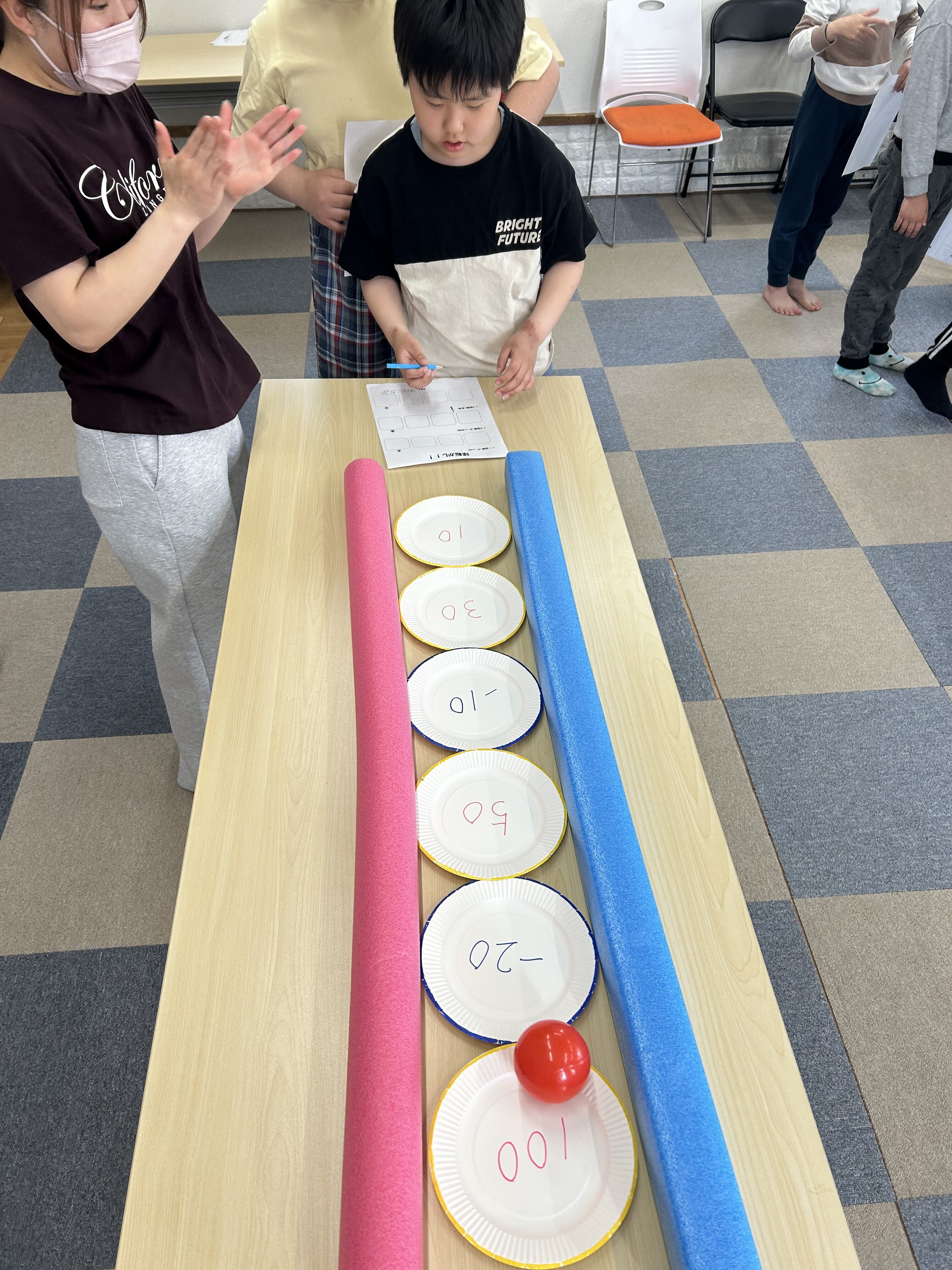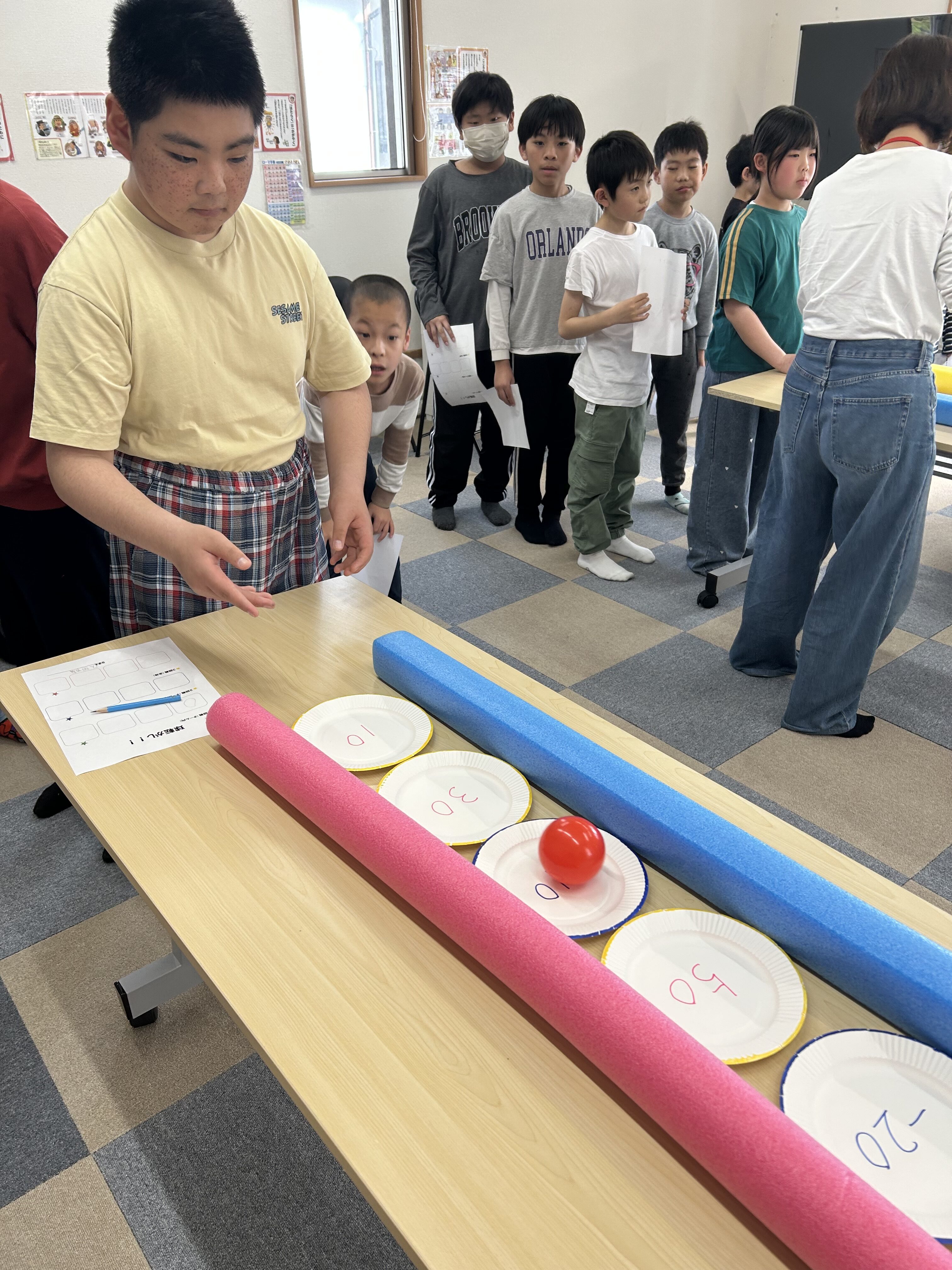 このように紙皿を並べて、この上にボールを転がして高得点を狙います🤔