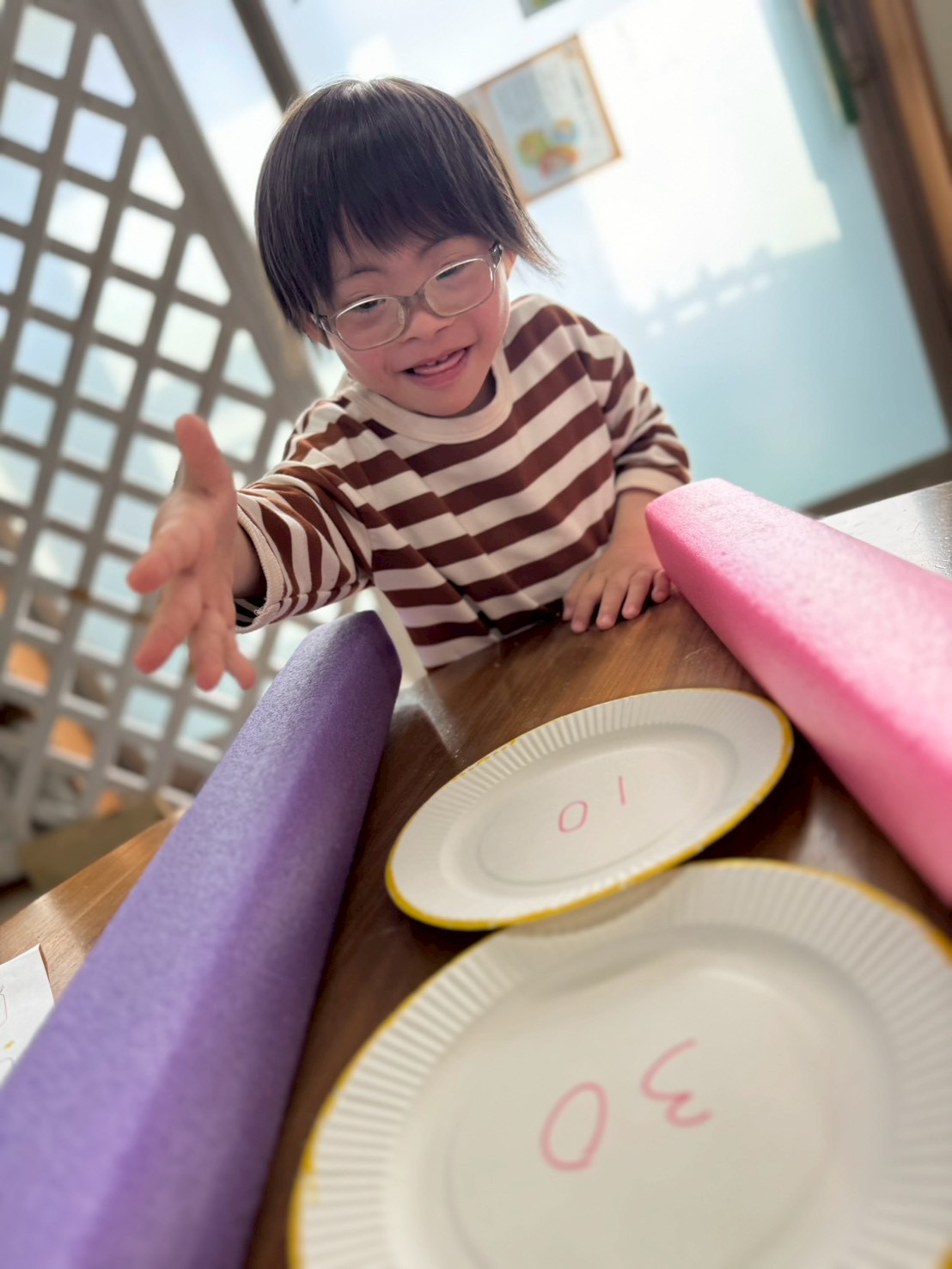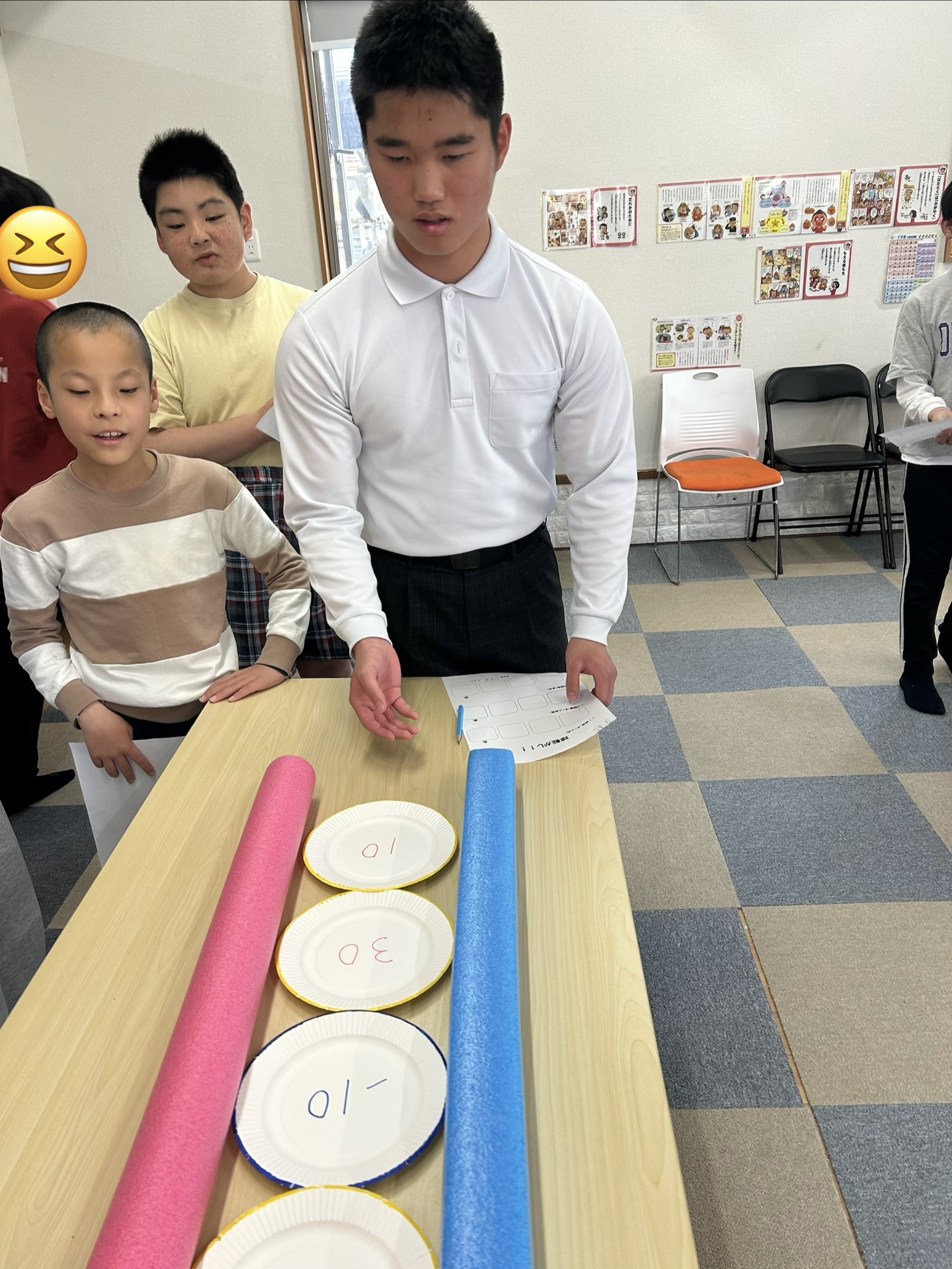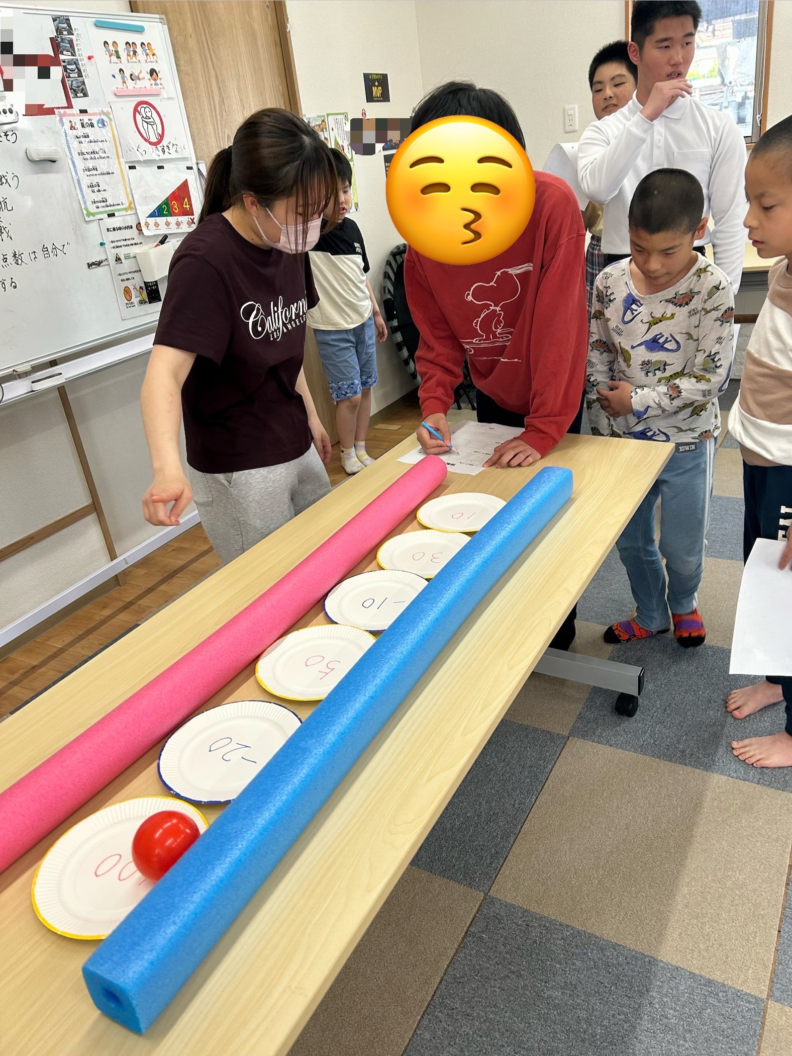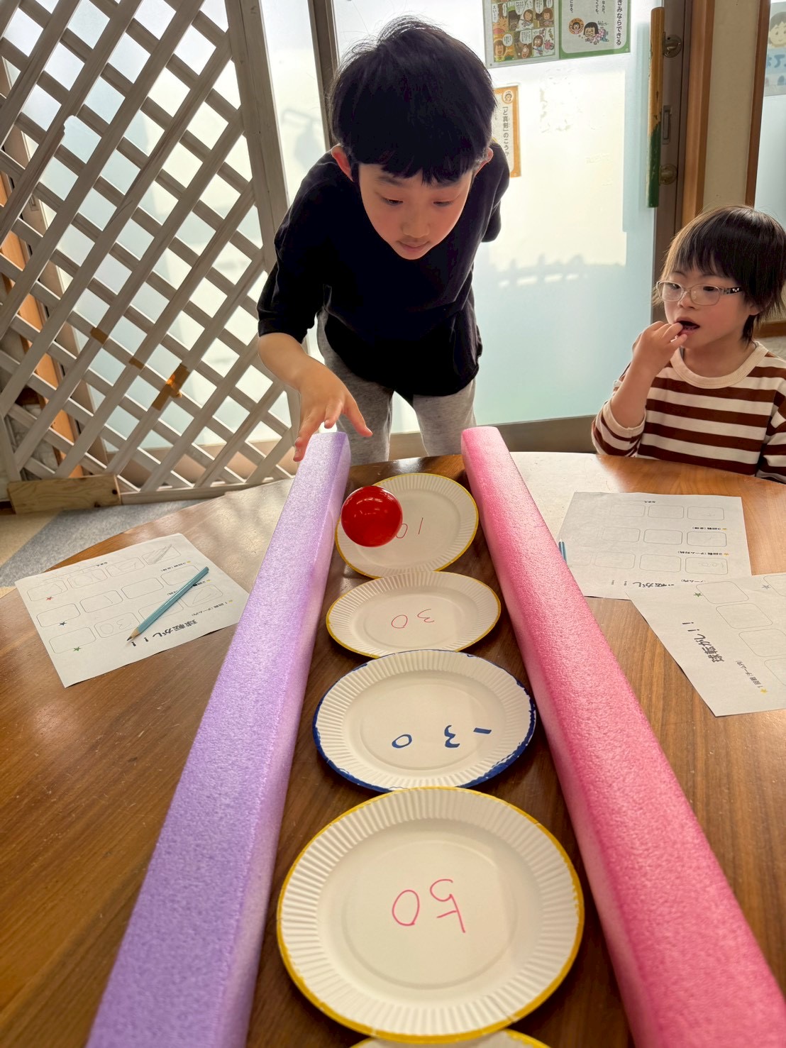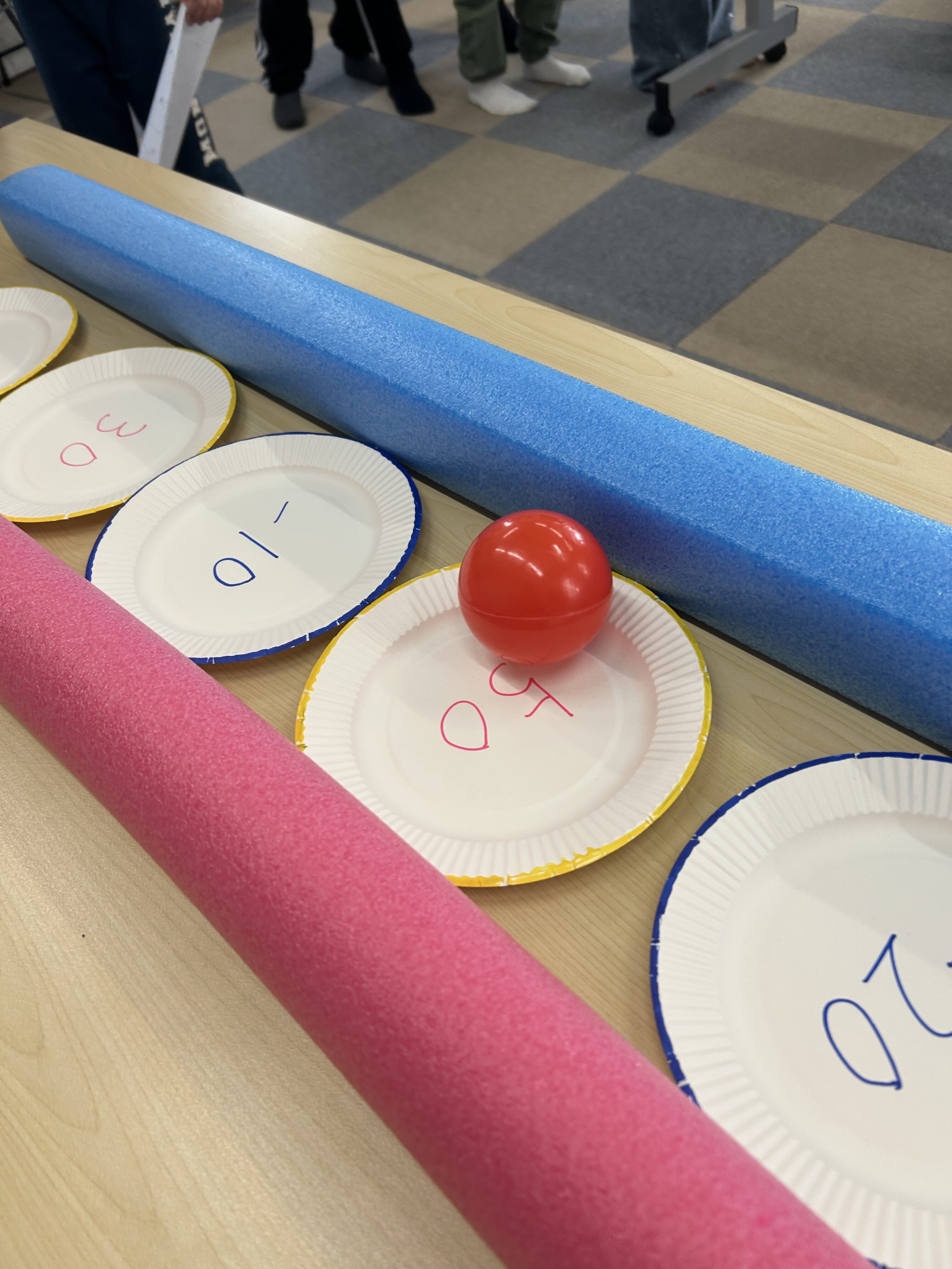 このように紙皿を並べて、この上にボールを転がして高得点を狙います🤔