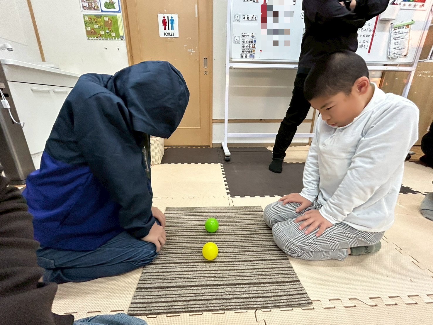 お互い一対一で向かい合いボールを2つ起き先生から指示されたカラーボールを相手より先に取ることができればボールを獲得✨