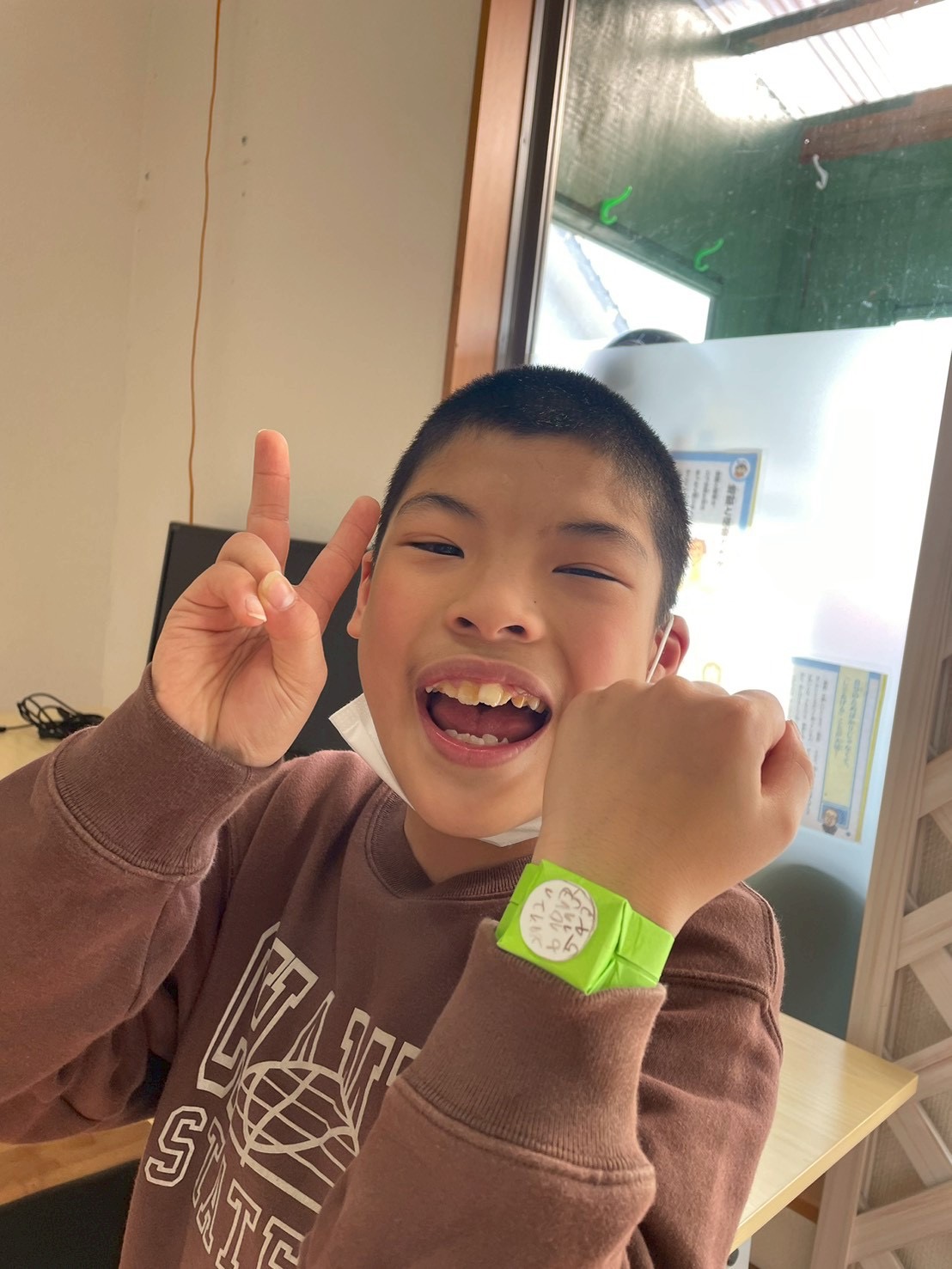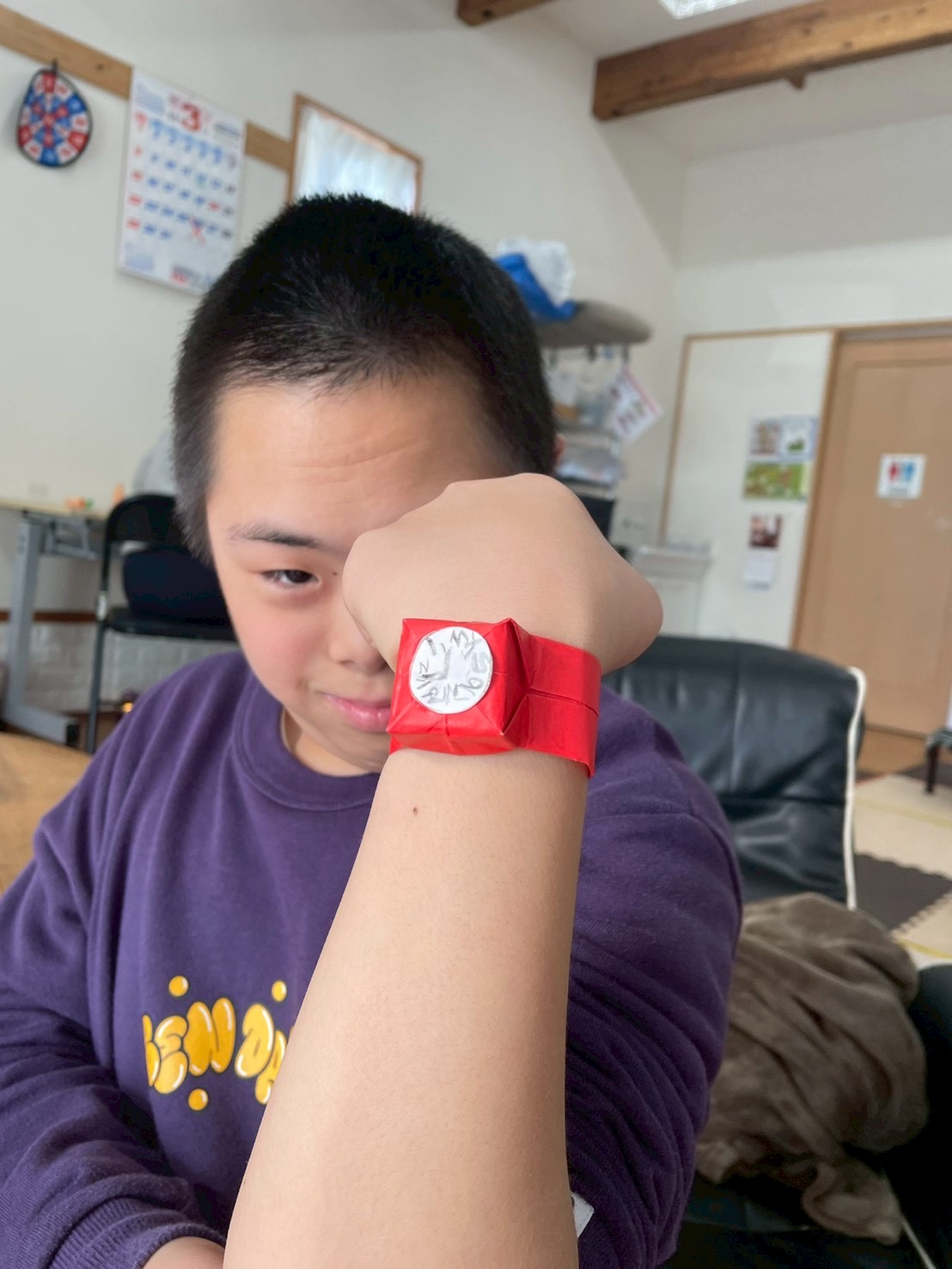 室内では、折り紙を使って腕時計作りに挑戦しました。好きな色の折り紙を選び、「ここはこうしようかな?」と考えながら、丁寧に折り進める姿が見られました。完成すると腕につけて「見て見て!」と嬉しそうに見せてくれる場面もあり、自分で作り上げた達成感を感じている様子でした😁✨