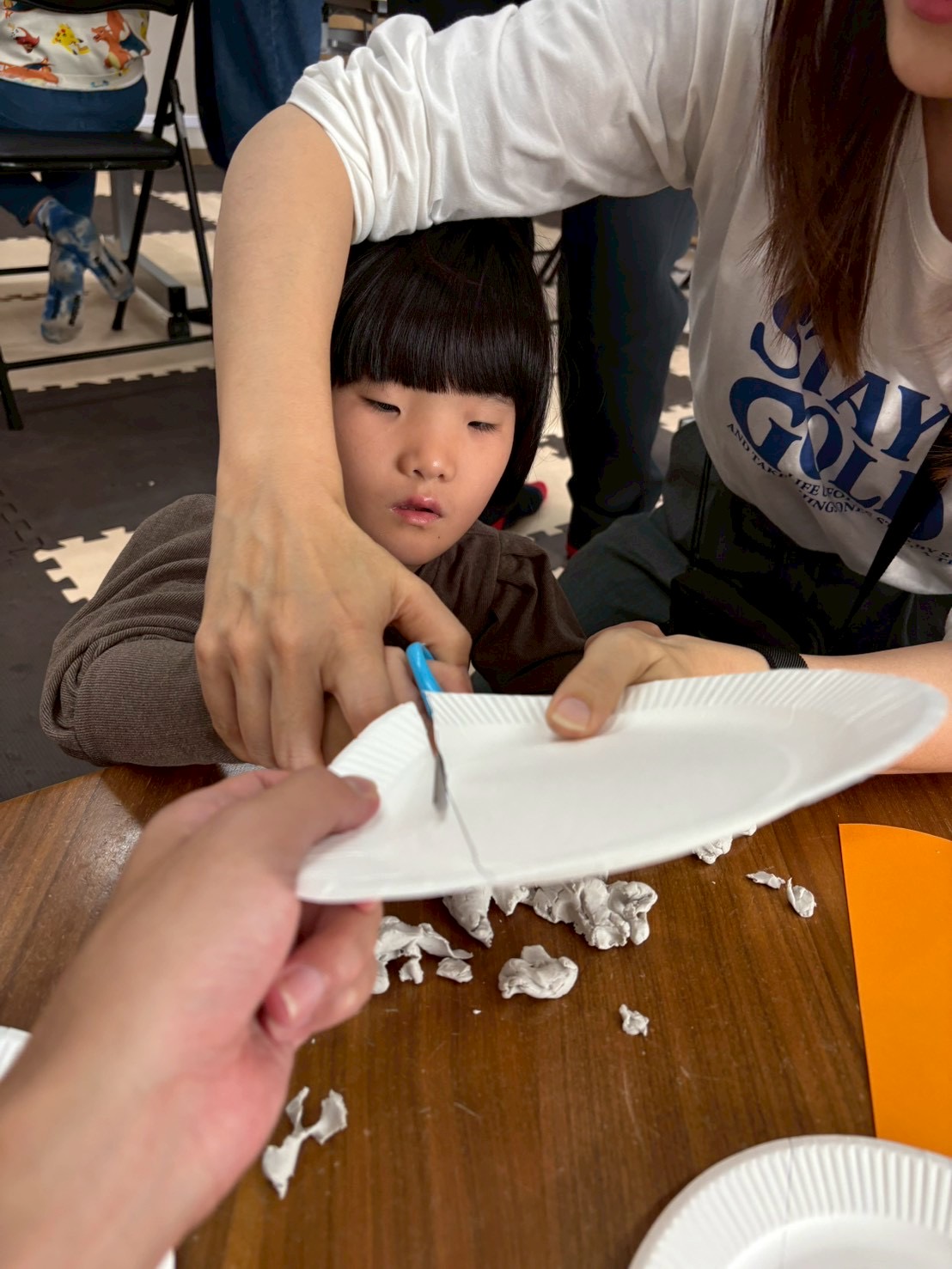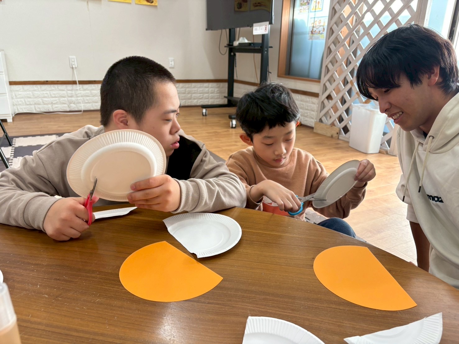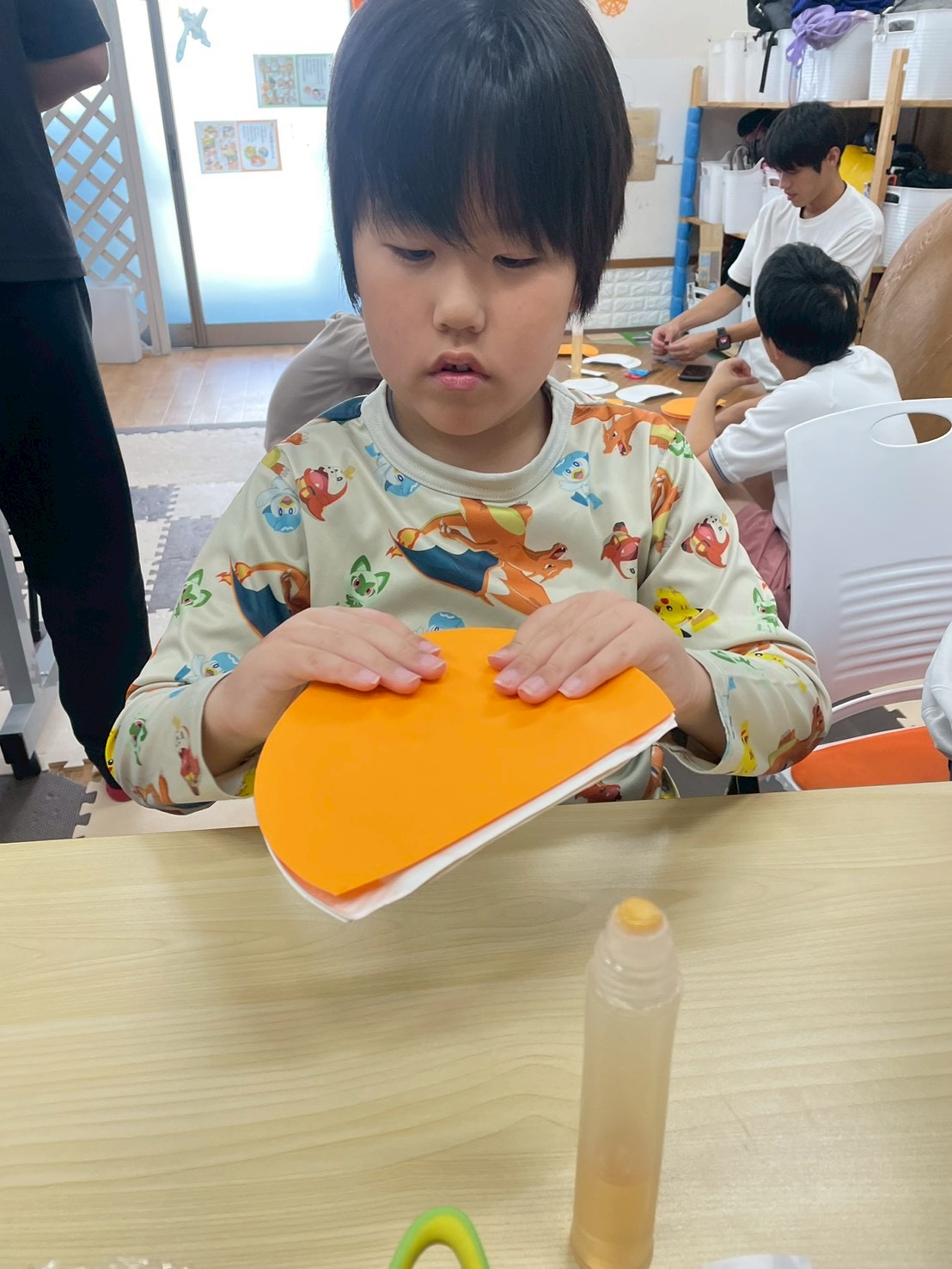 2枚の紙皿を貼り合わせて、オレンジの画用紙を貼ります💡