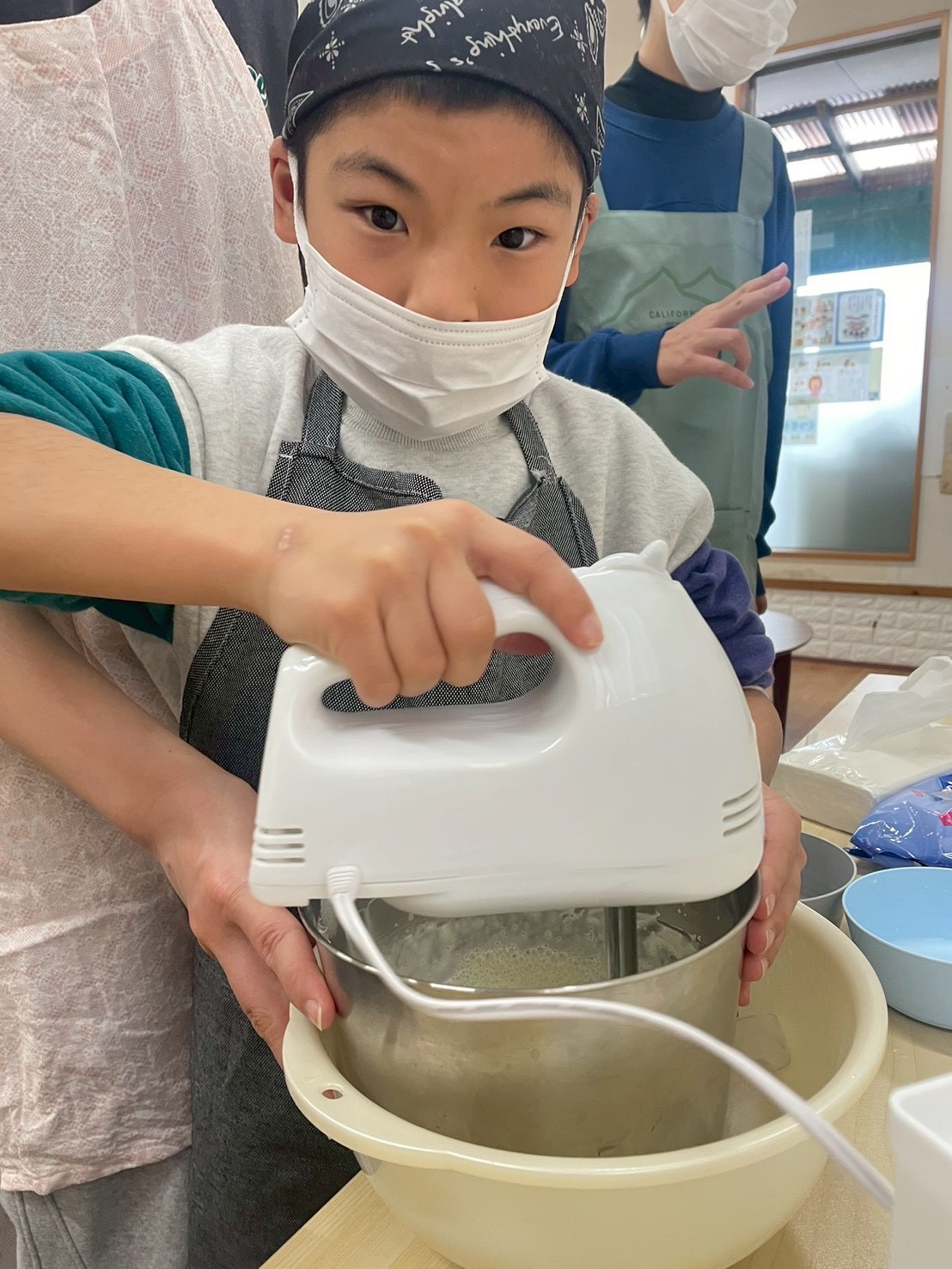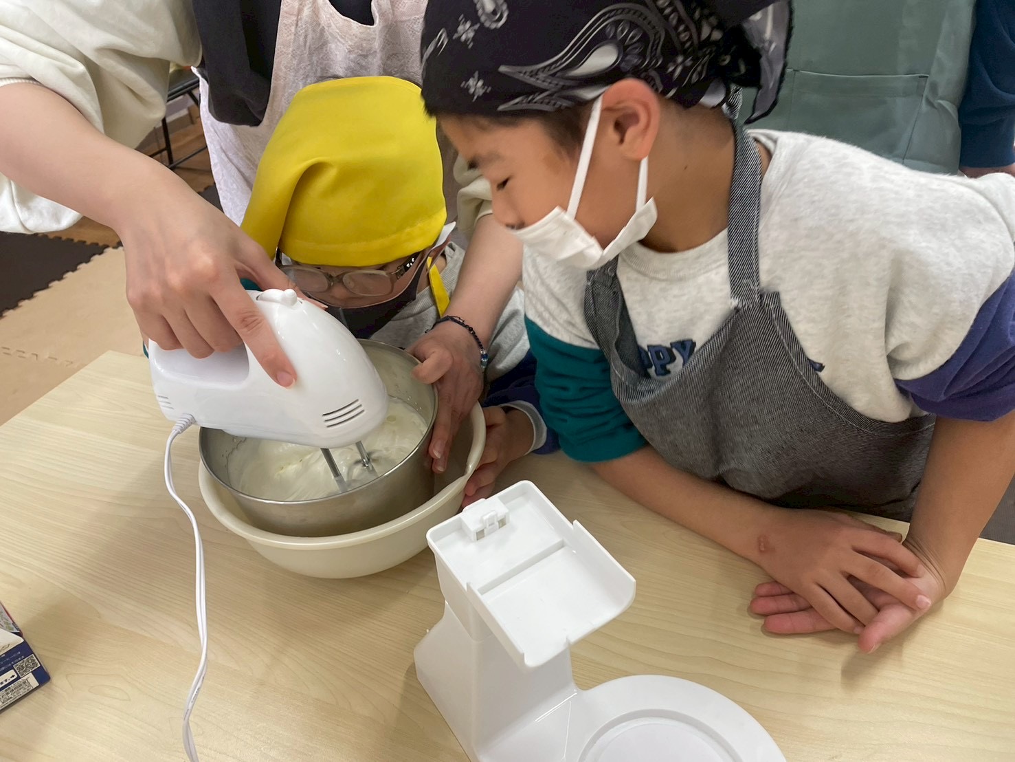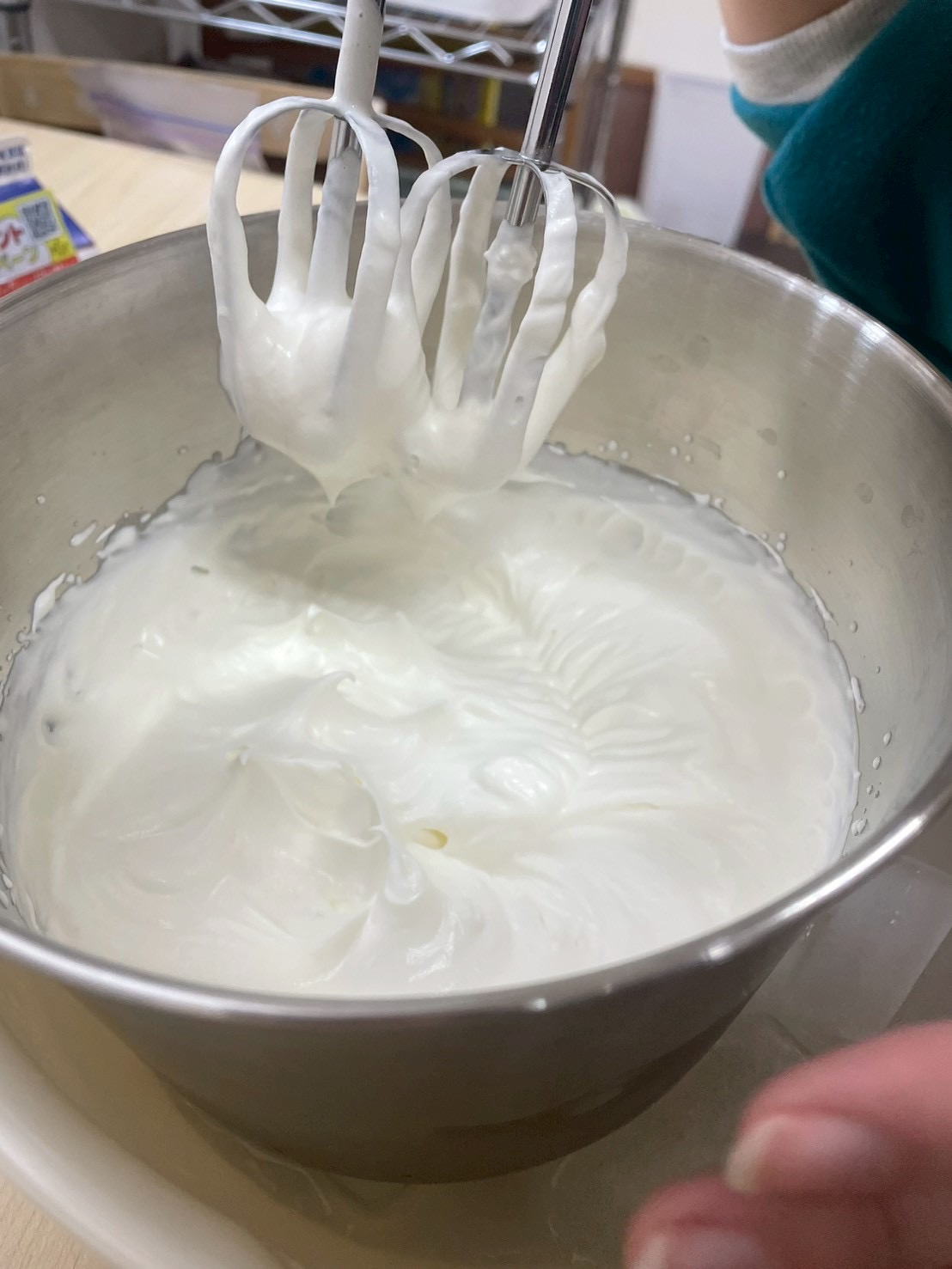 生クリームの泡立ても自分たちで💪🏻ツノが立つまでしっかり泡立てていきます🥣