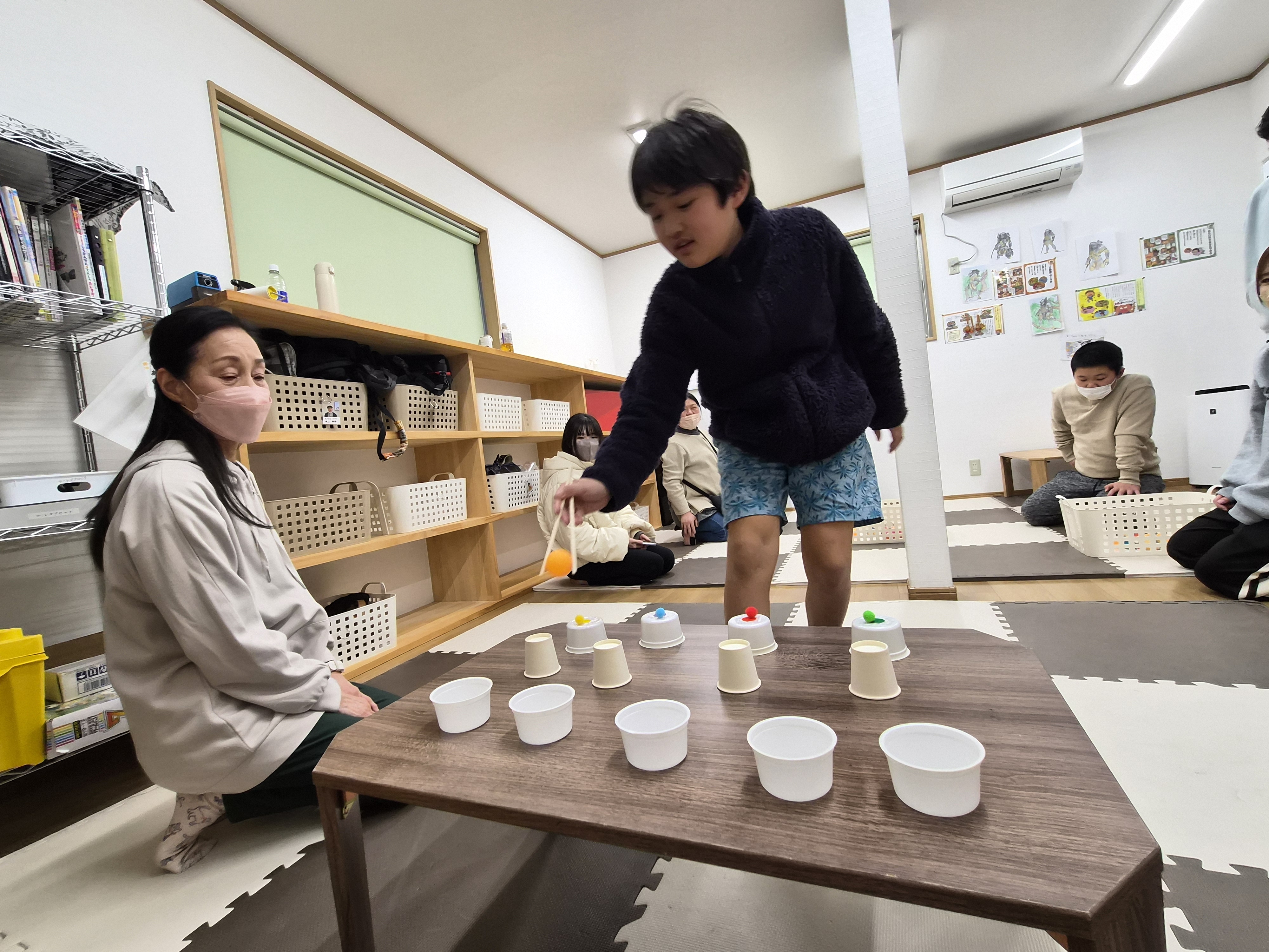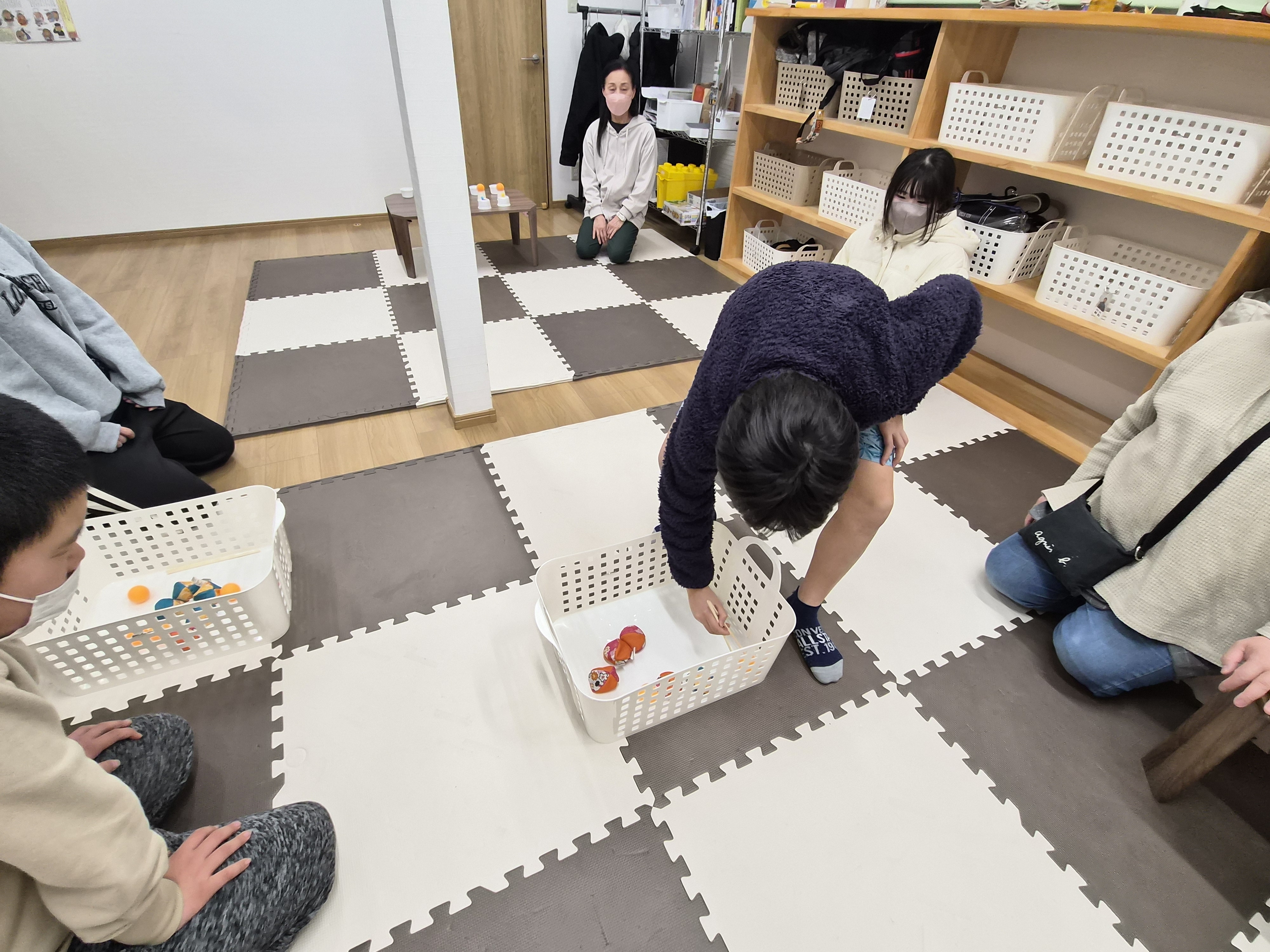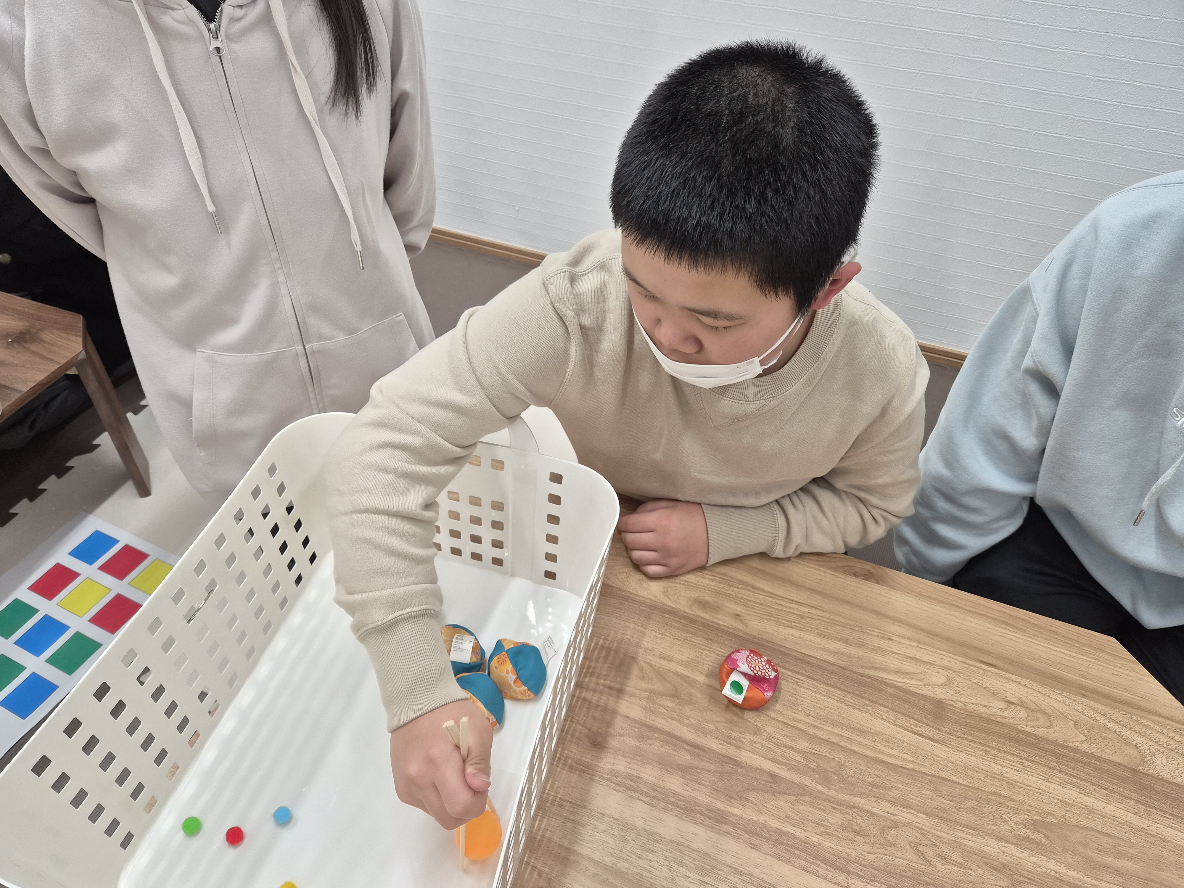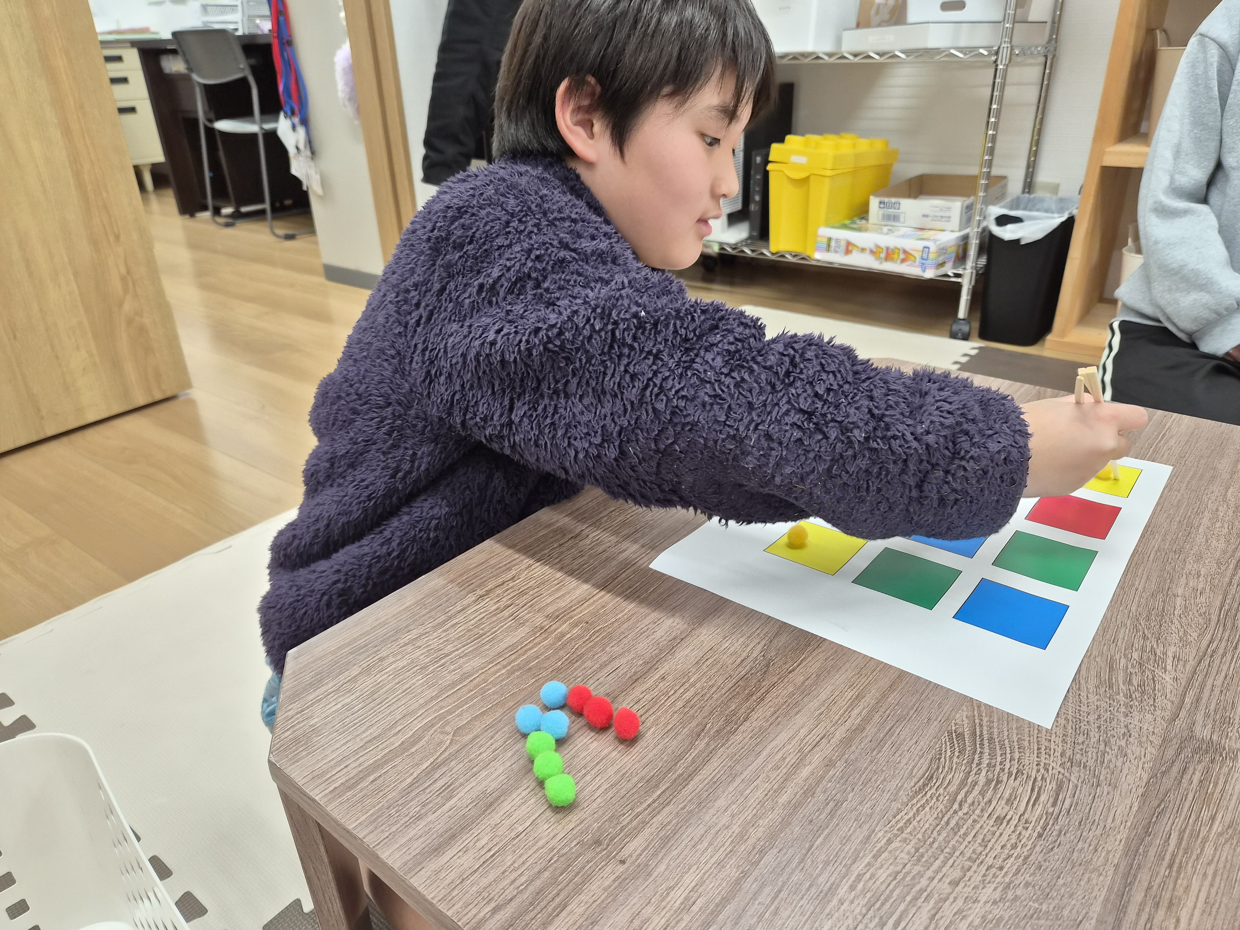 色のついた玉を使い、仕分けを行います❗なるべく早く、正確に✨ということを意識しながら取り組みました❗