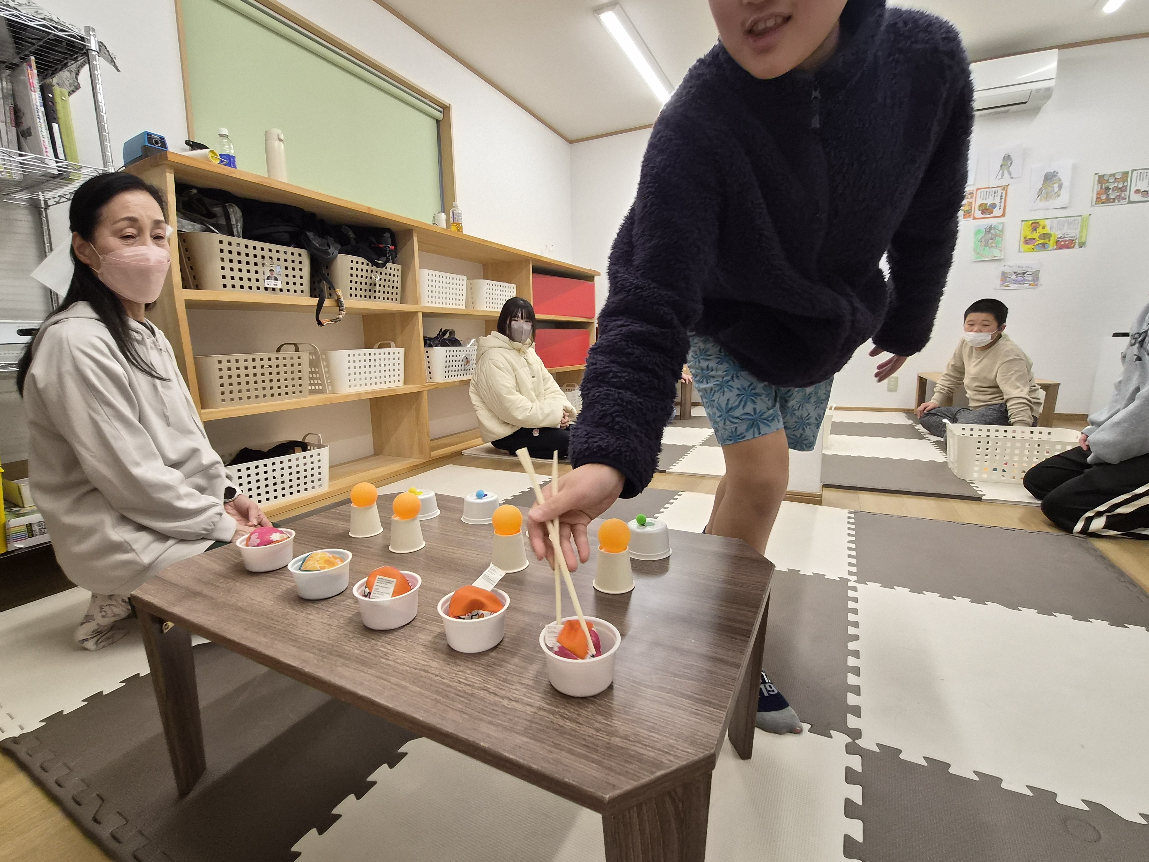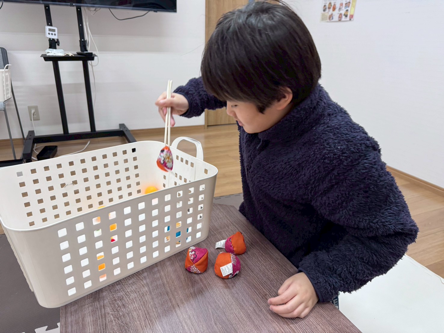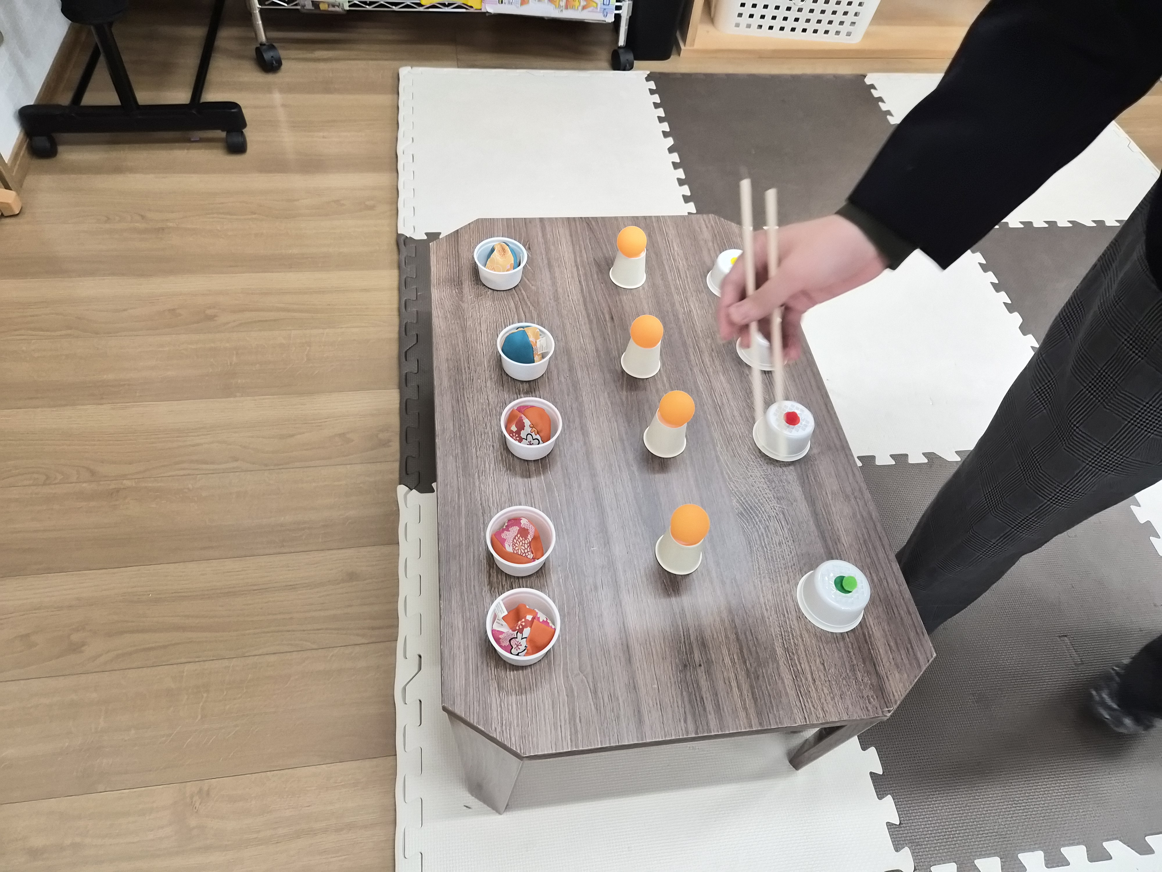 本日の活動では、お箸を使って指先の感覚やものをつかむ際の力加減等…を意識出来るように取り組みました🥢