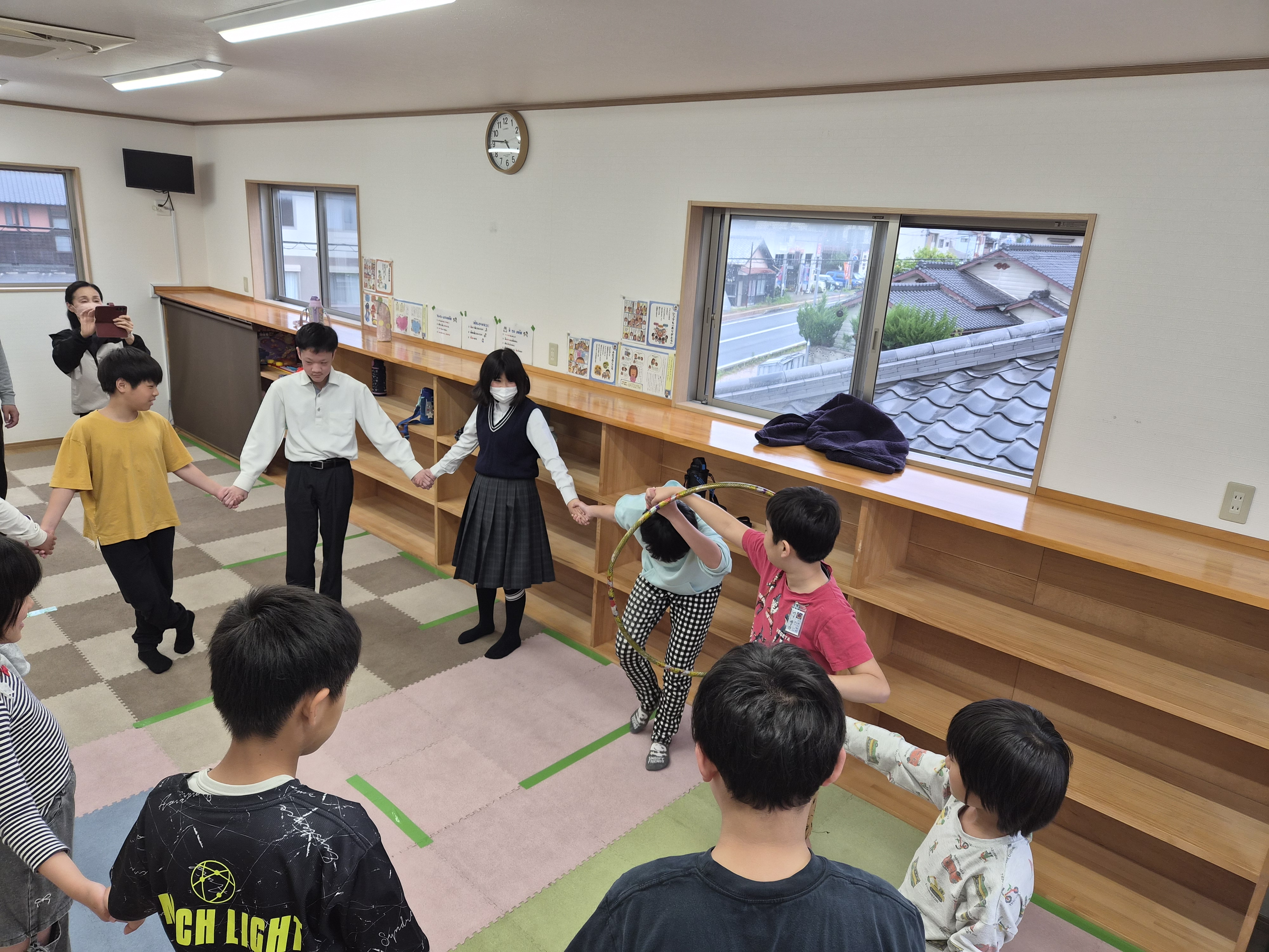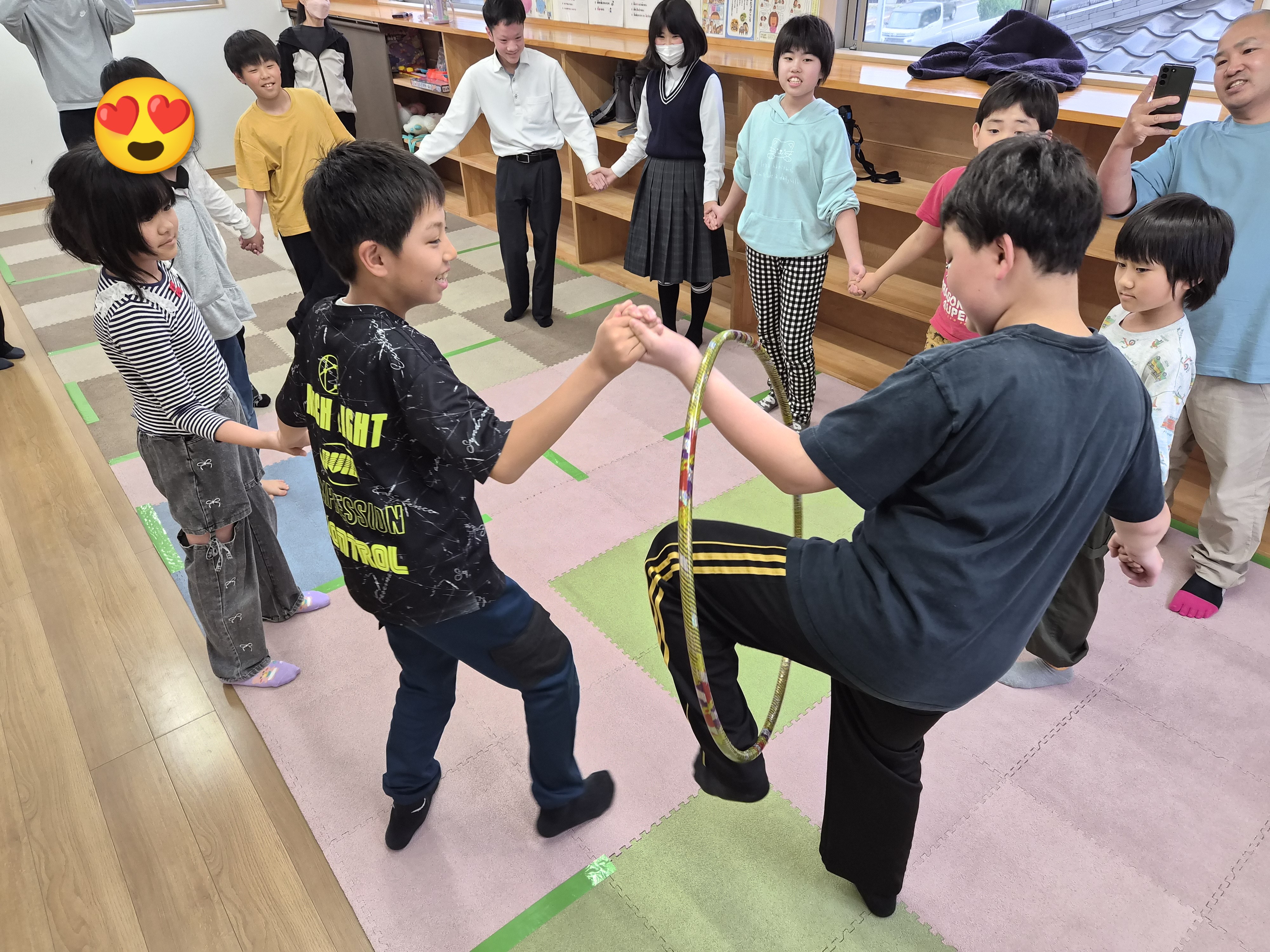 お互いにくぐりやすくする為に腕や身体の位置を調整します❗順調にフラフープが進みます👍