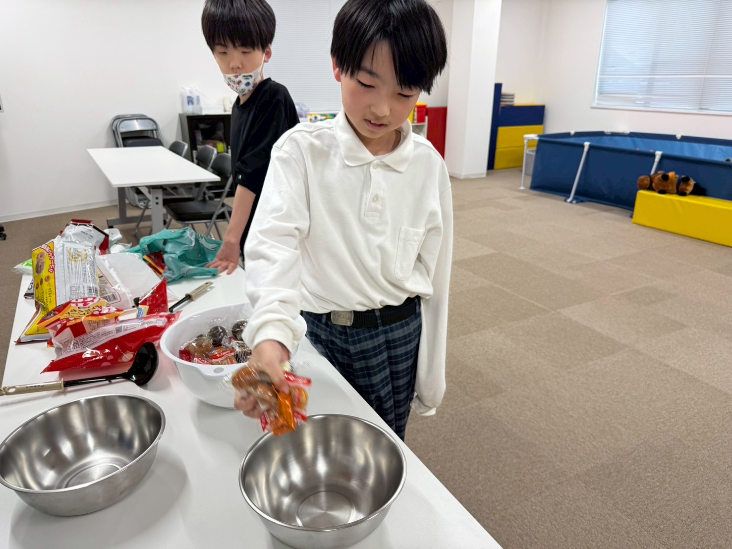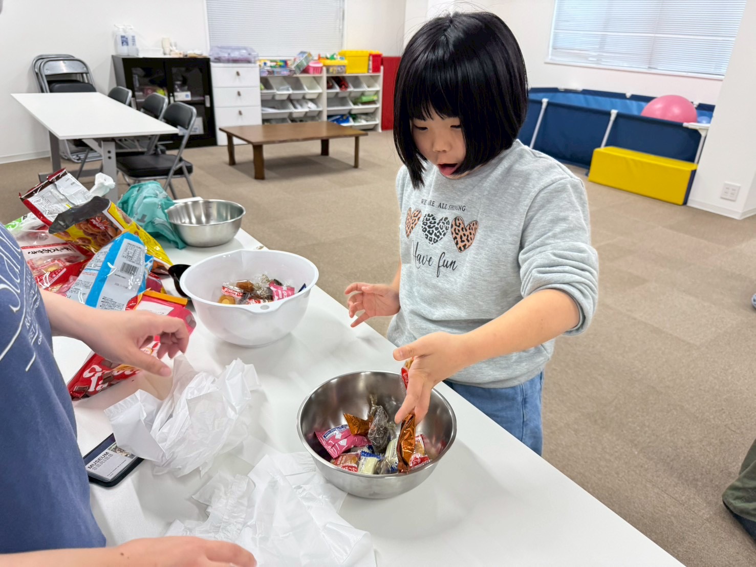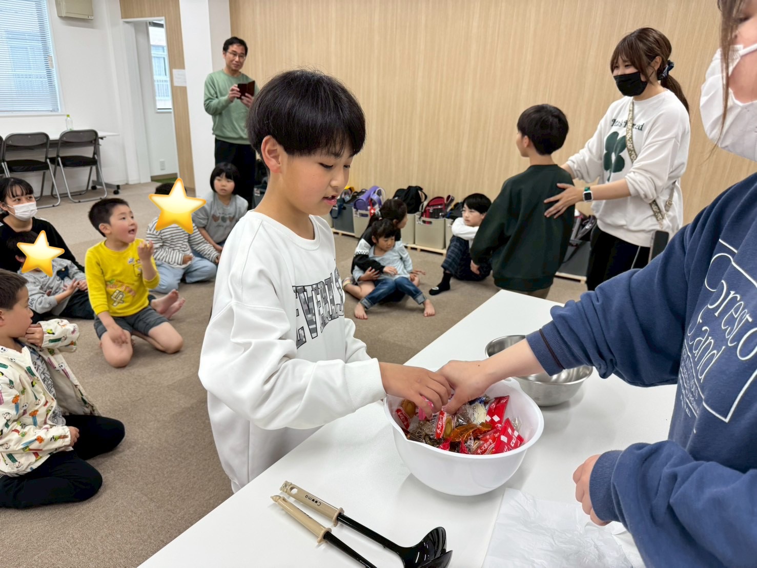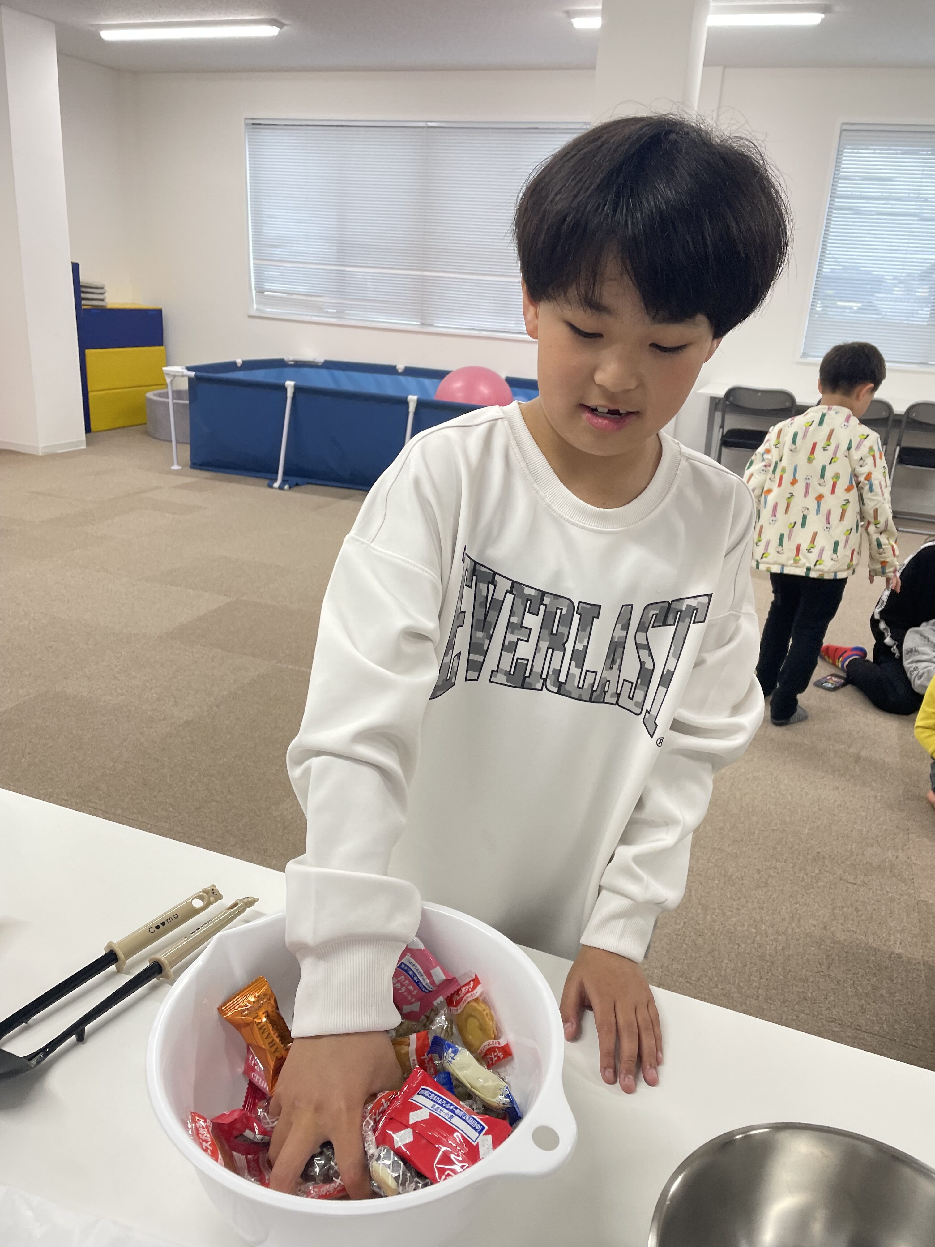 ⚪️先生とじゃんけんをして、勝った人から順にお菓子の掴み隣のボウルに移します🥣