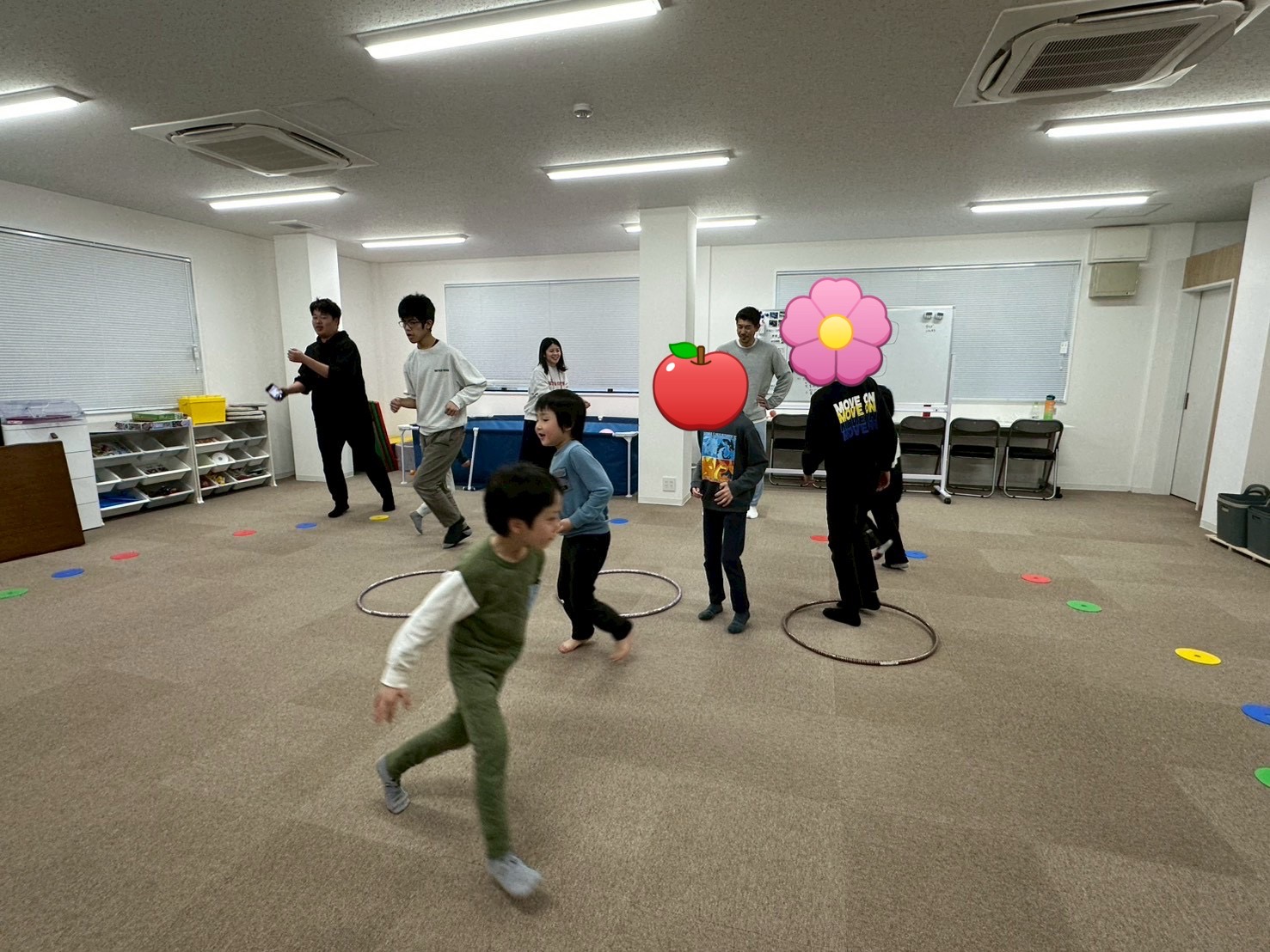 音楽が流れている間は自由に動き、音楽が止まったらスタッフが指定した色のマーカーへ🏃➡️💨