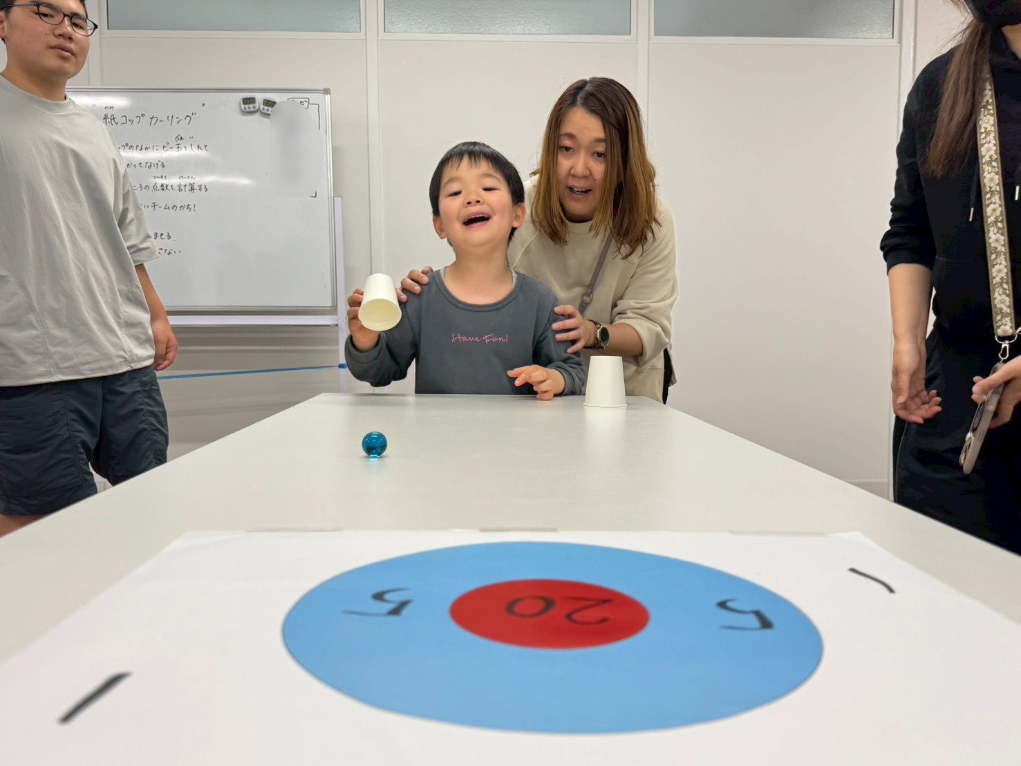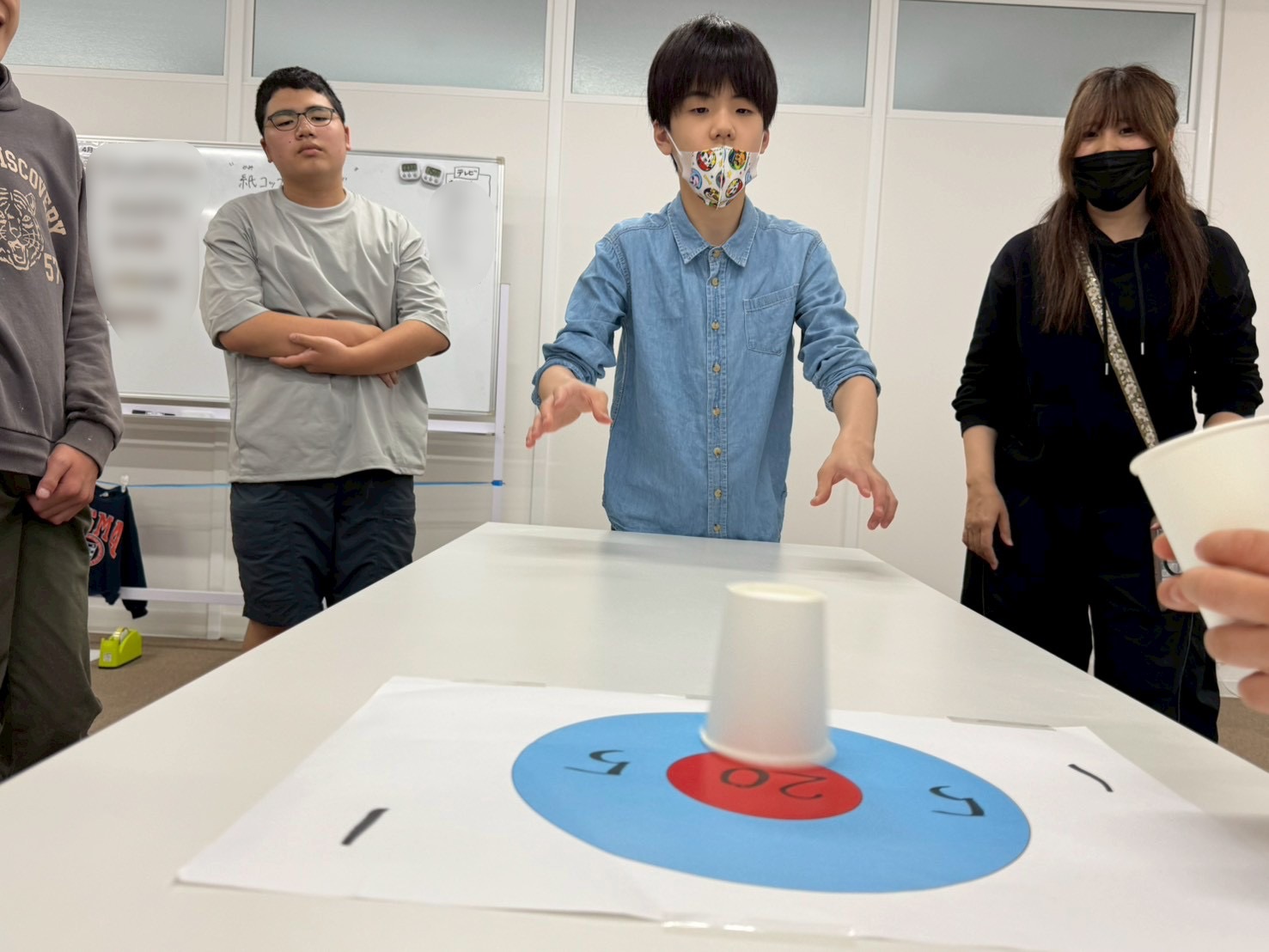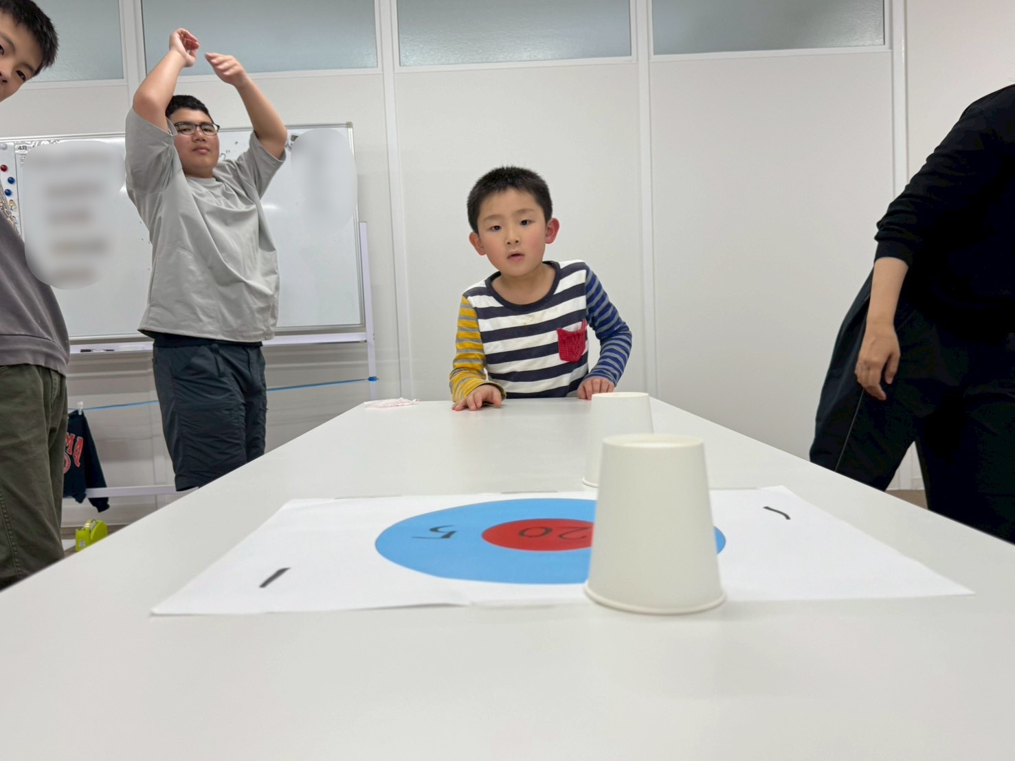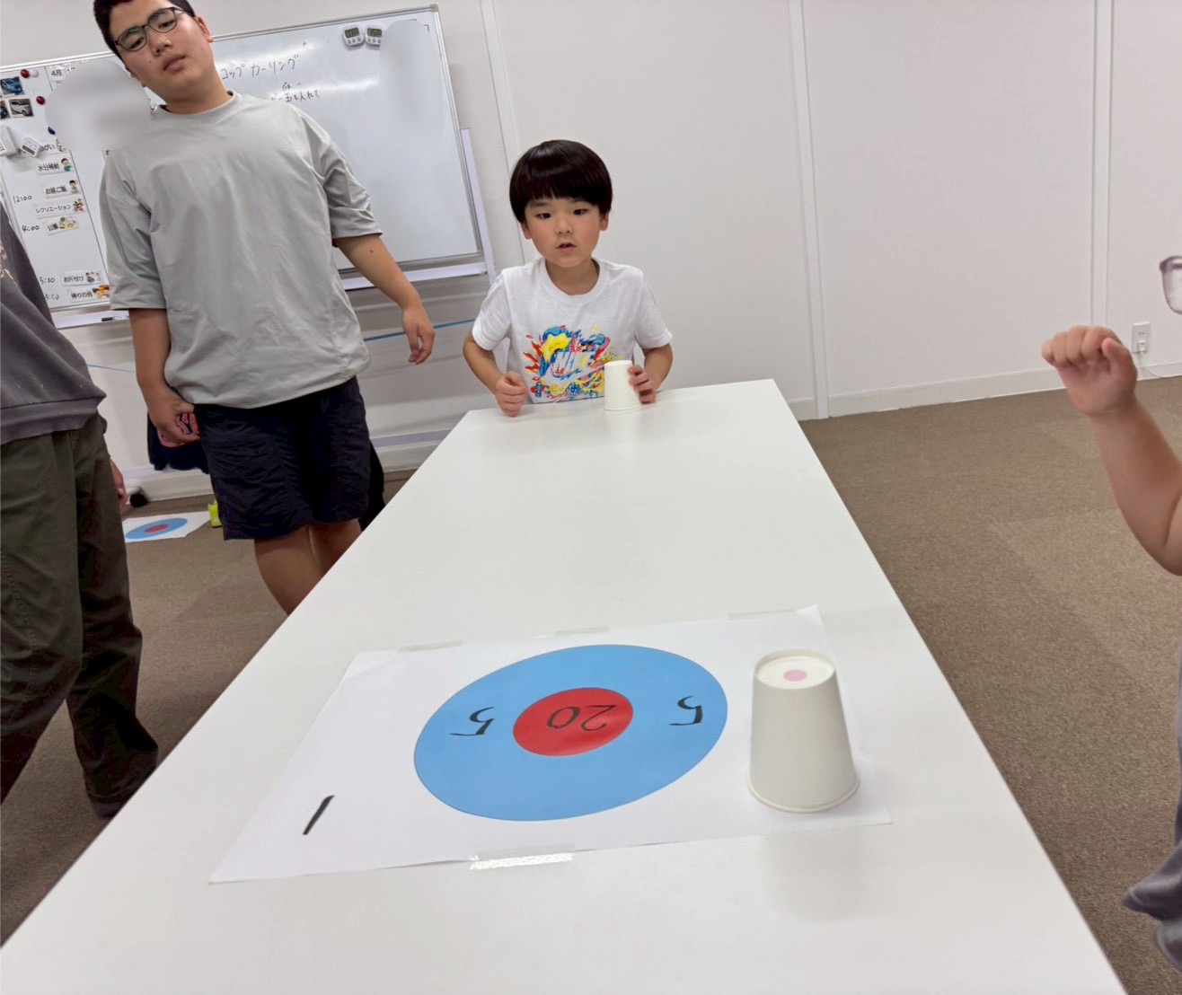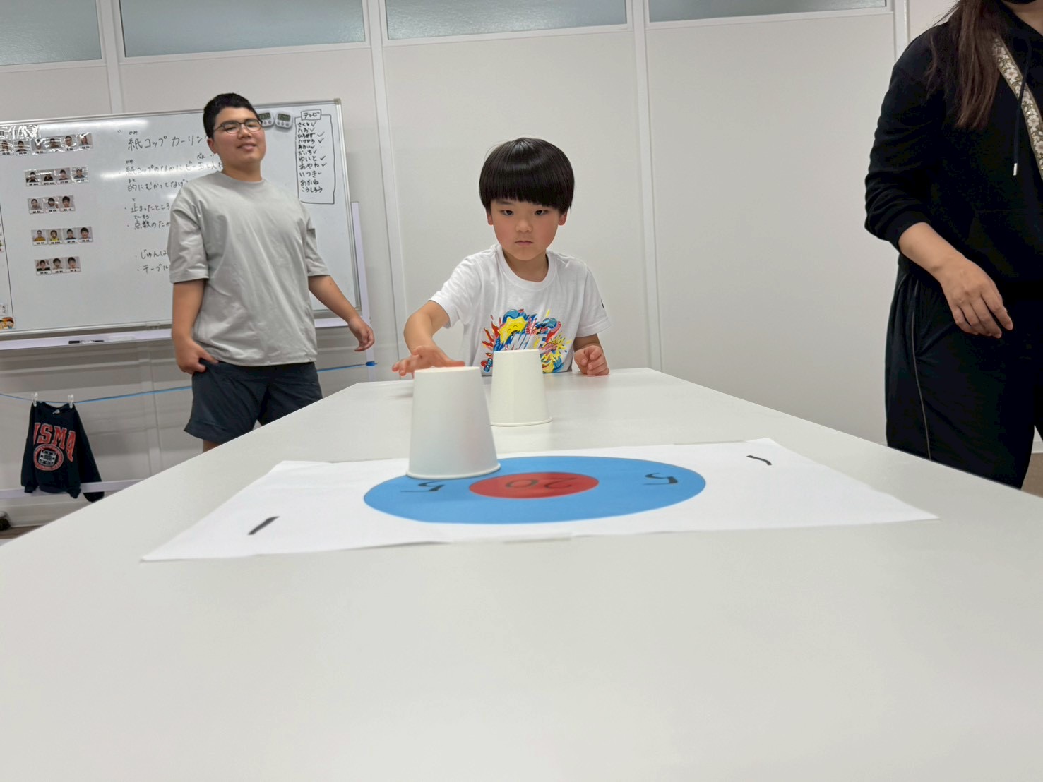 紙コップの中にビー玉をひとつ入れ、的に向かって投げます🥌