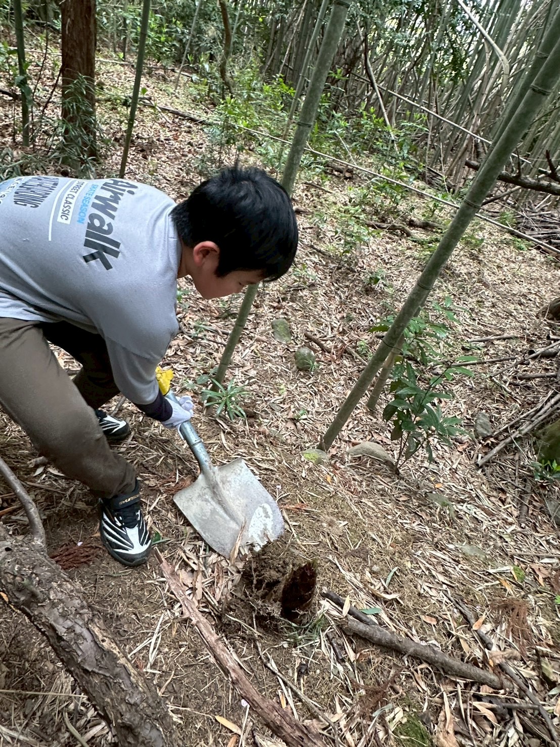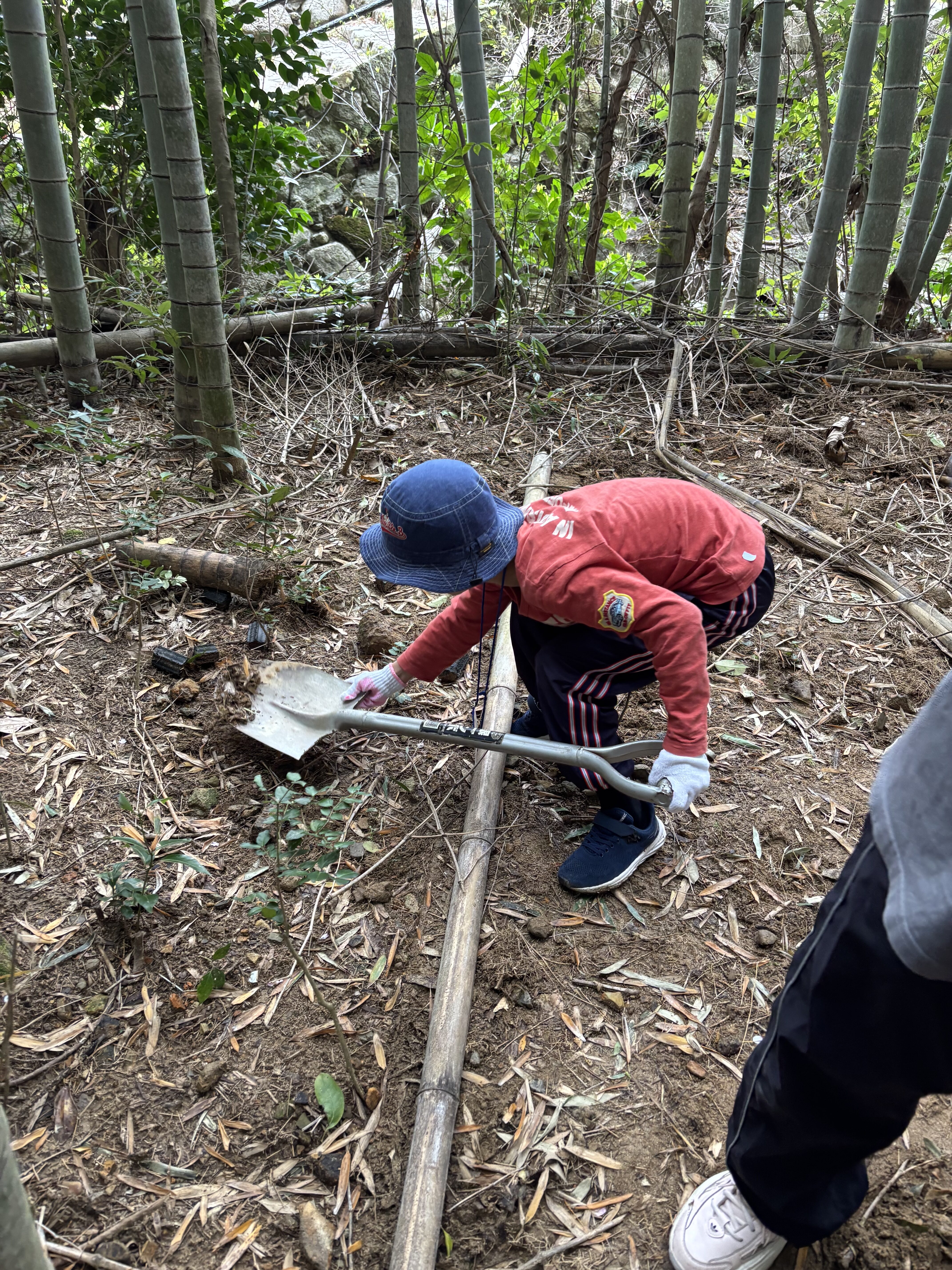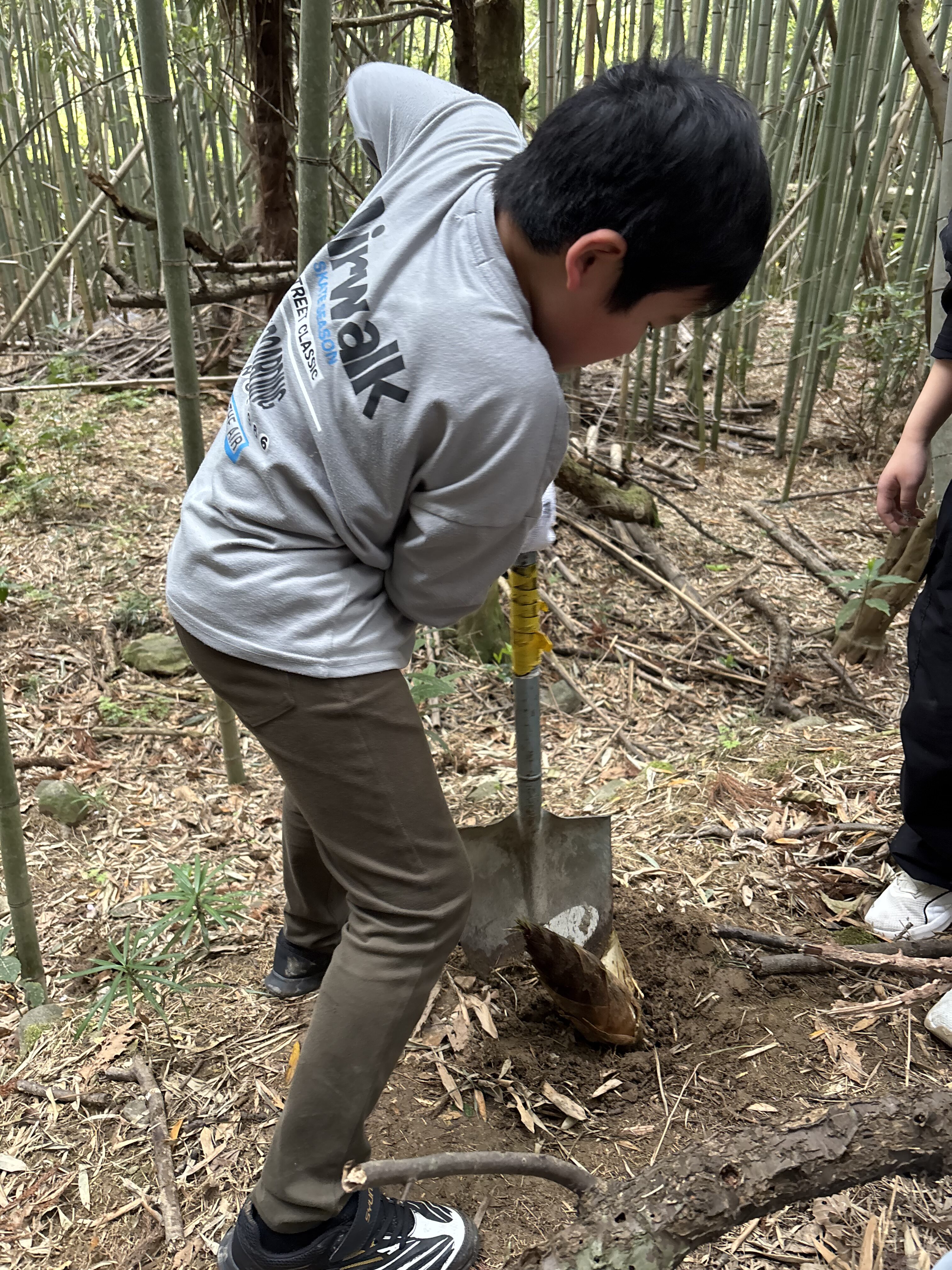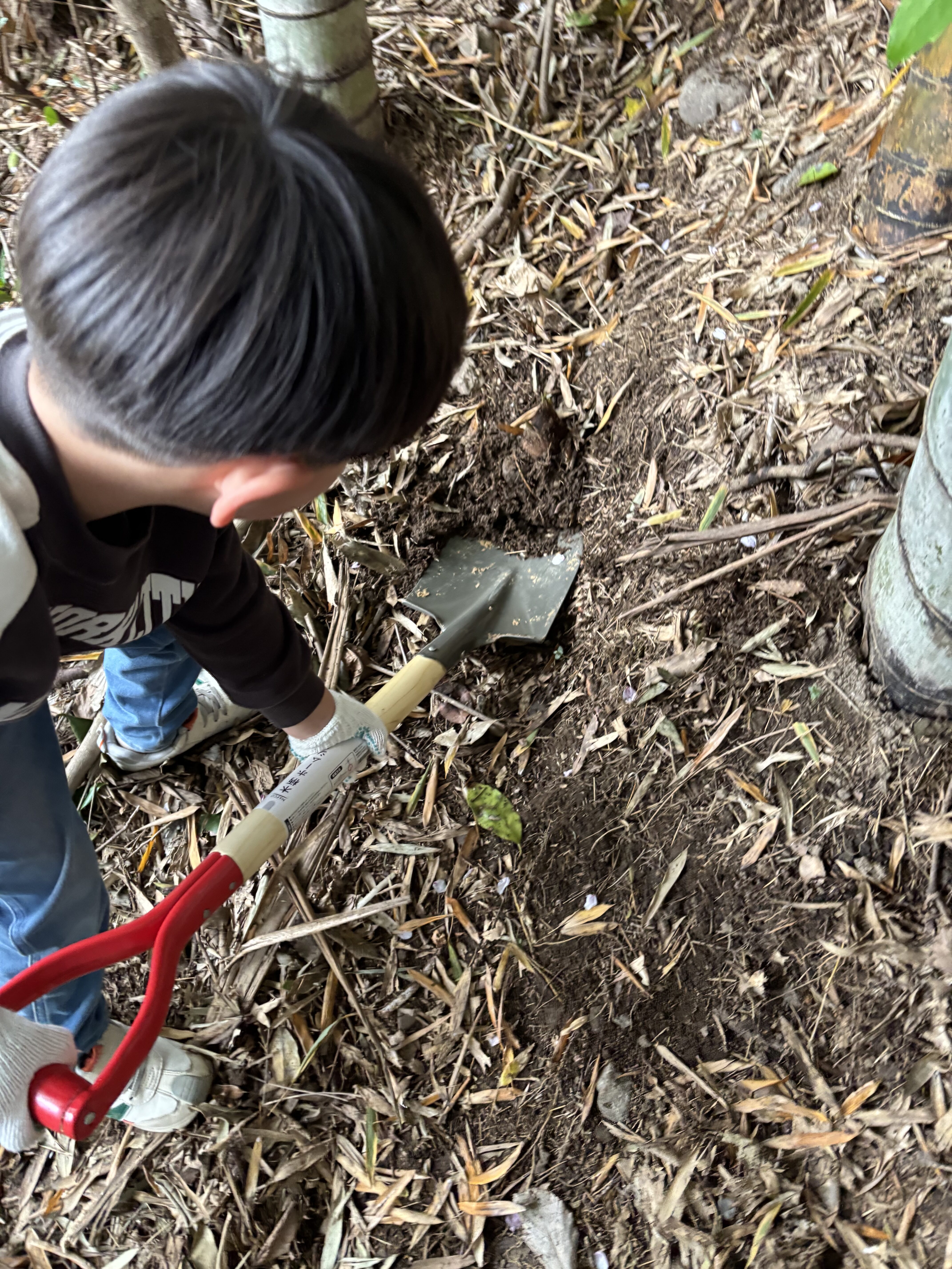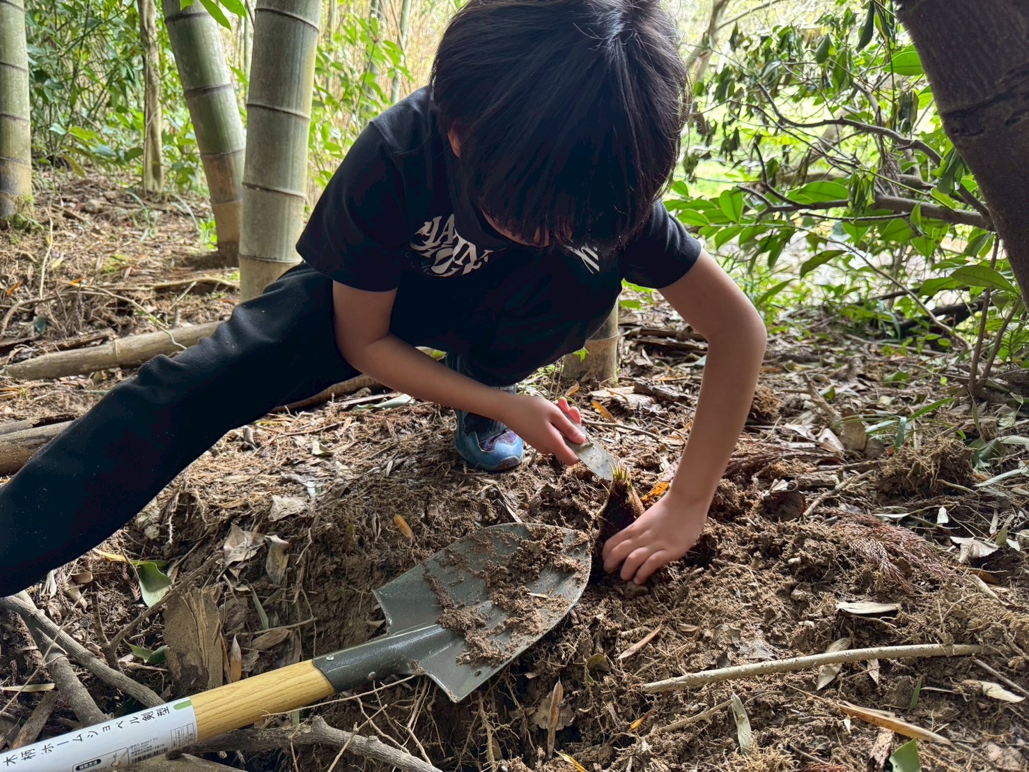 見つけたタケノコを、スコップを使って一生懸命掘り進めました👏