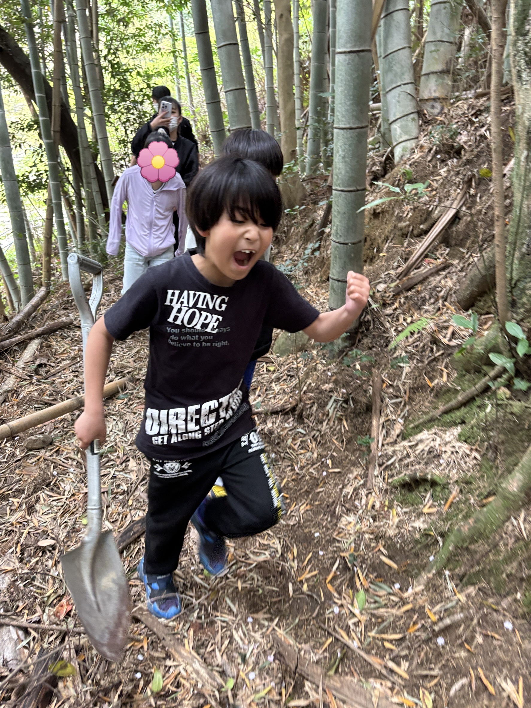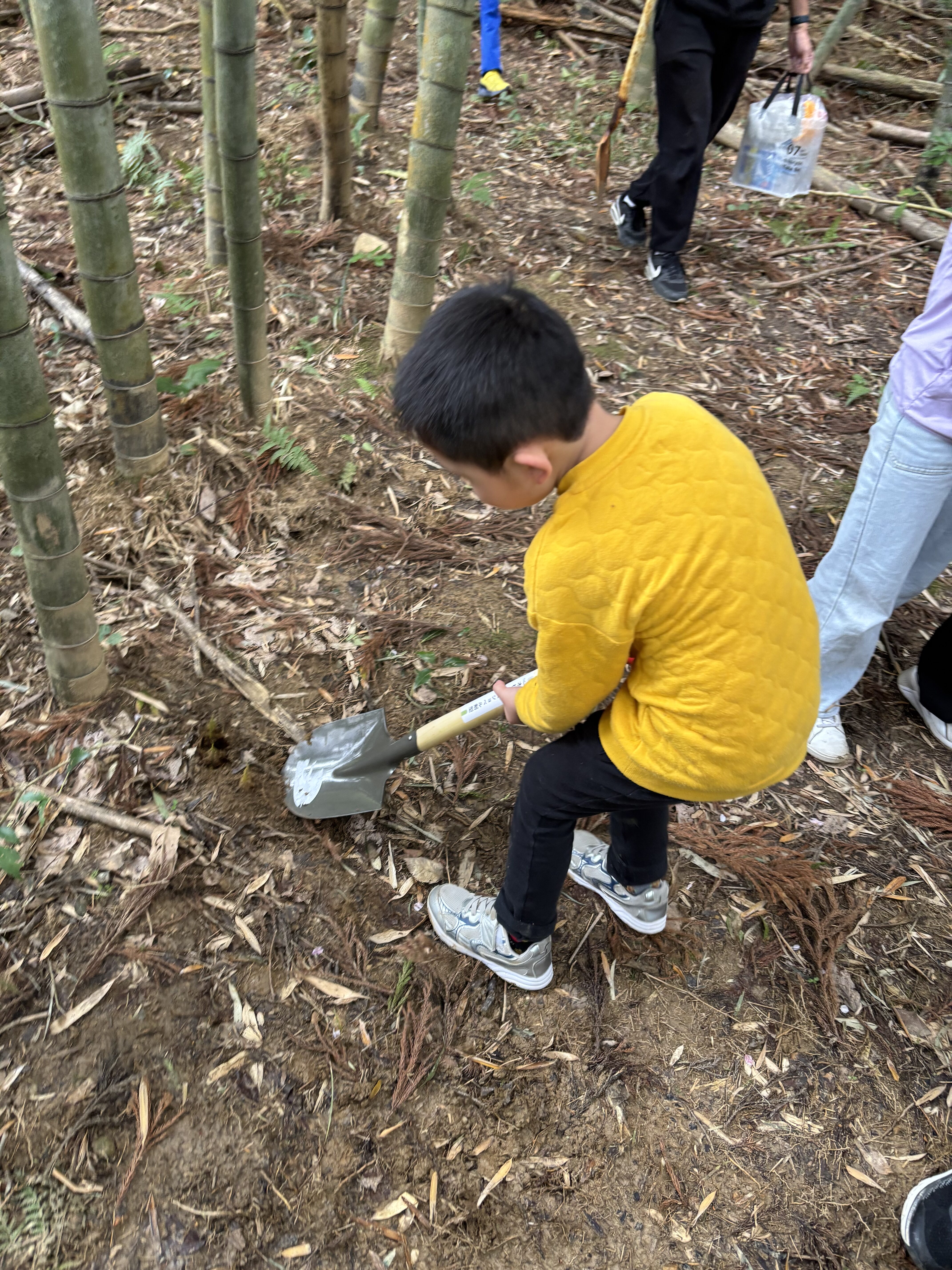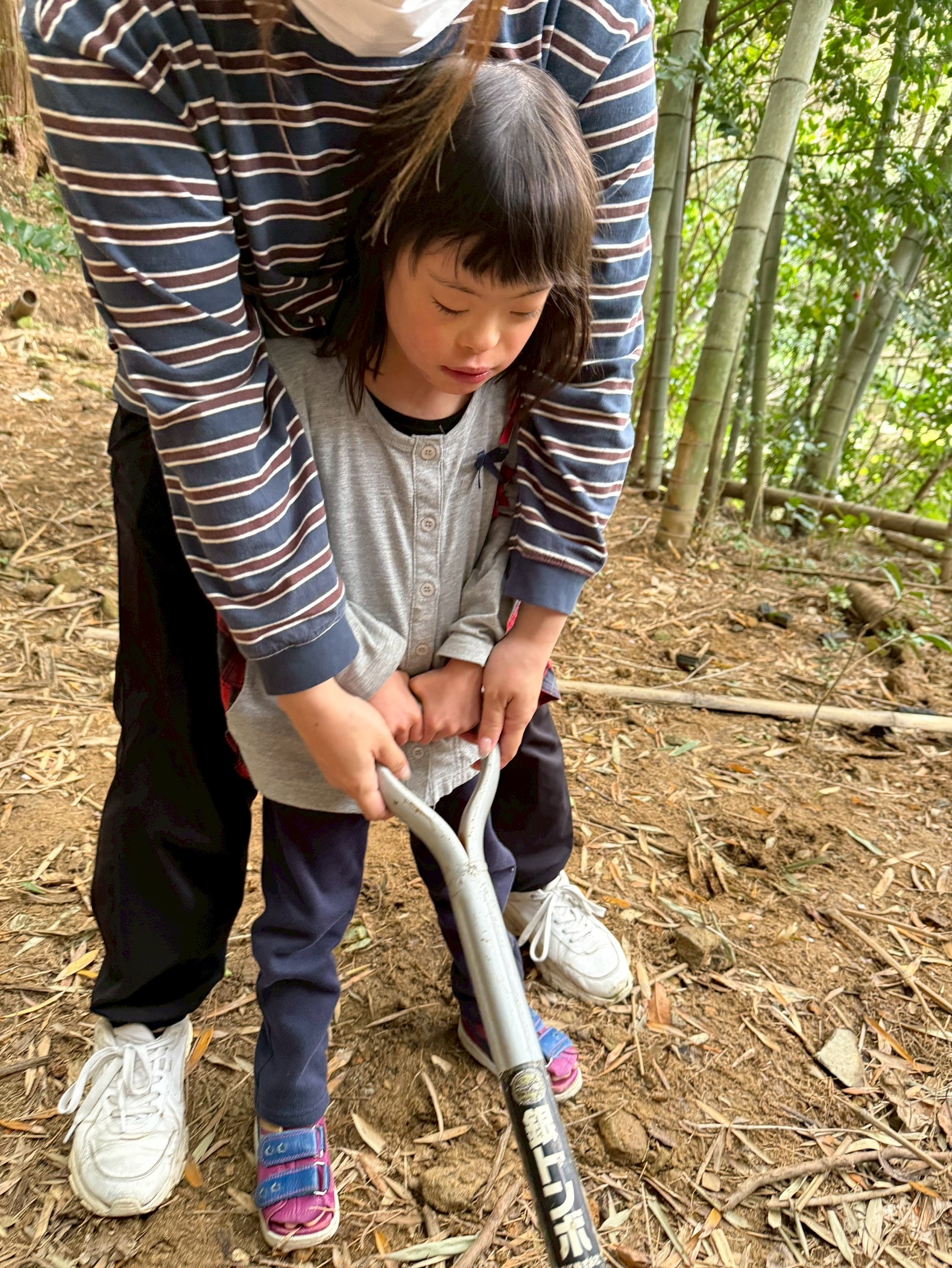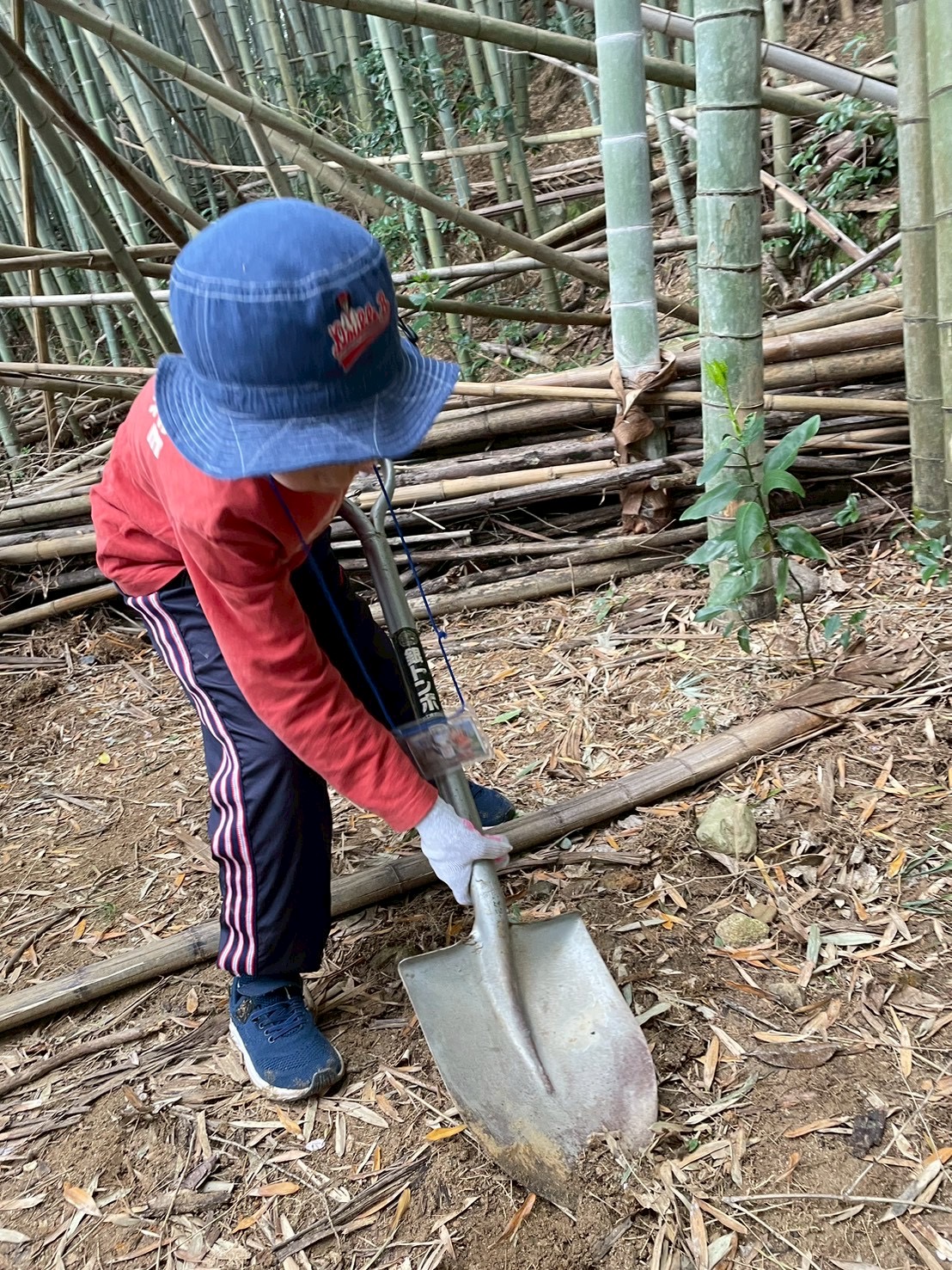 見つけたタケノコを、スコップを使って一生懸命掘り進めました👏