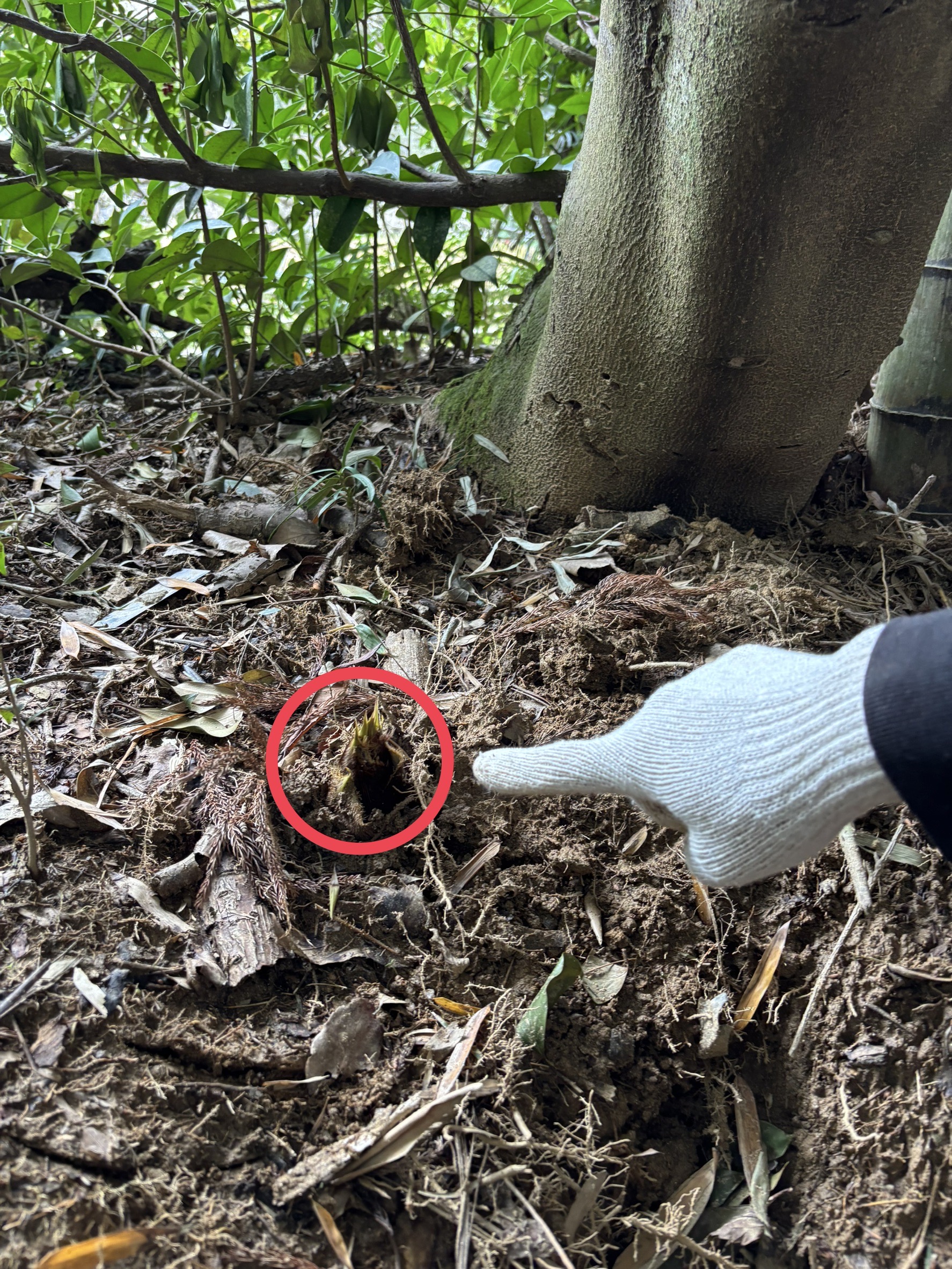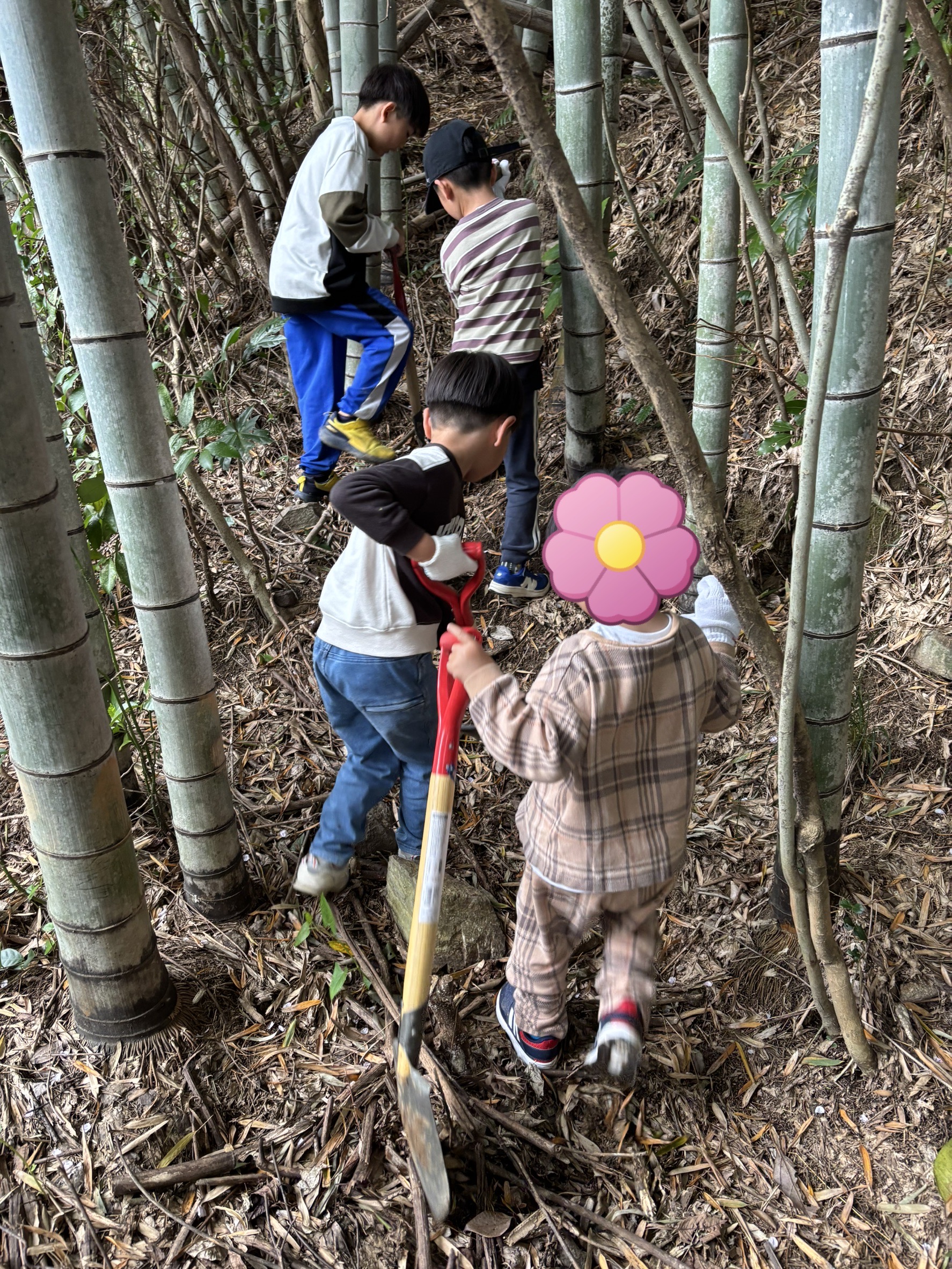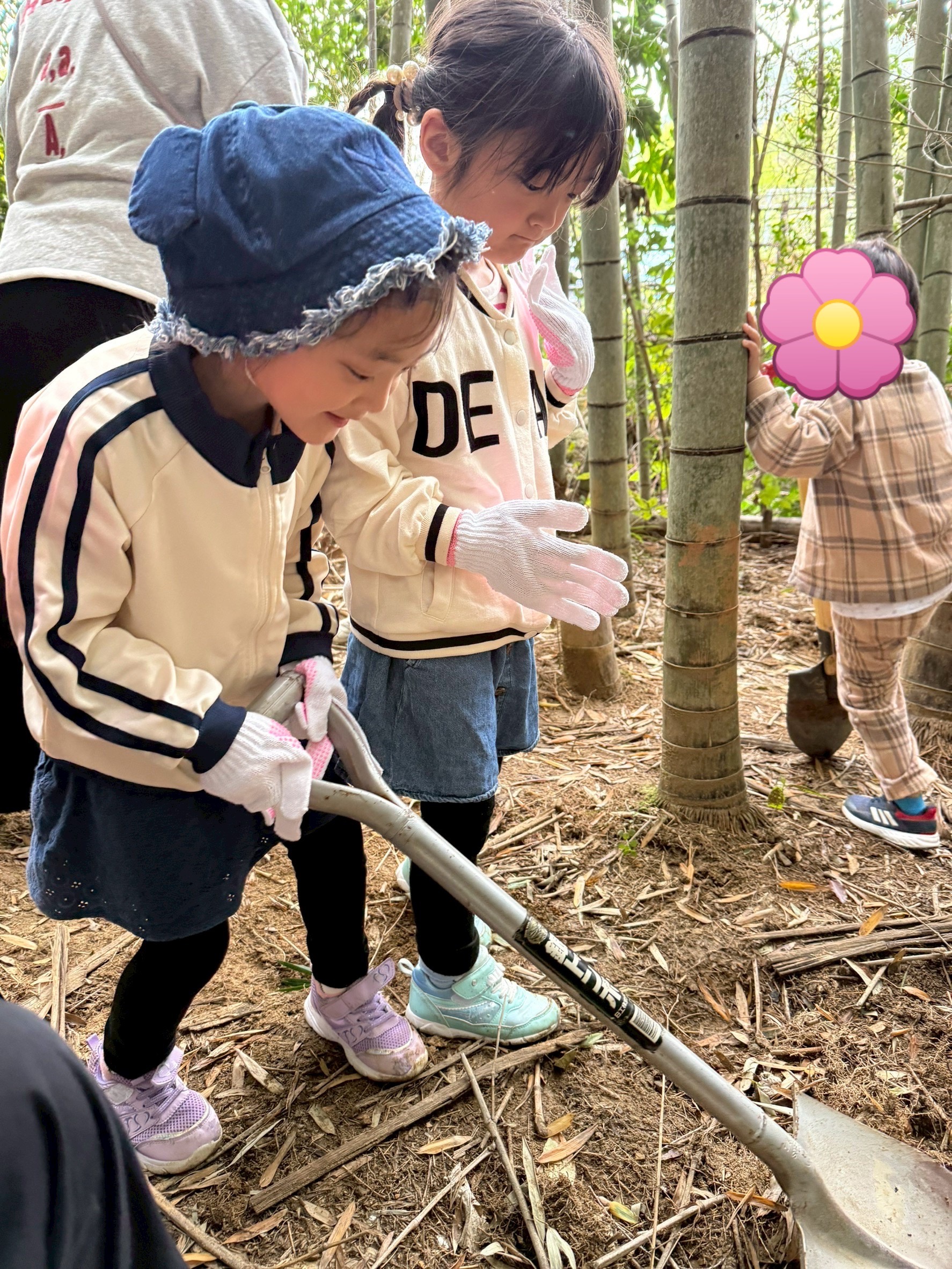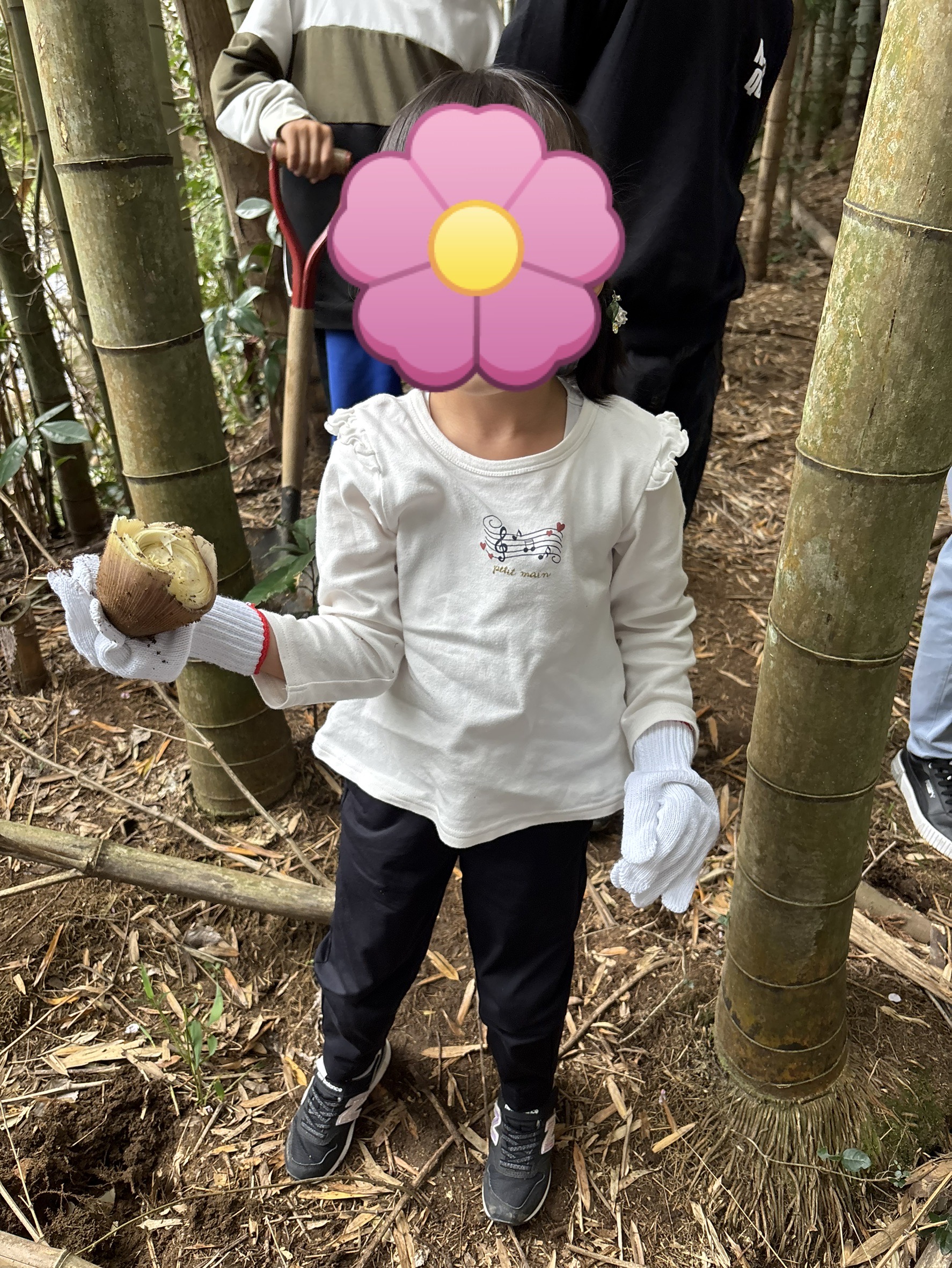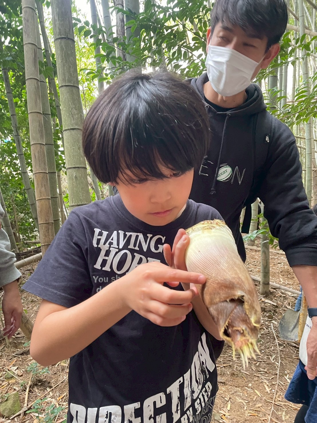 見つけたタケノコを、スコップを使って一生懸命掘り進めました👏