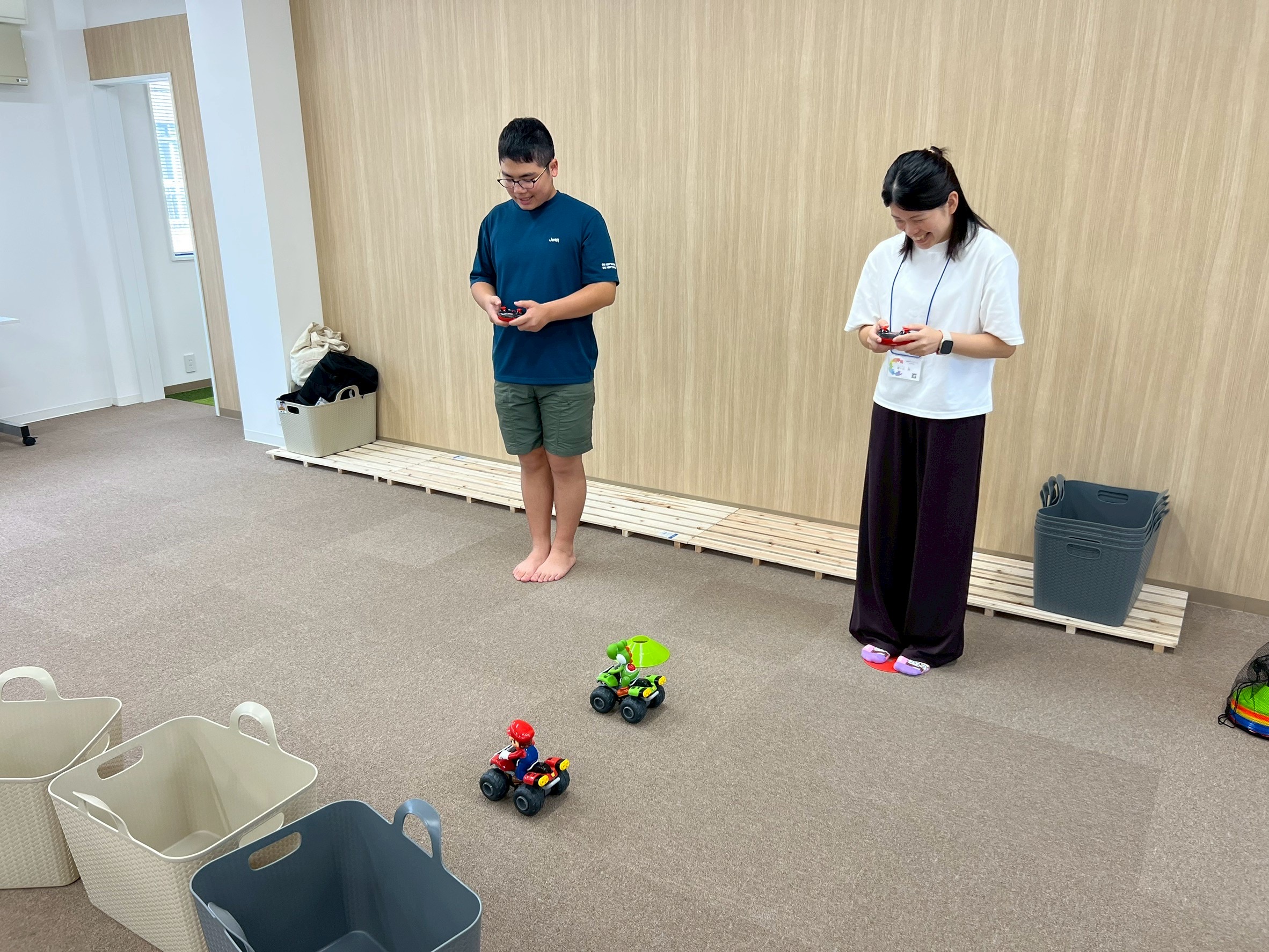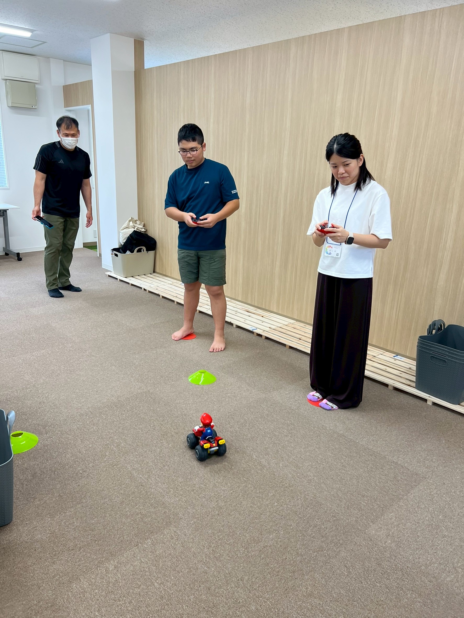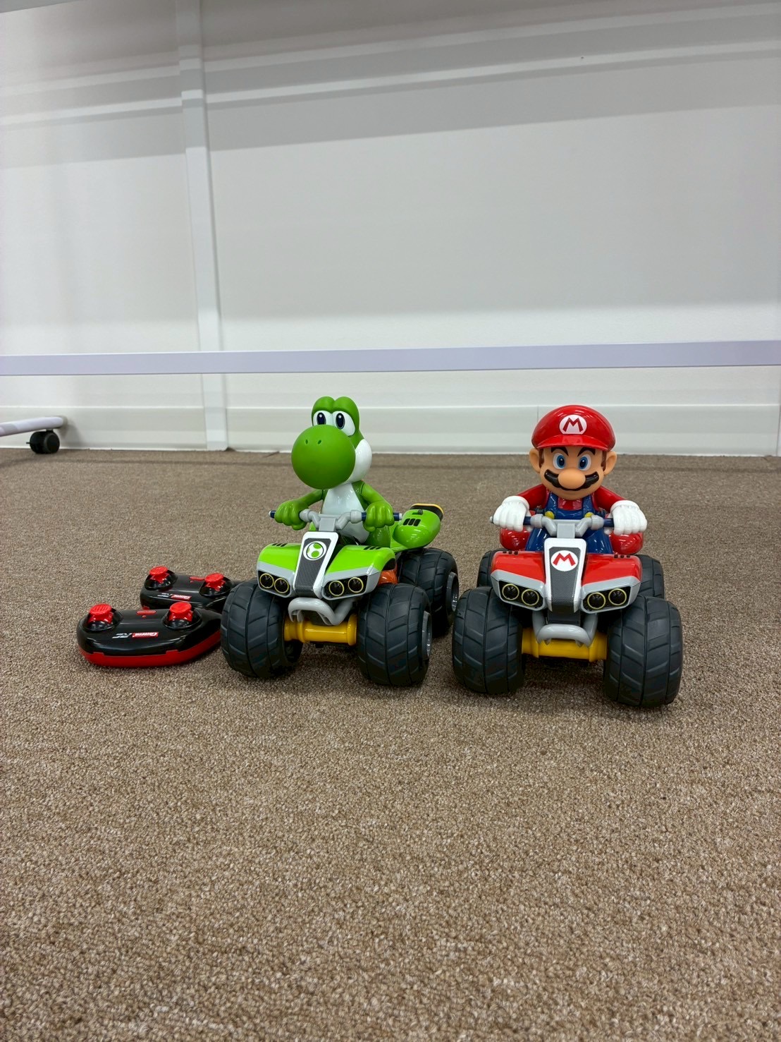最近事業所に仲間入りしたラジコンカーのマリオ号🔴とヨッシー号🟢でレース対決❗️を行いました😆🎶