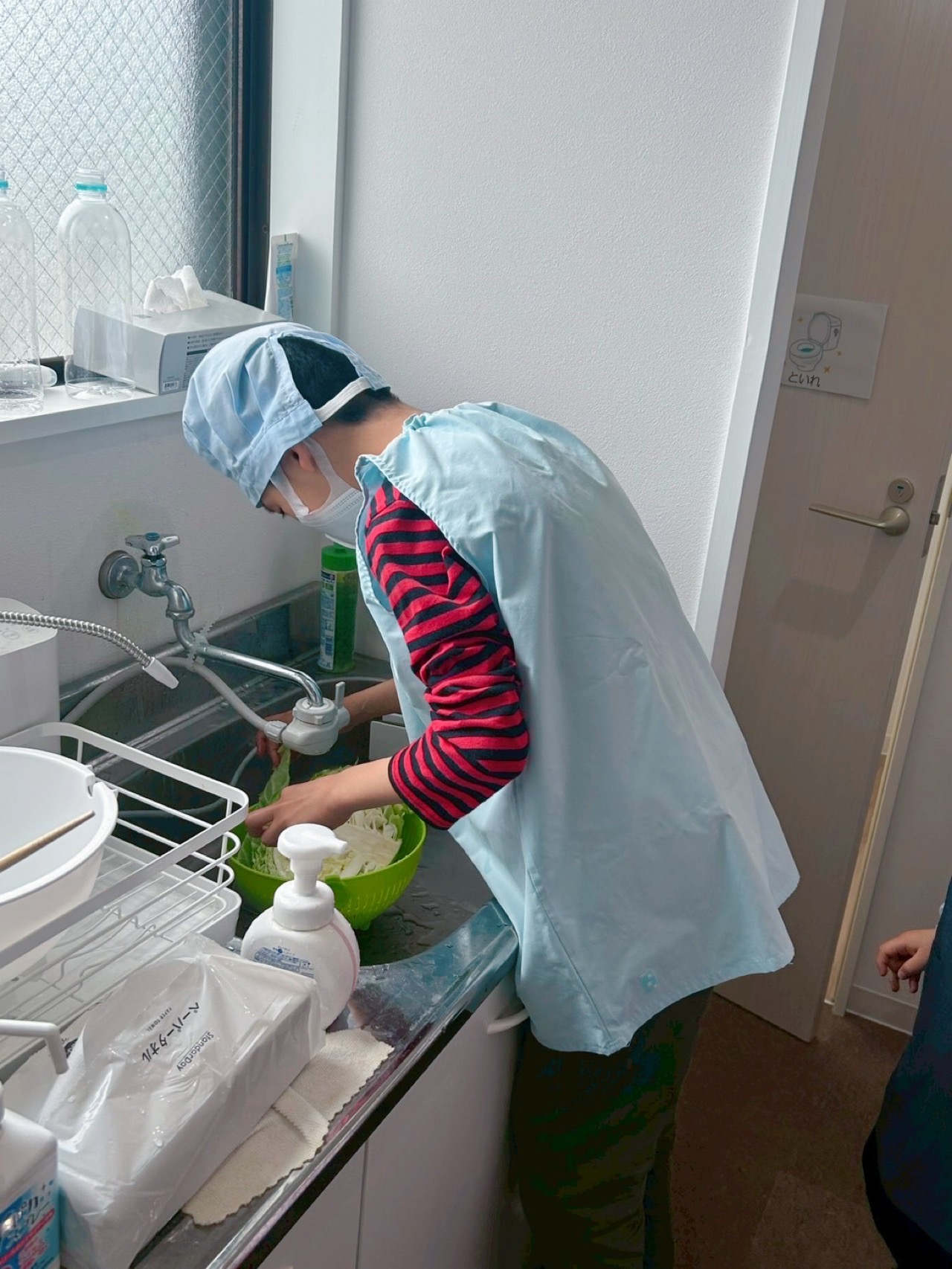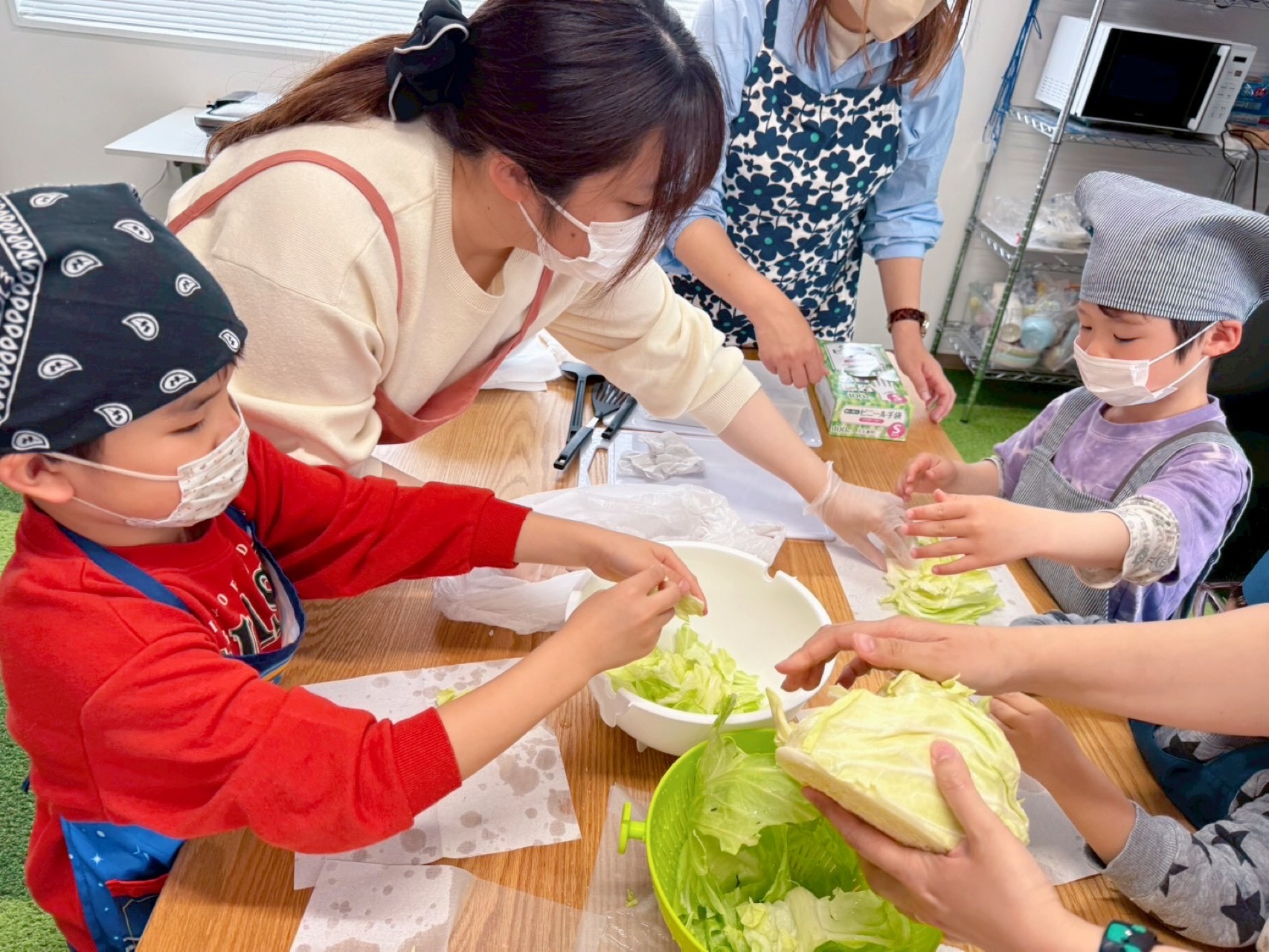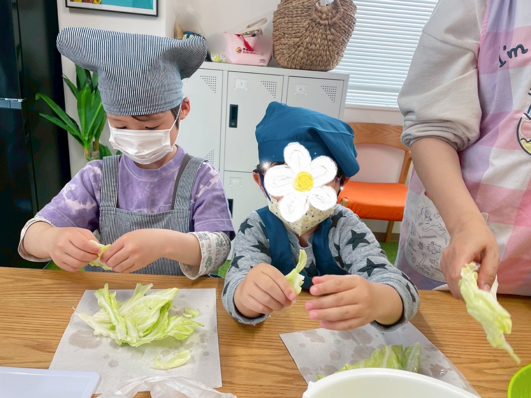 包丁を扱うのが苦手なお友達はキャベツを食べやすい大きさに千切る担当をしました✨