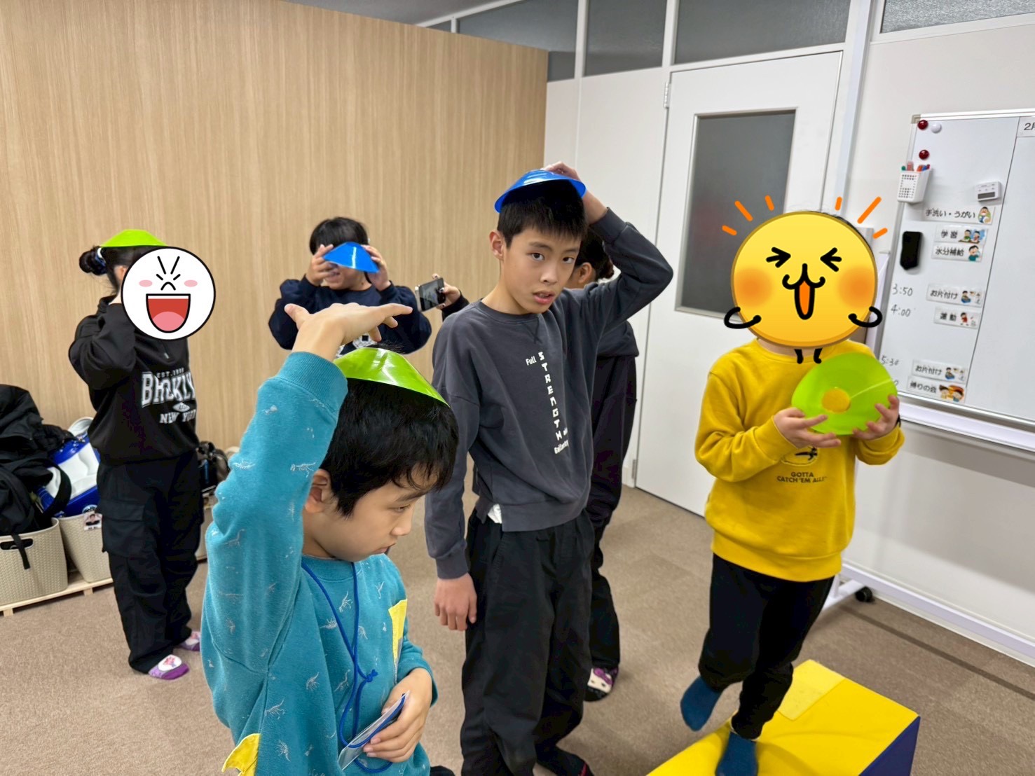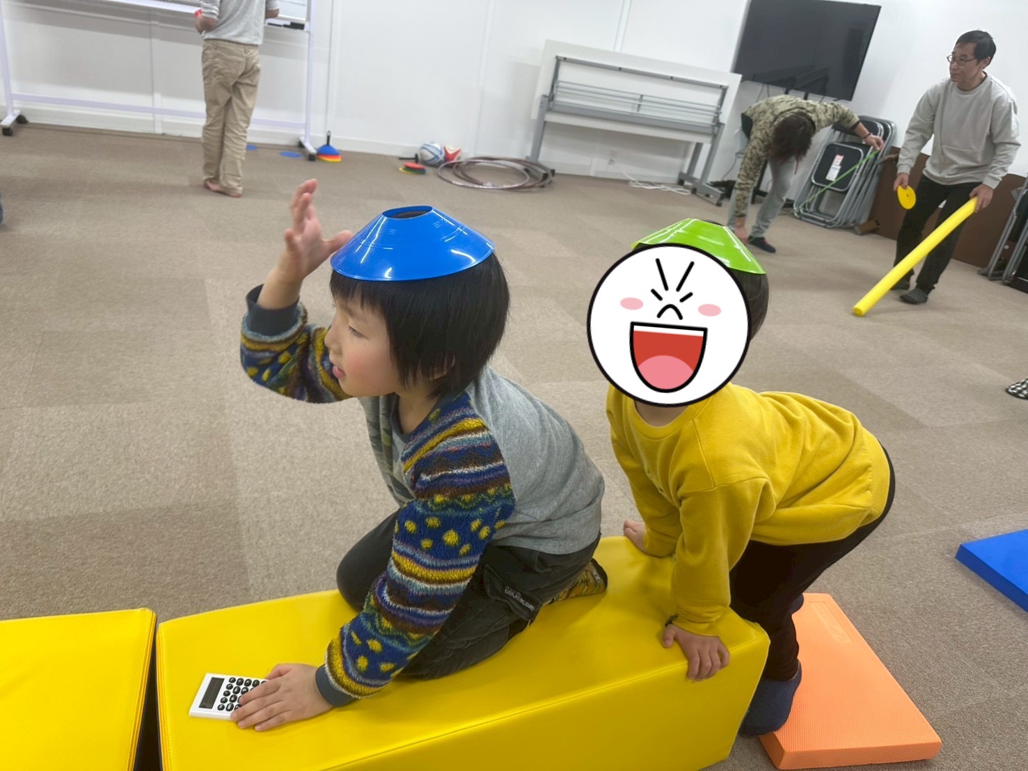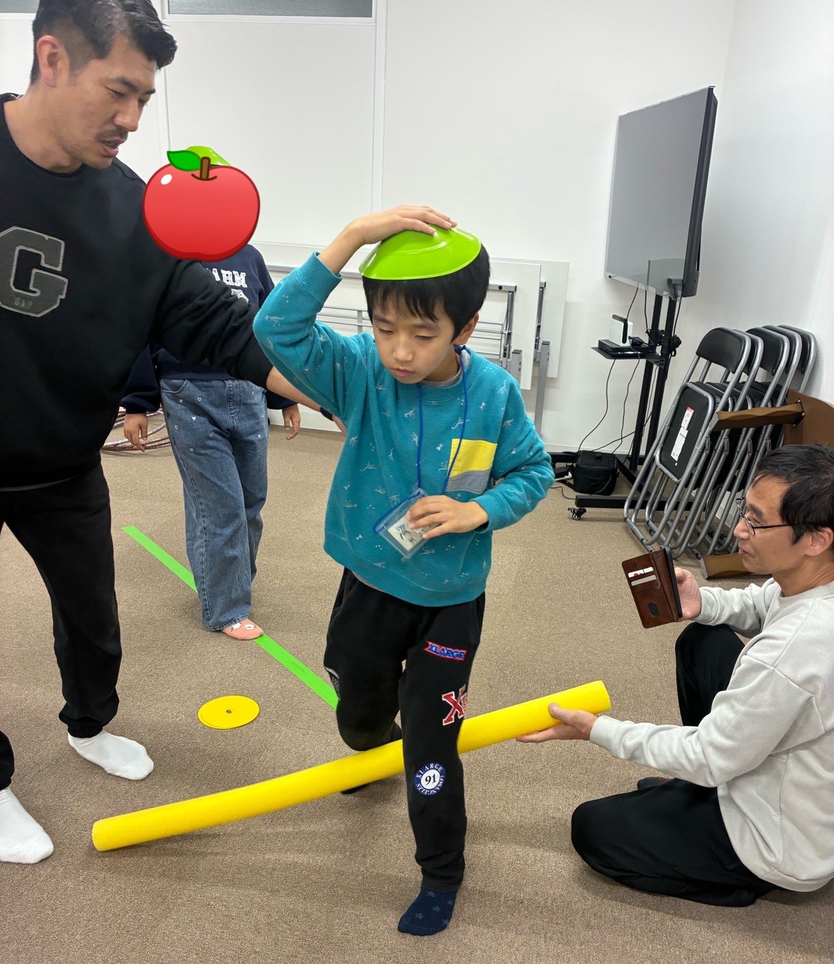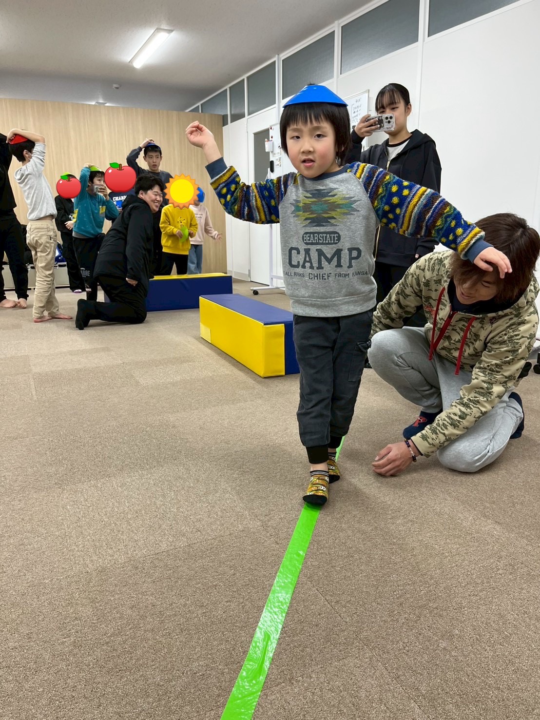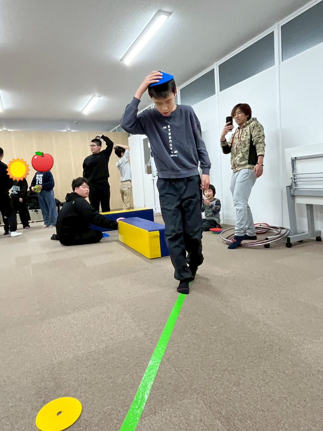 頭の上にカラーマーカーを乗せ、落とさないようにバランスを取りながら障害物コースを進みます。