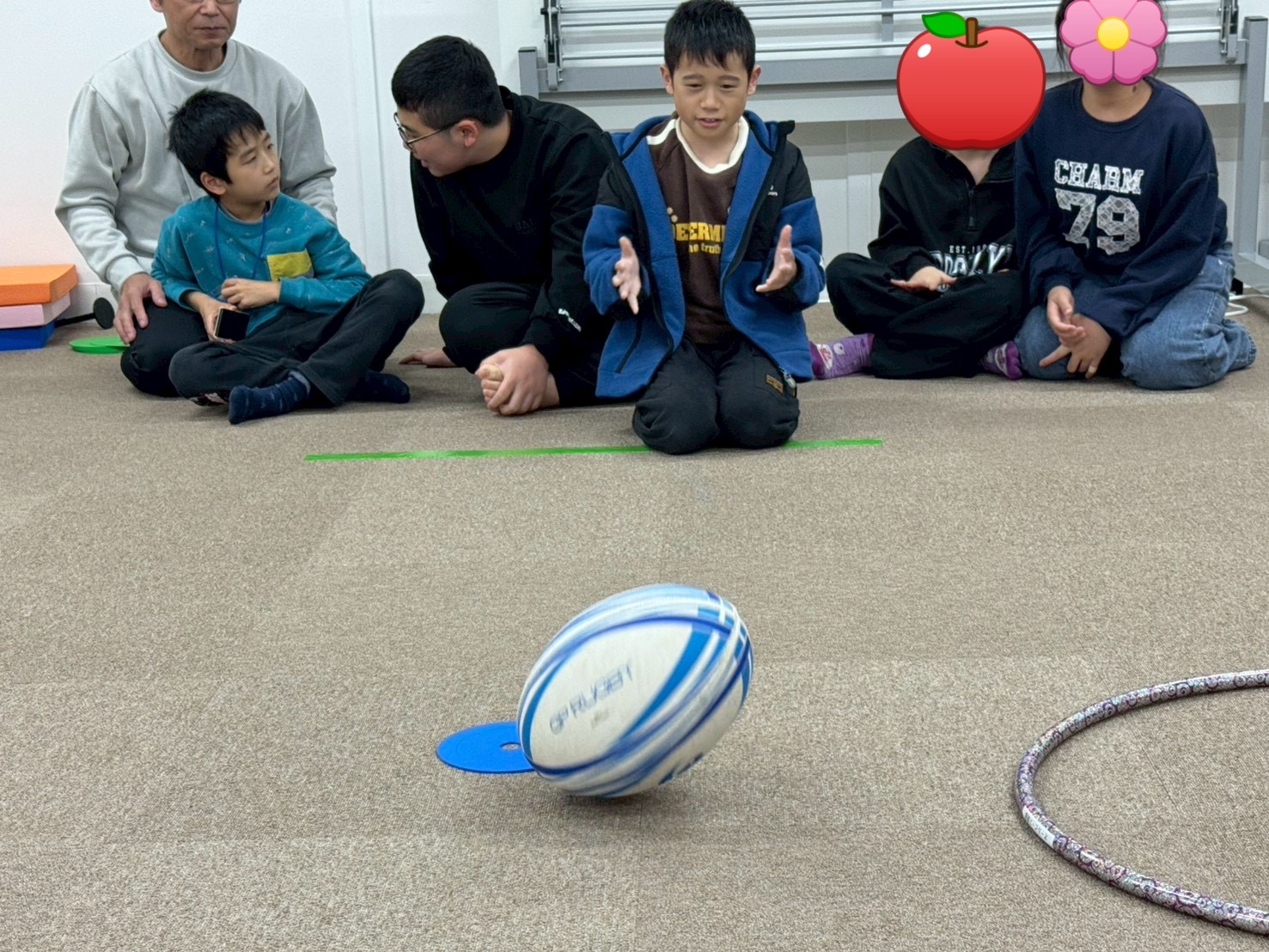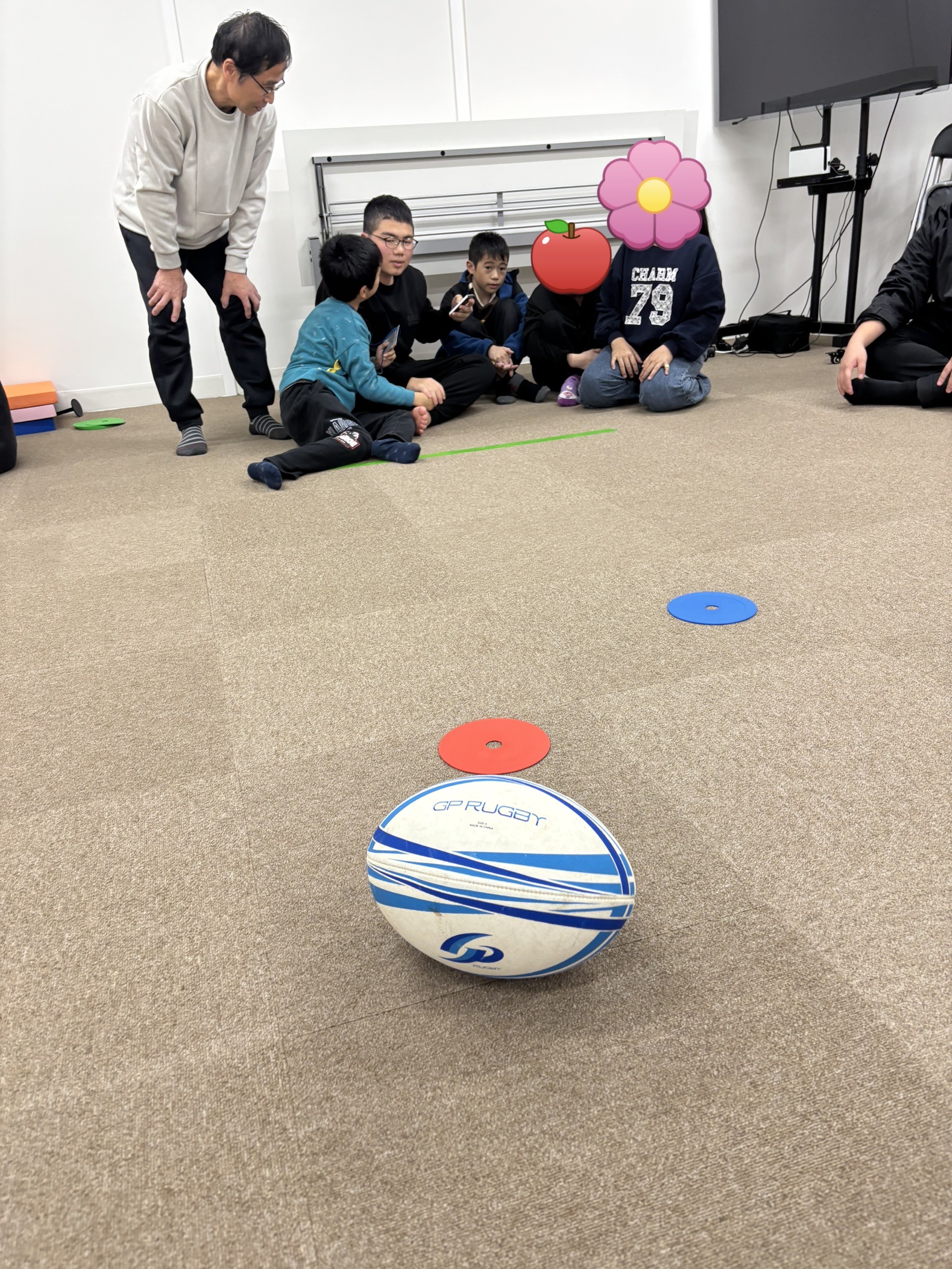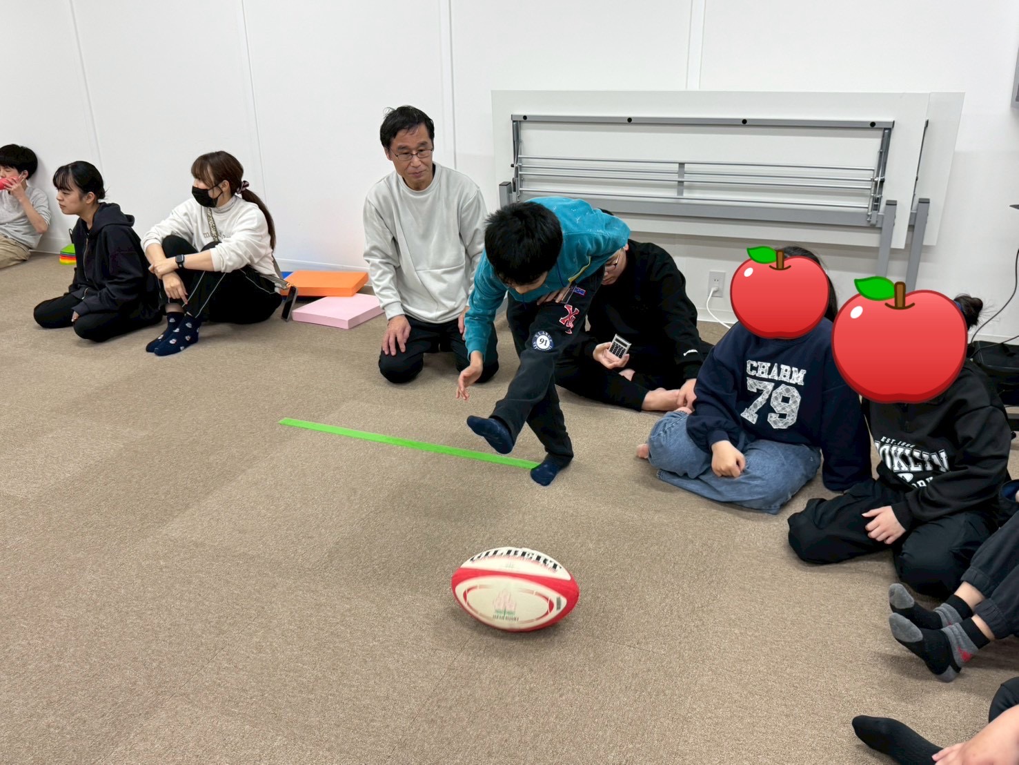 を配置し、立ち位置からラグビーボールを転がして止まった場所で得点が決まります🚩