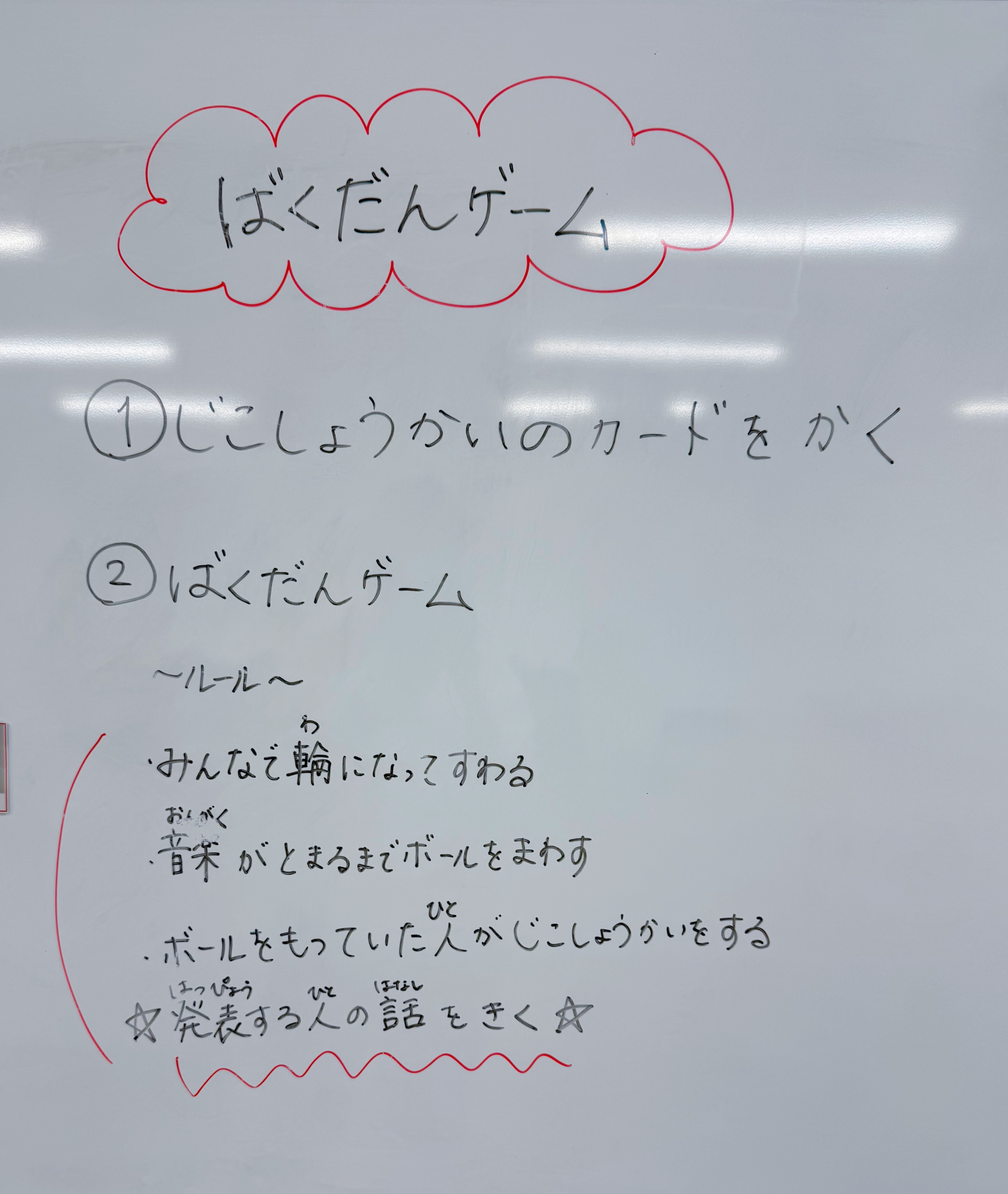 ✅音楽が止まった時にボールを持っている人がみんなの前で自己紹介発表をする
