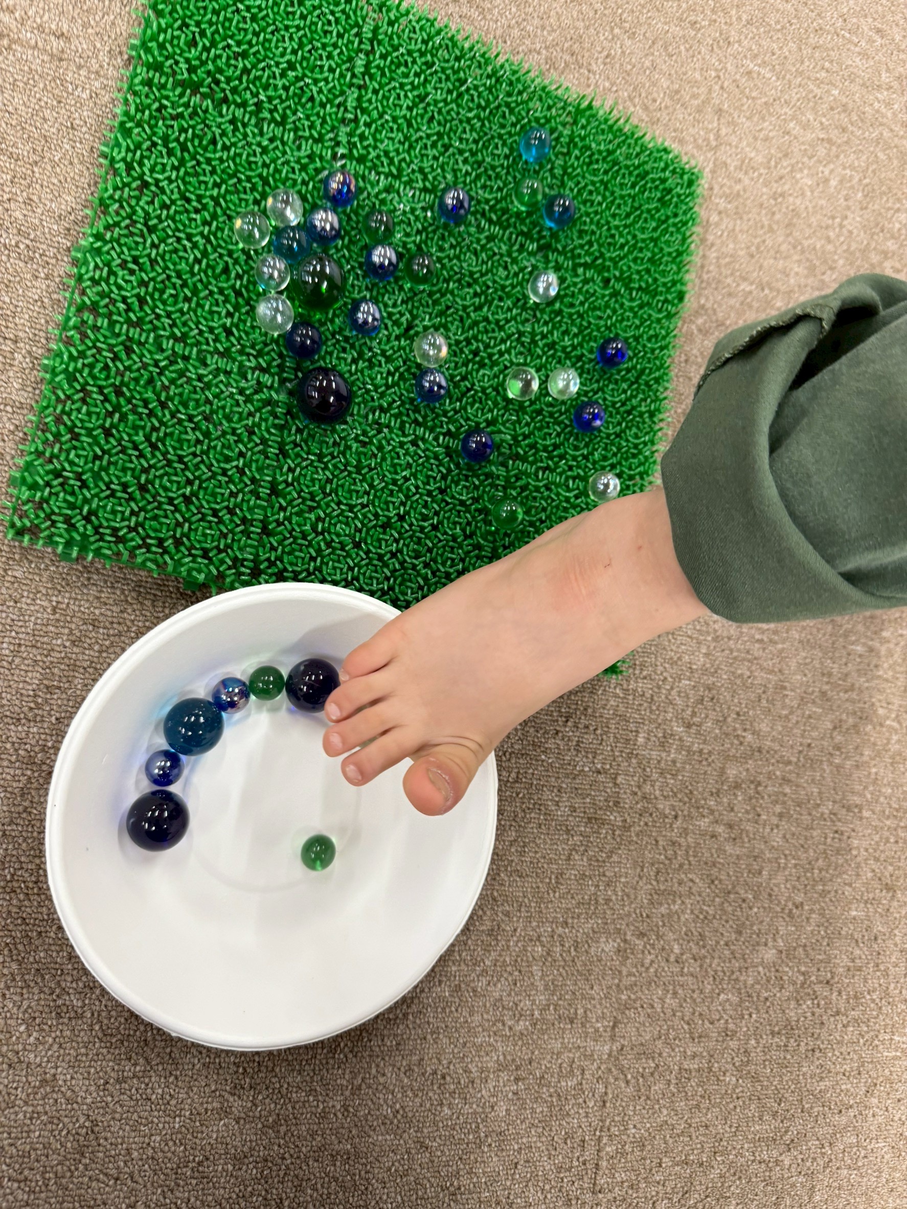 人工芝のマットの上に置かれたビー玉を、足の指でつかみ、紙皿へ移していきます。