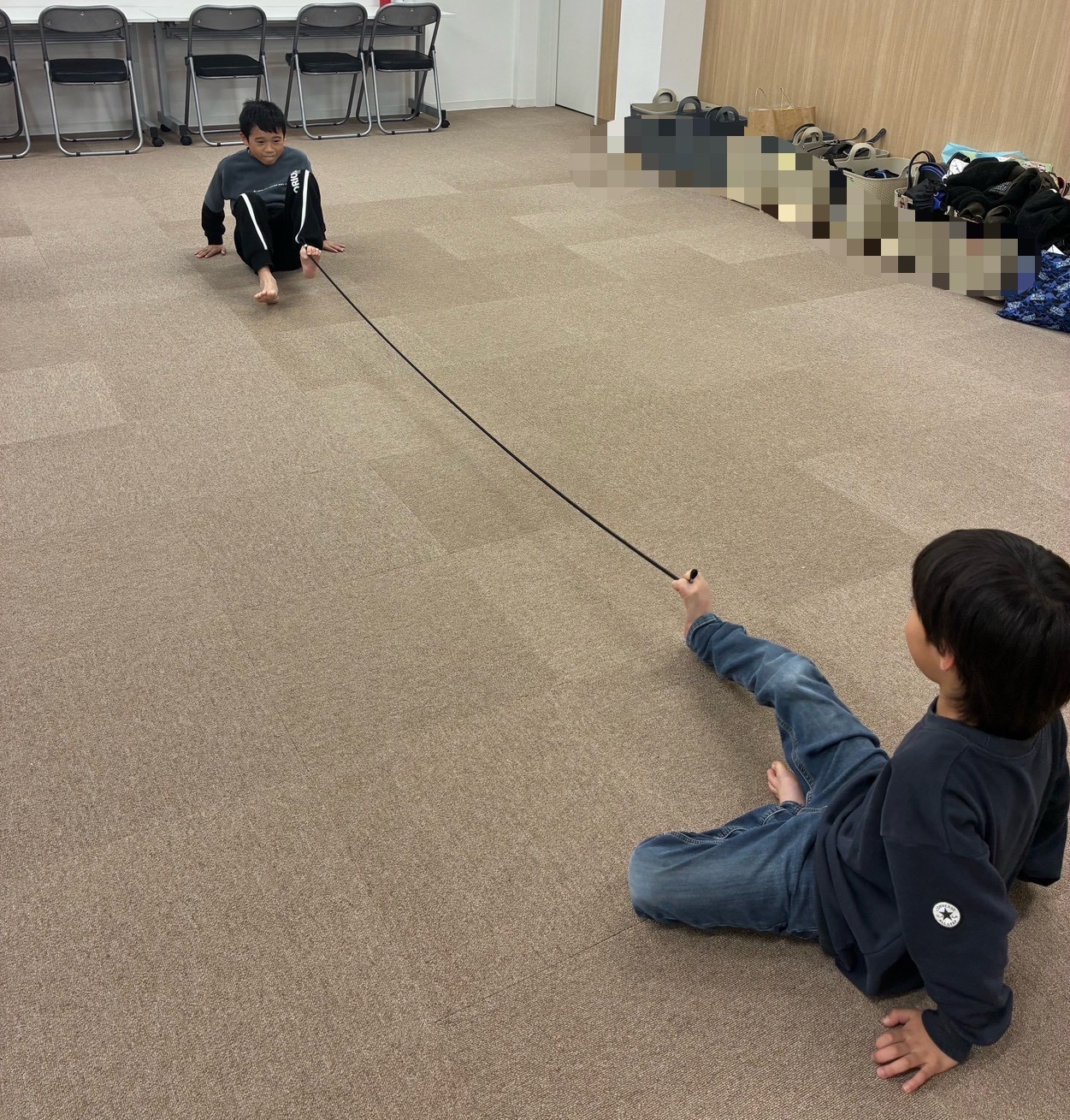 足の指でロープをつかみ、引っ張り合うシンプルなルールですが、盛り上がりました😆
