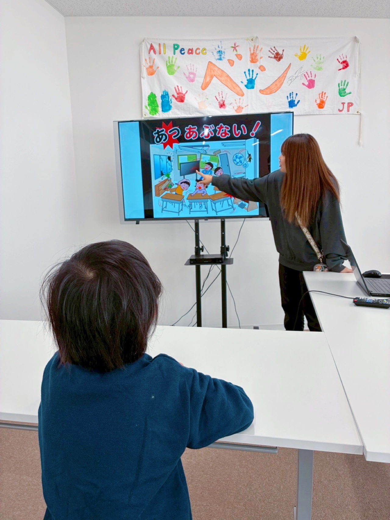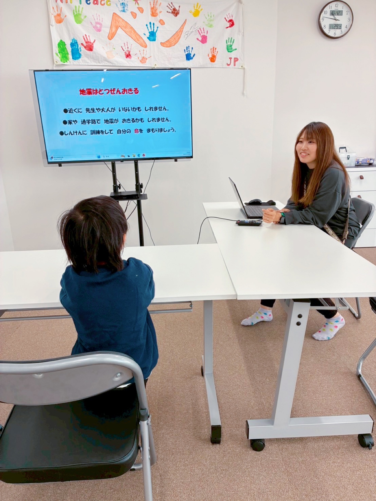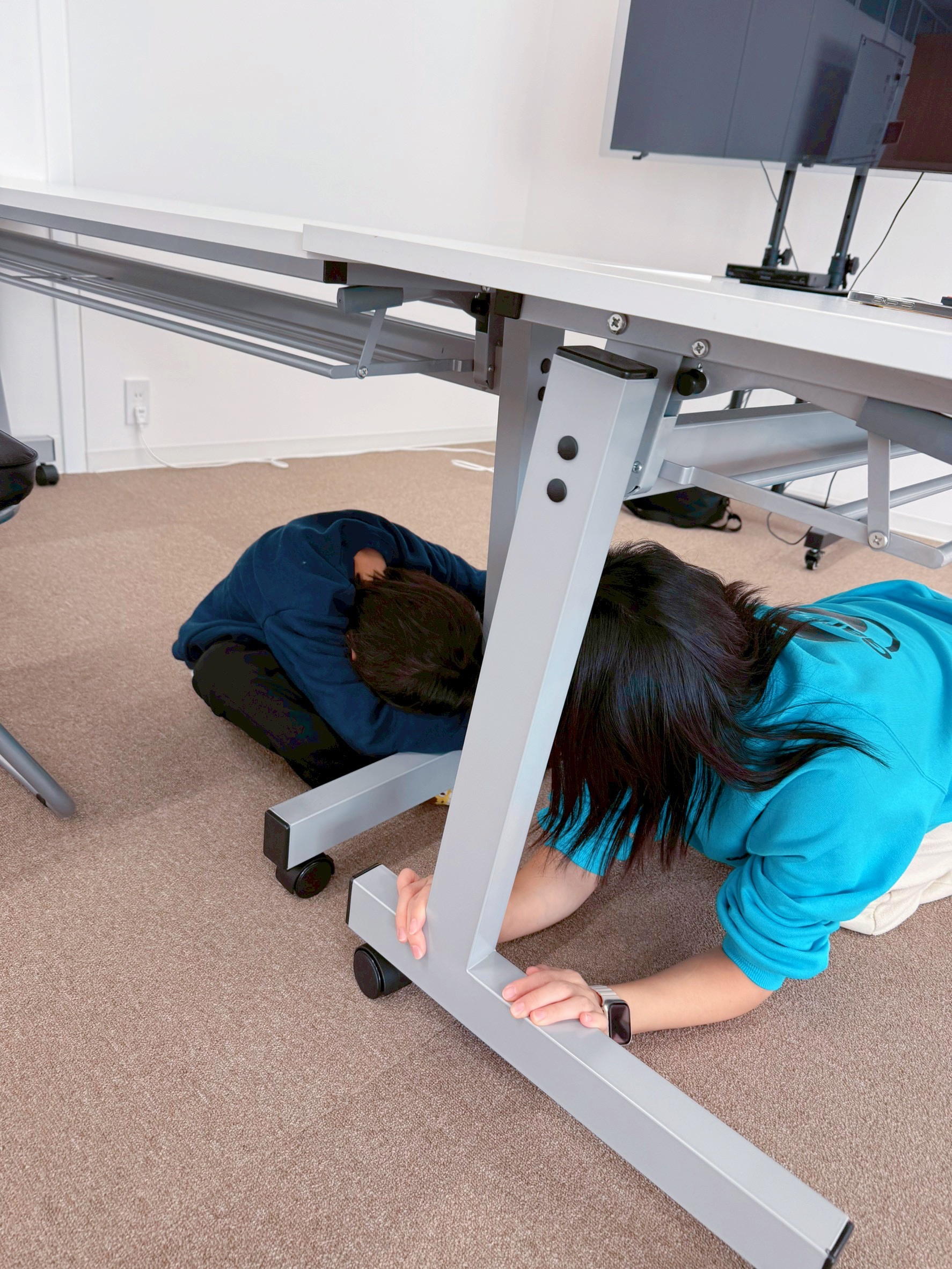 大きな揺れでは机が動いて倒れてしまう場面をYouTube動画で確認していたので、しっかり手と足で抑えながら身を守ることが出来ています✨