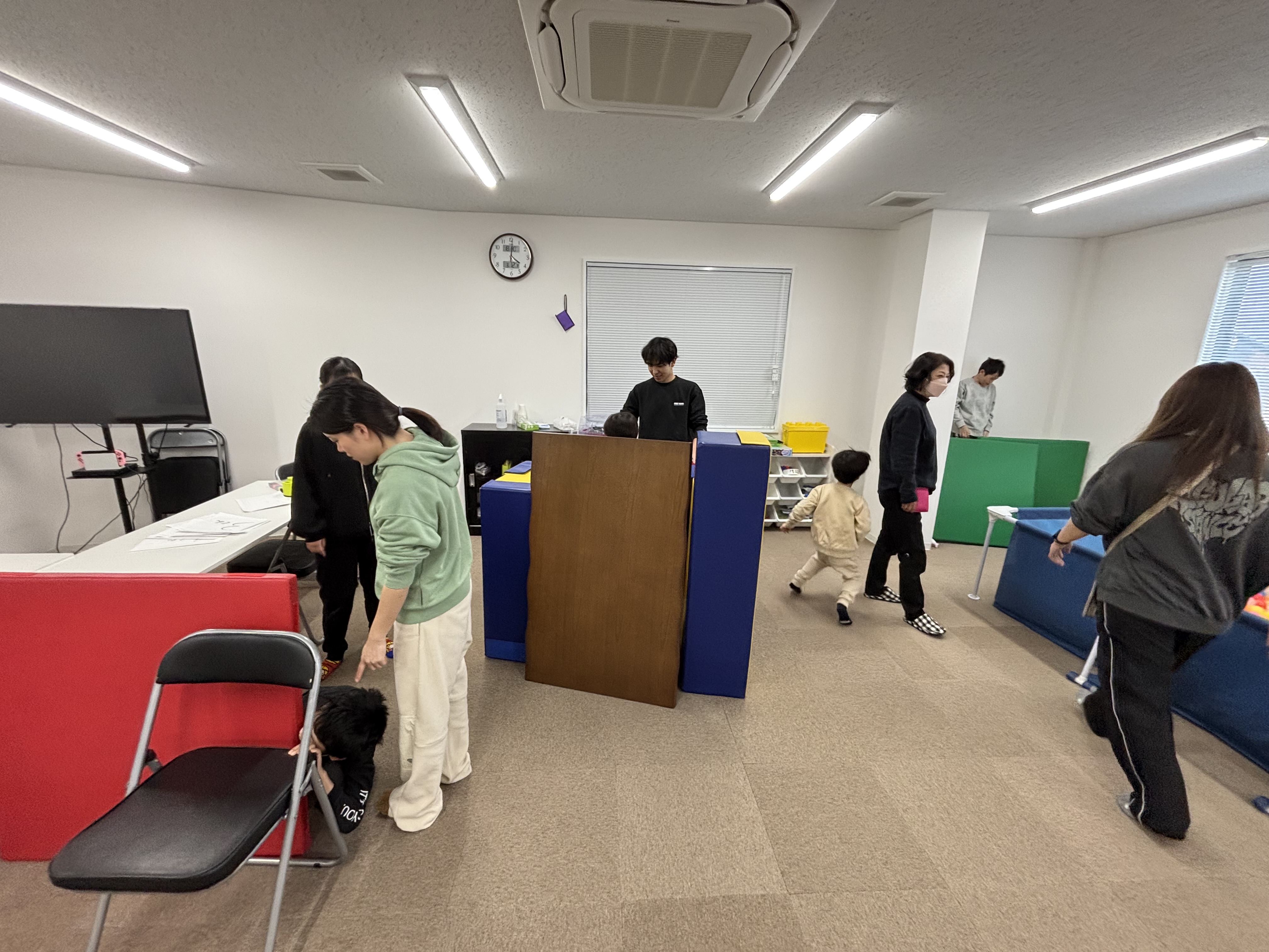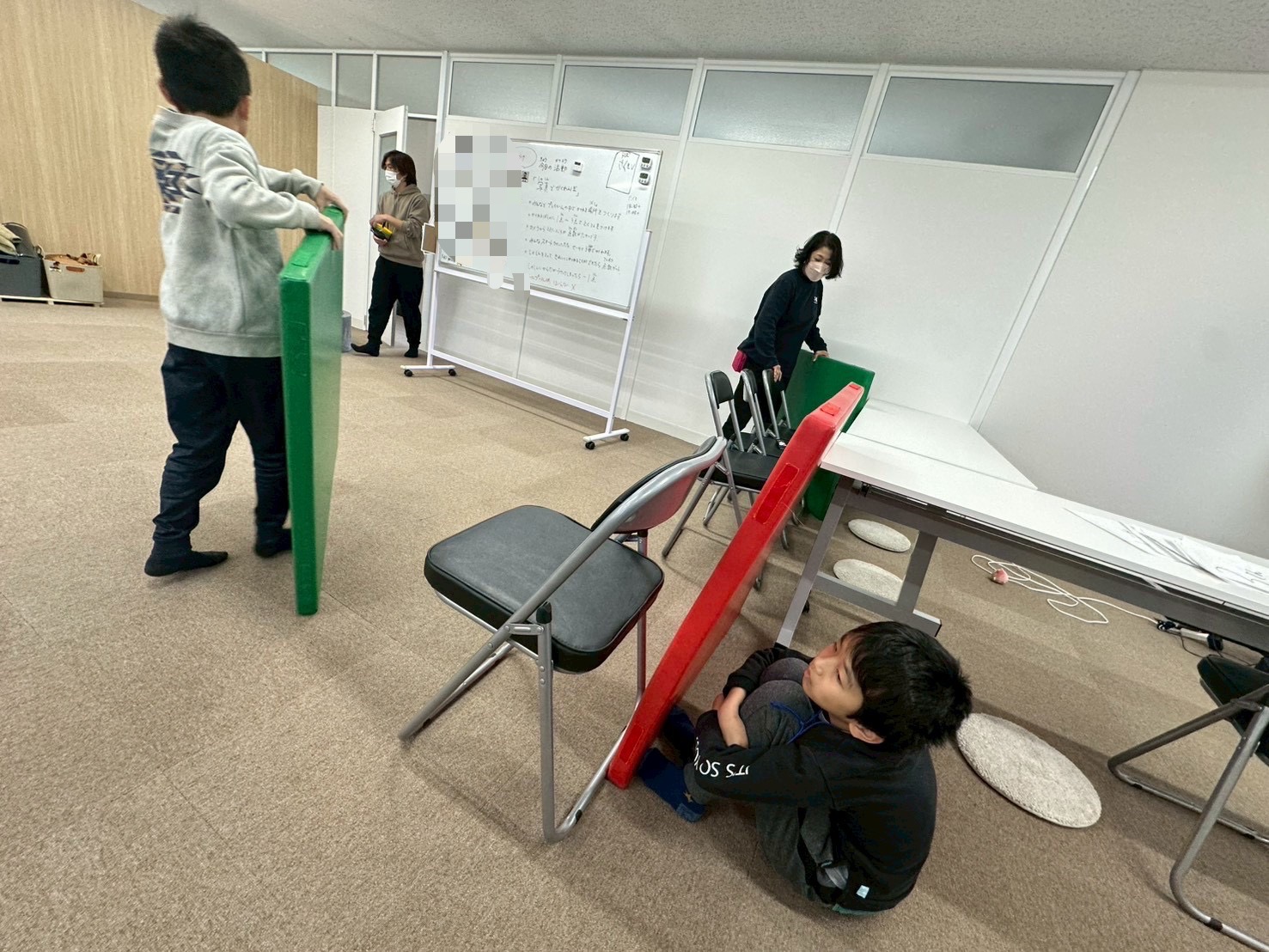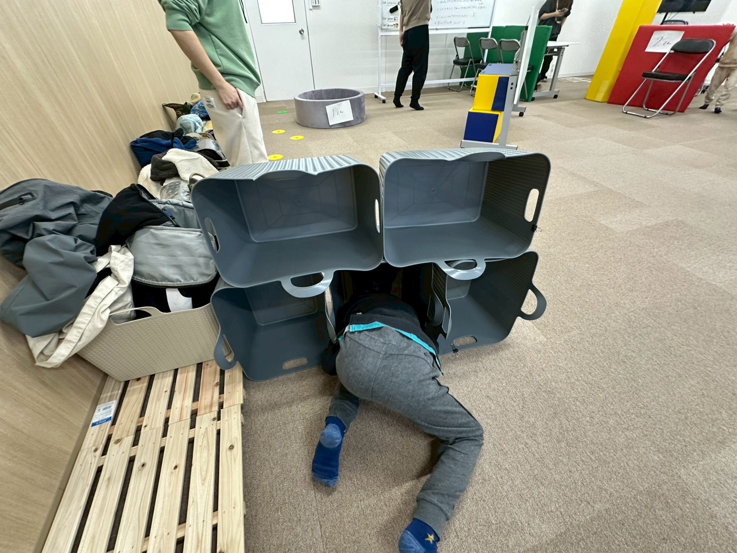 まず子どもたちは、プレイルームにある ブロック・クッション・テーブル・椅子 などを使って、隠れる場所を作ります。